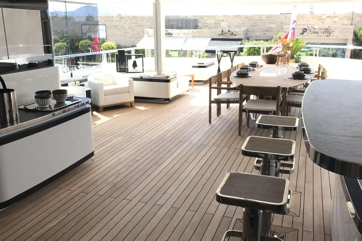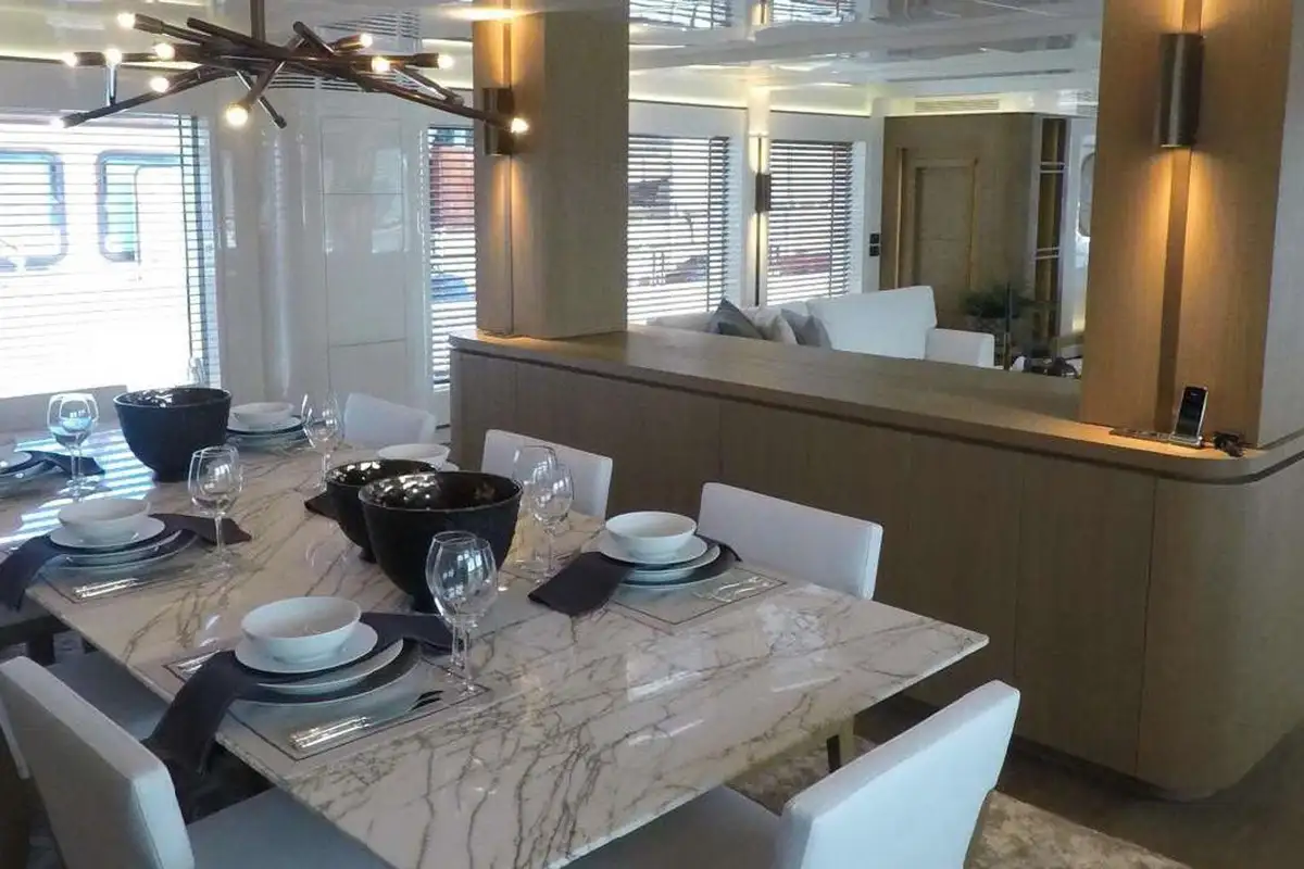 On the upper aft deck you will find an al fresco table and an informal breakfast. With space to sit all 12 of you, the conversation soon turns to the events of the day. The underwater SeaBobs with built-in cameras sound great fun, as do the jetskis. LIQUID SKY certified as an RYA watersports centre so you know that you are in safe hands.