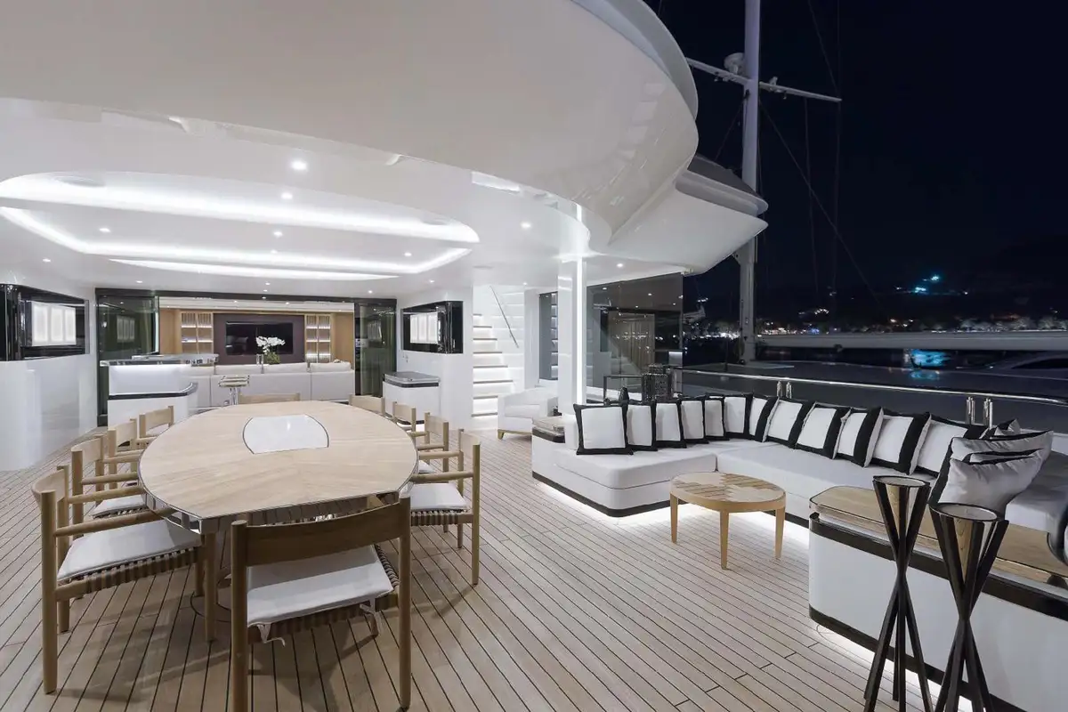 Tonight your quayside party is the talk of the town as the captain and crew manoeuvre the yacht into position. Aboard LIQUID SKY you can host up to 120 guests on the upper three decks for the event of the season. The nine permanent crew have it all in hand as the extra staff come aboard, now it’s just for you to put on your finery.