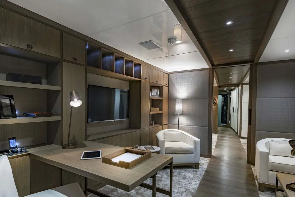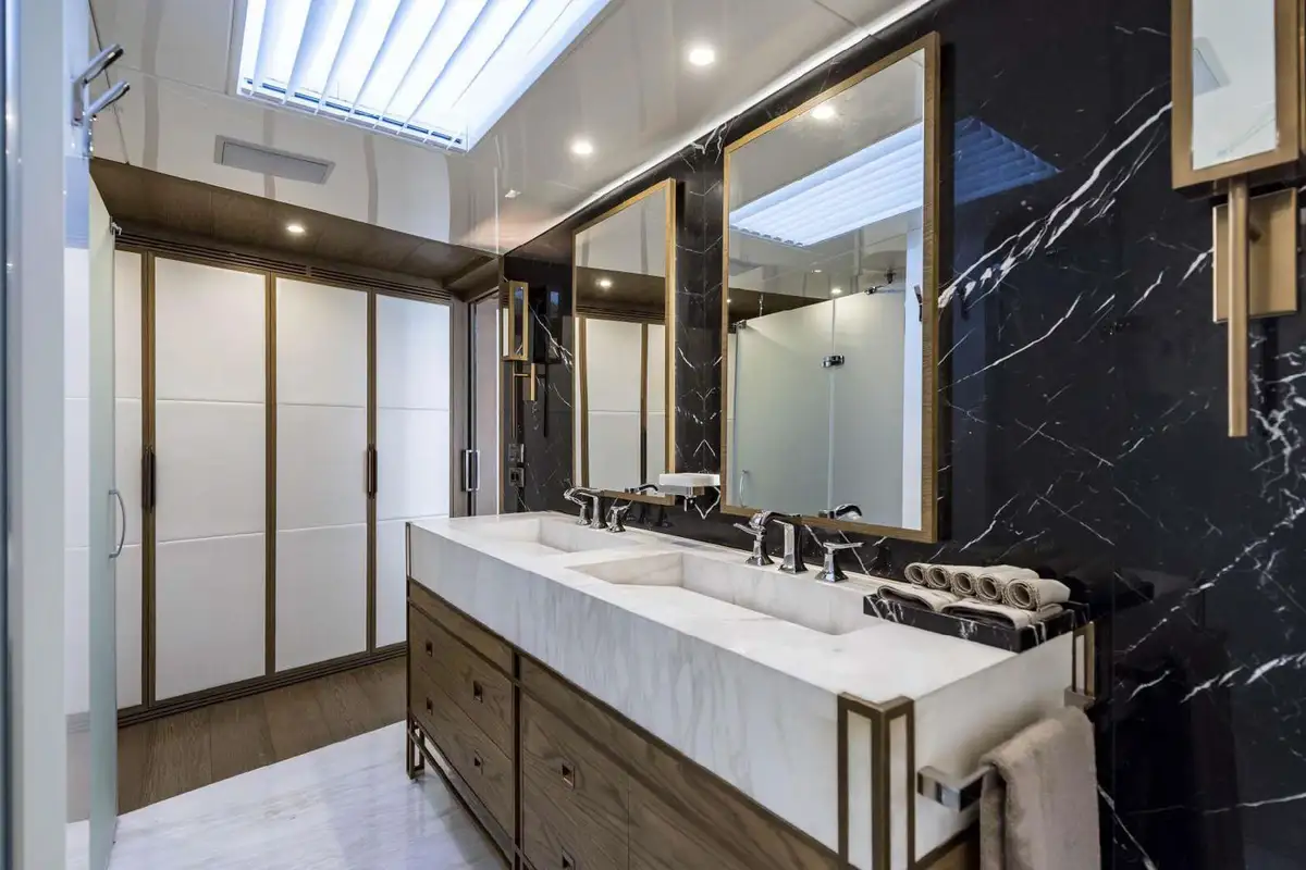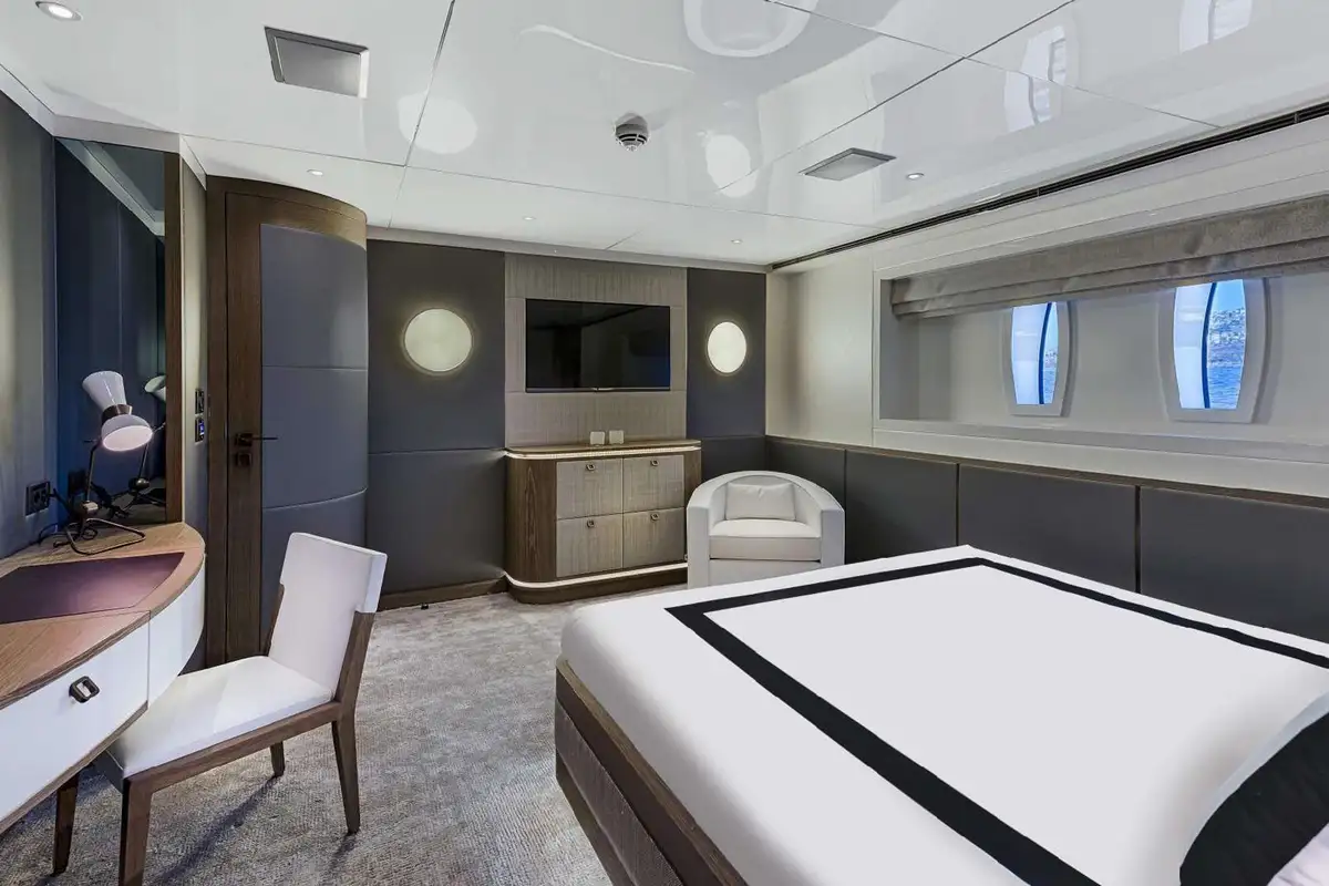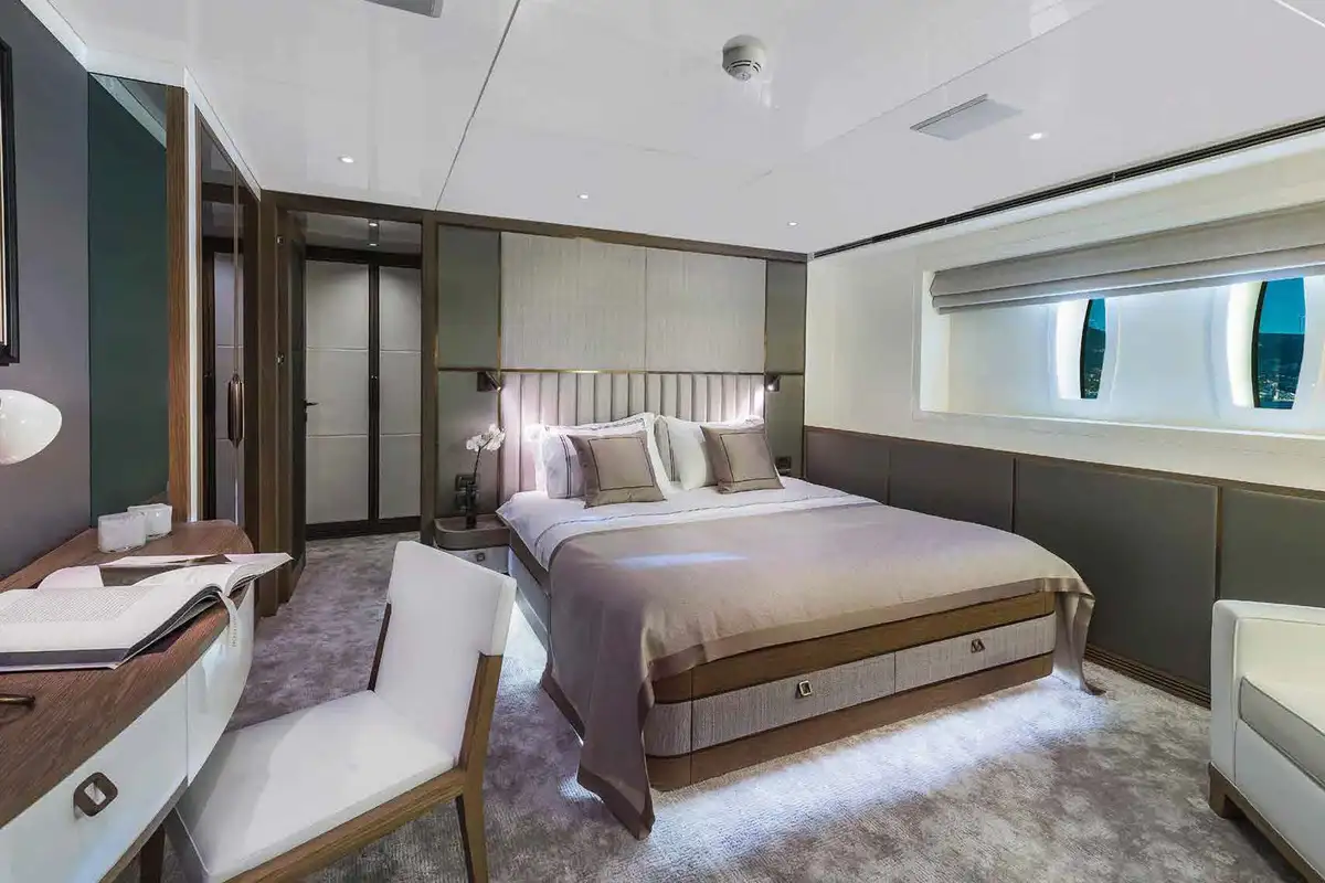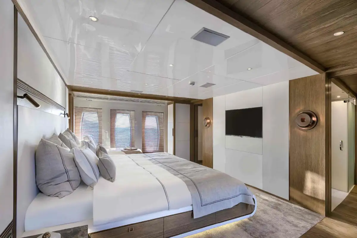 Wake up in the linen sheets of your king sized bed feeling truly at peace. Tall windows on both sides of your main deck cabin reveal glimpses of the waves glistening through the shutters. When you are ready, your feet sink into the velvet carpets as you pad to your private dressing room en suite to find something chic and simple to slip on for breakfast.