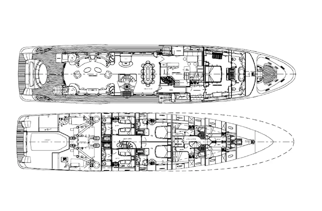 Step aboard LOULOU’s exterior decks and be greeted by expansive sunbathing zones adorned with plush loungers and cosy daybeds. The main deck features an intimate seating area overlooking the water and is the perfect place to start your morning. The upper deck aft, showcases an al fresco dining table under the sunshade, where guests may delight in gourmet meals against the ever-changing backdrop of the open sea. A stunning sun deck completes the outdoor ambience, boasting a wet bar, bar stools and a jacuzzi that invites you to unwind beneath the azure skies.