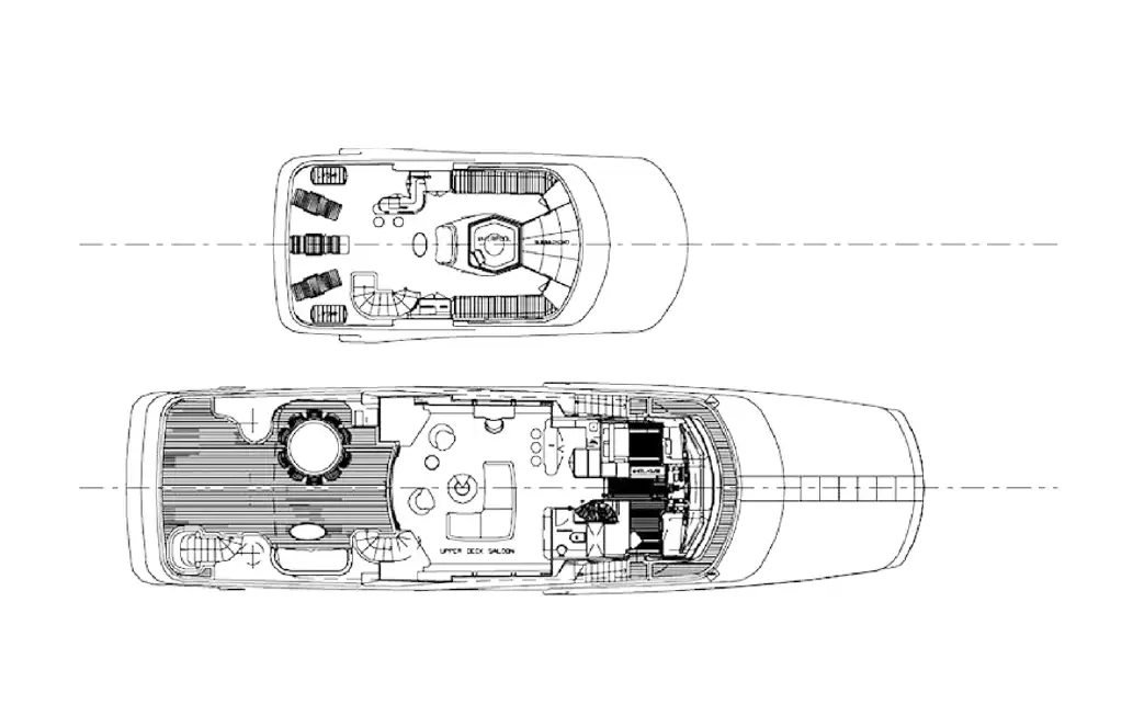 - Full-beam main deck master cabin with en suite and walk-in wardrobe
