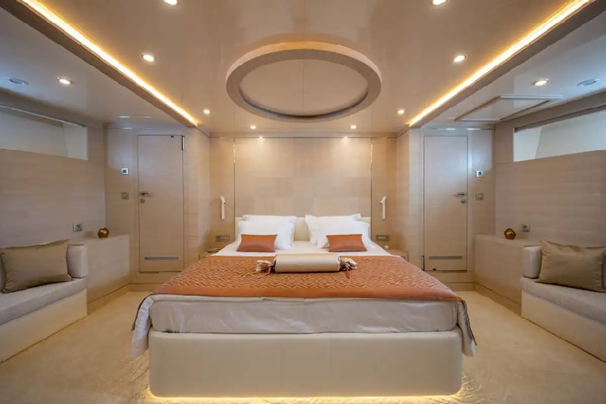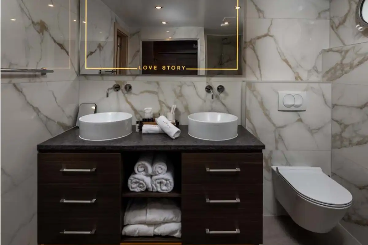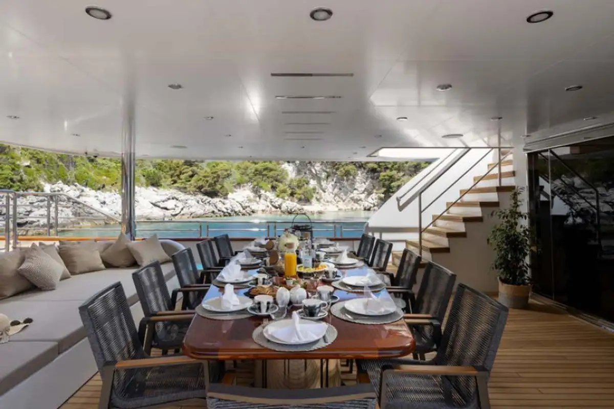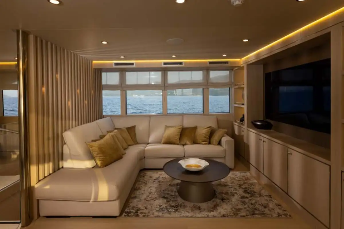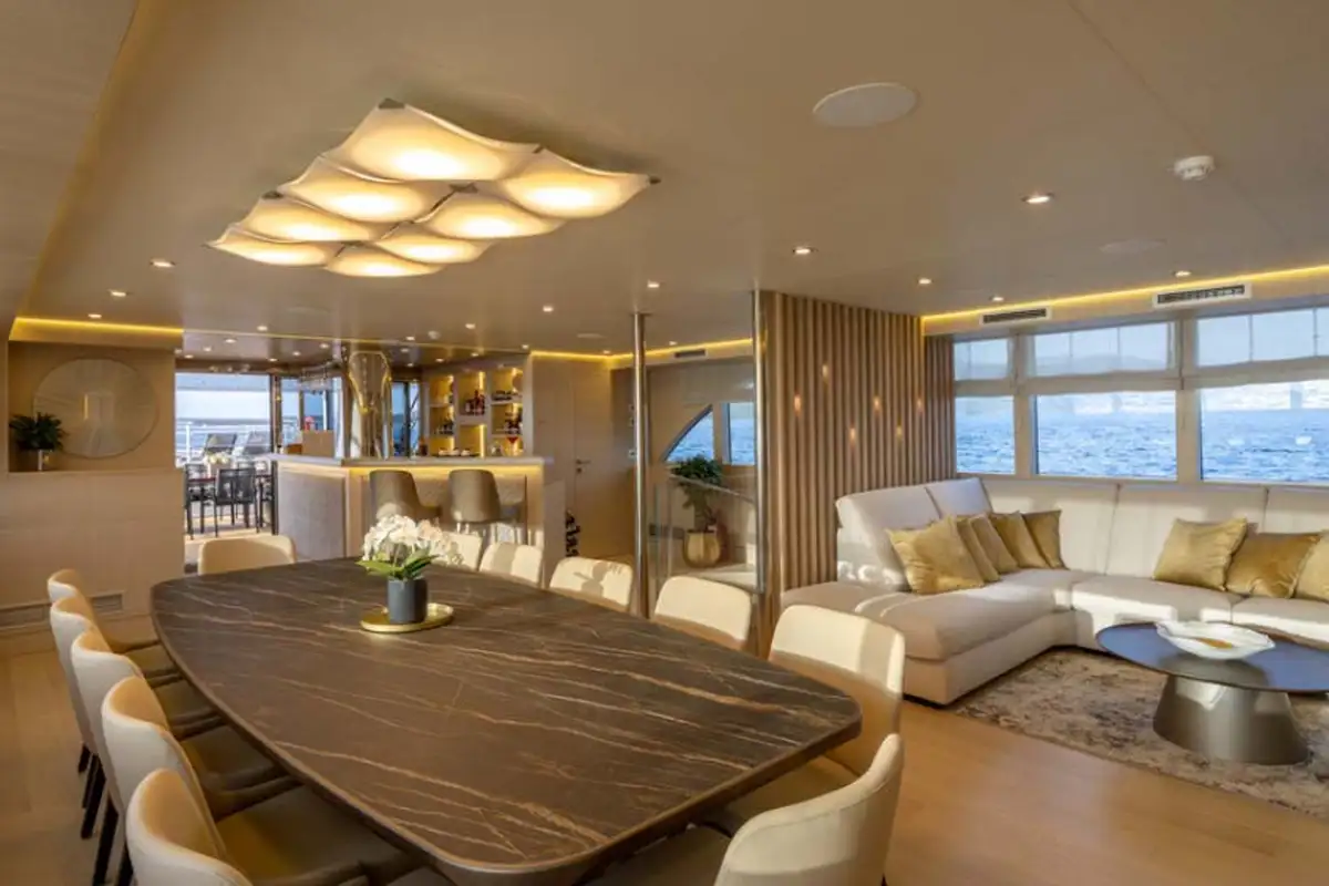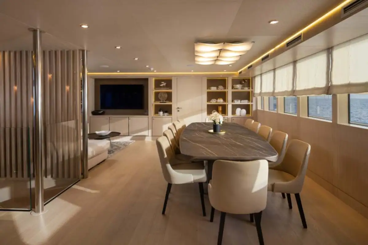 A key feature of her guest accommodation is that she has two almost identical master suites, both with sofas, desks and king size beds, so she’s an ideal yacht for two families or couples sharing a charter. Each of the masters has a full marble en suite bathroom. The other guest cabins are two queen size doubles and two twins, all of which have private en suite bathrooms, TVs and wi-fi.