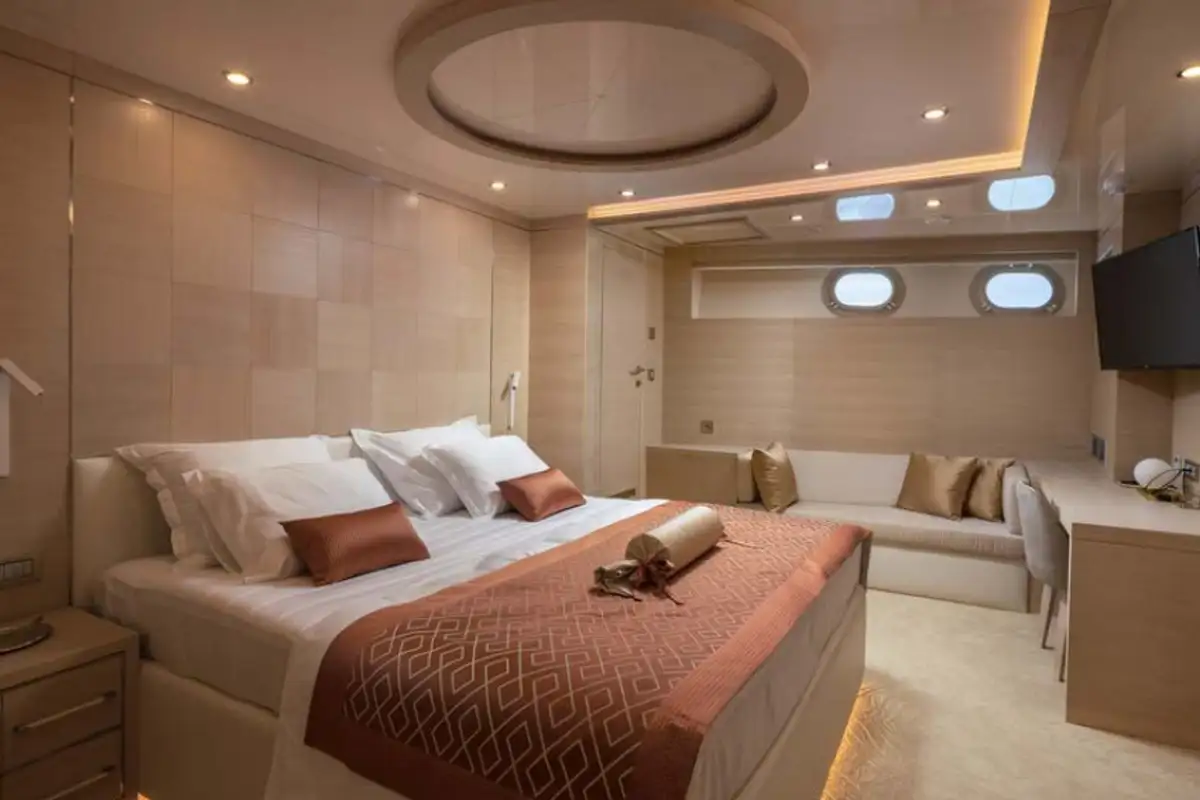 Most of the main deck’s interior is a comfortable, contemporary styled lounge with a cocktail bar, a TV lounge and 12-seat dining table. Wherever you choose to sit, there are excellent sea views through big windows all round.