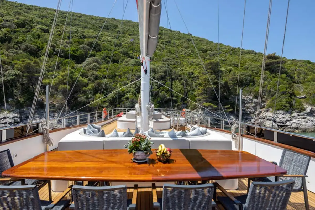 The outside guest areas on board include a spacious sundeck with lounge and dining areas plus a jacuzzi with a large expanse of sunpads – a rare feature to find on a sailing yacht – plus a foredeck lounge, an aft deck dedicated to sunbathing and a main deck passenger cockpit with day beds and a 12-seat dining table in ample shade. A broad bathing platform folds down from her stern with a freshwater shower and two swim ladders for easy access in and out of the sea.