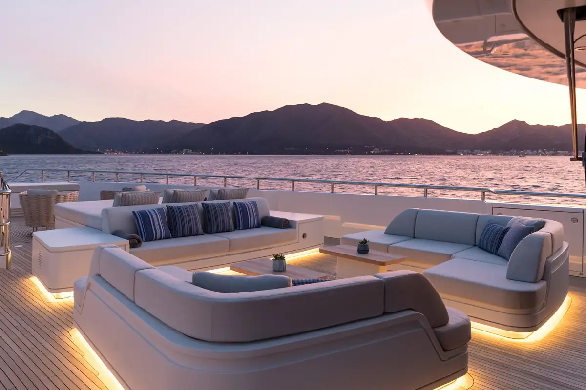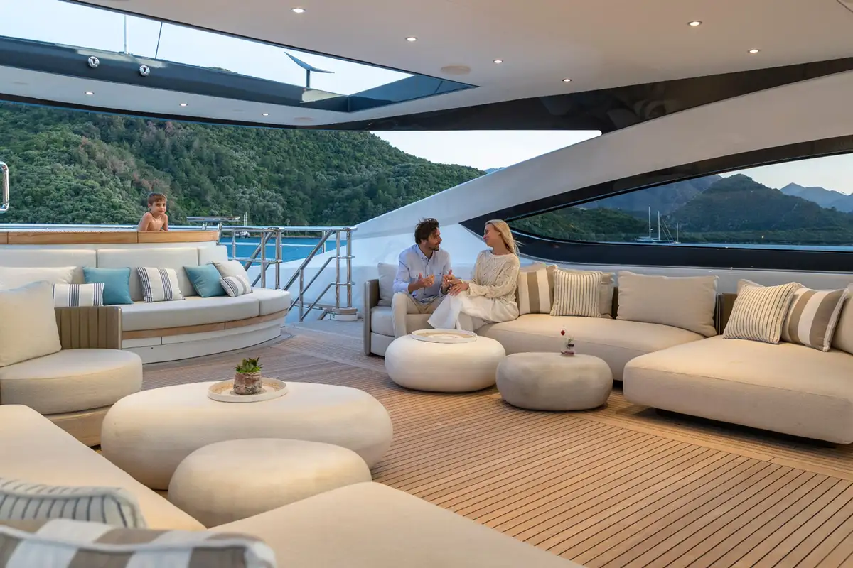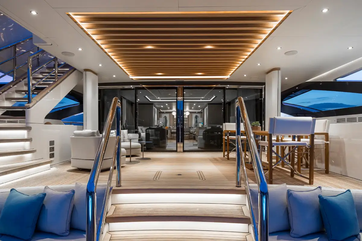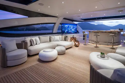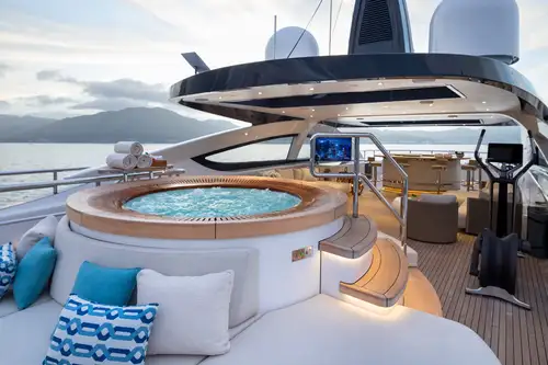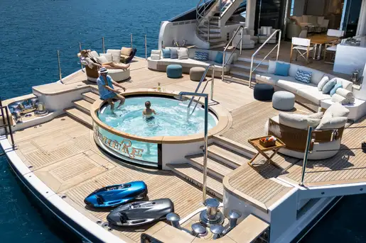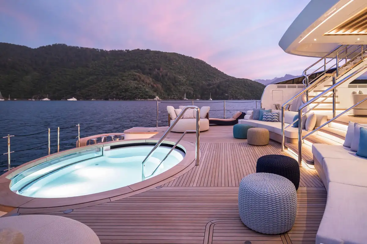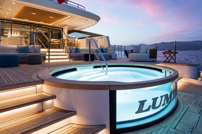 The main deck aft is without doubt the highlight on board LUMIERE, with a vast space designed to bring you as close to the water as possible. With fold-out side balconies on the aft platform, as well as a central circular jacuzzi flanked by sun loungers and seating areas, it's the perfect place to relax and enjoy the day, and an incredibly luxurious feature that is a rarity among her size range.