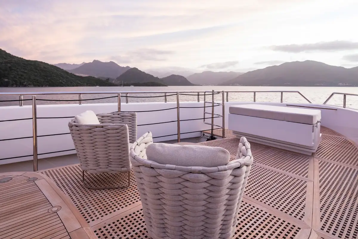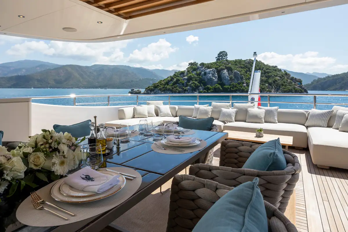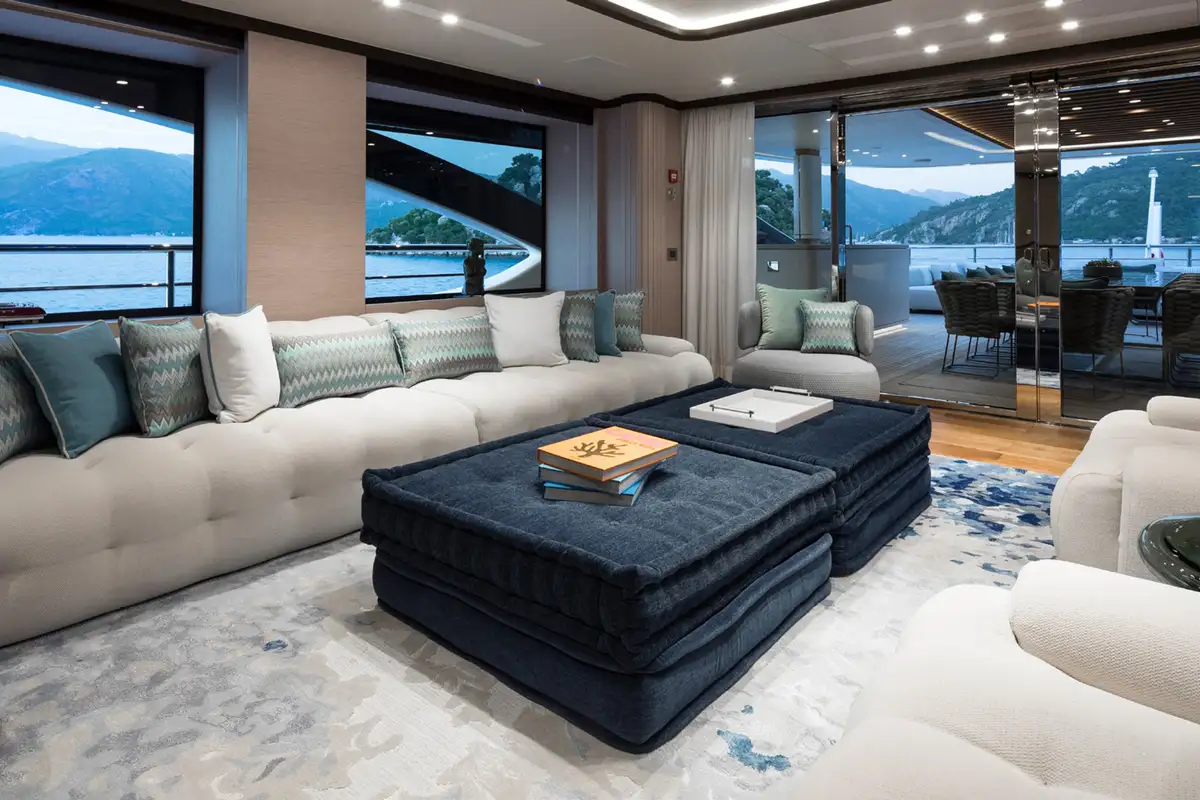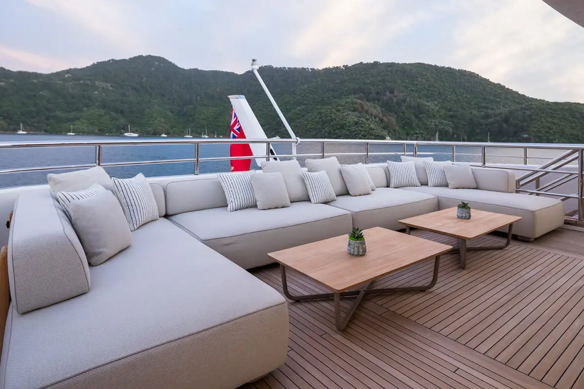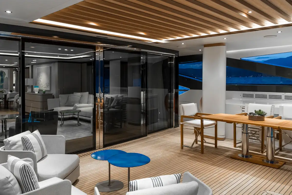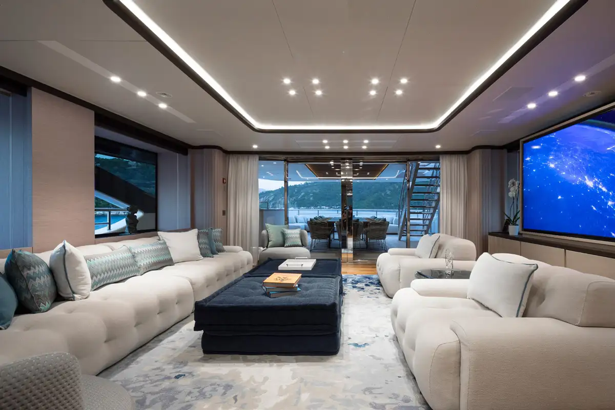 The main deck aft is without doubt the highlight on board LUMIERE, with a vast space designed to bring you as close to the water as possible. With fold-out side balconies on the aft platform, as well as a central circular jacuzzi flanked by sun loungers and seating areas, it's the perfect place to relax and enjoy the day, and an incredibly luxurious feature that is a rarity among her size range.