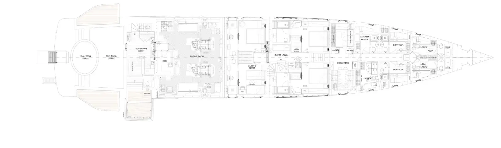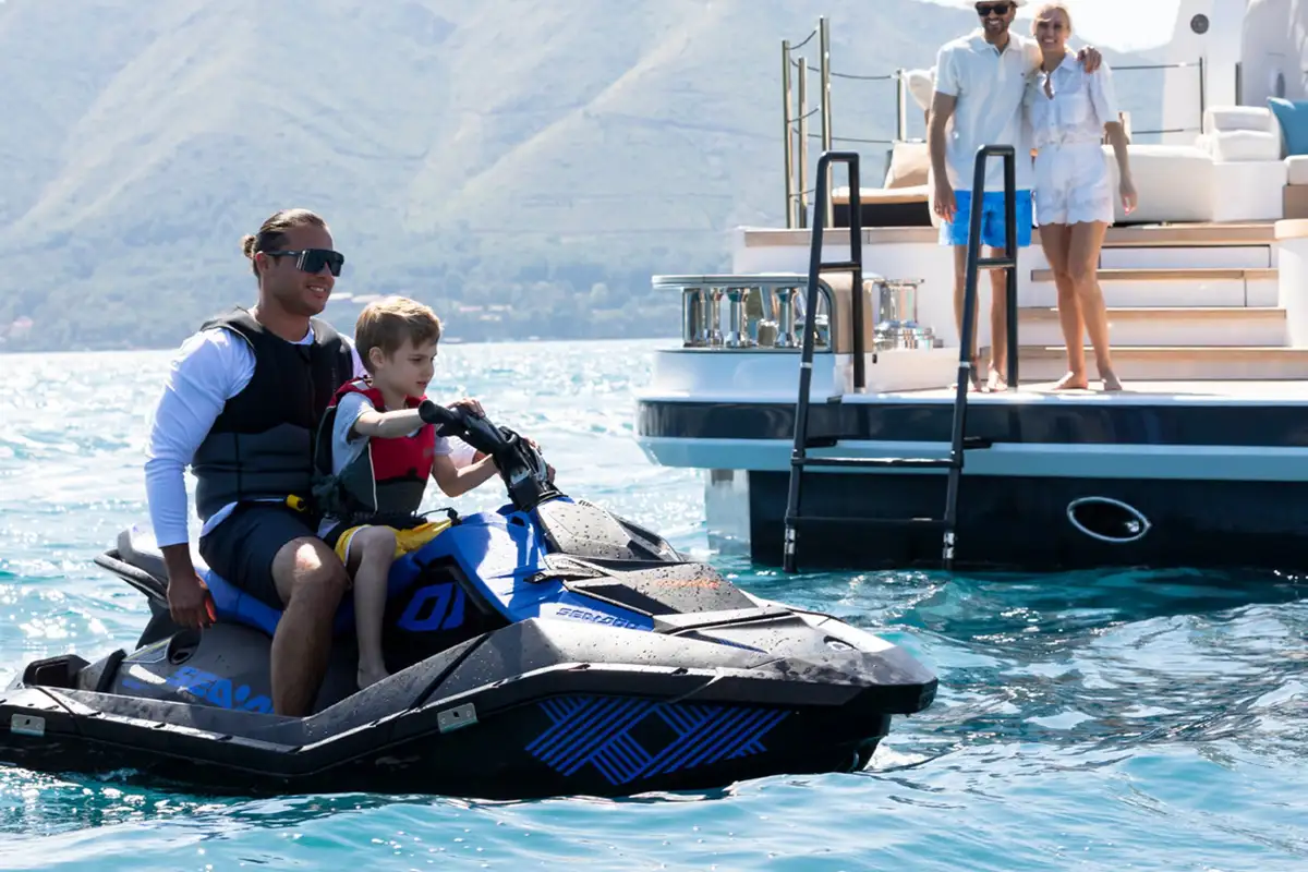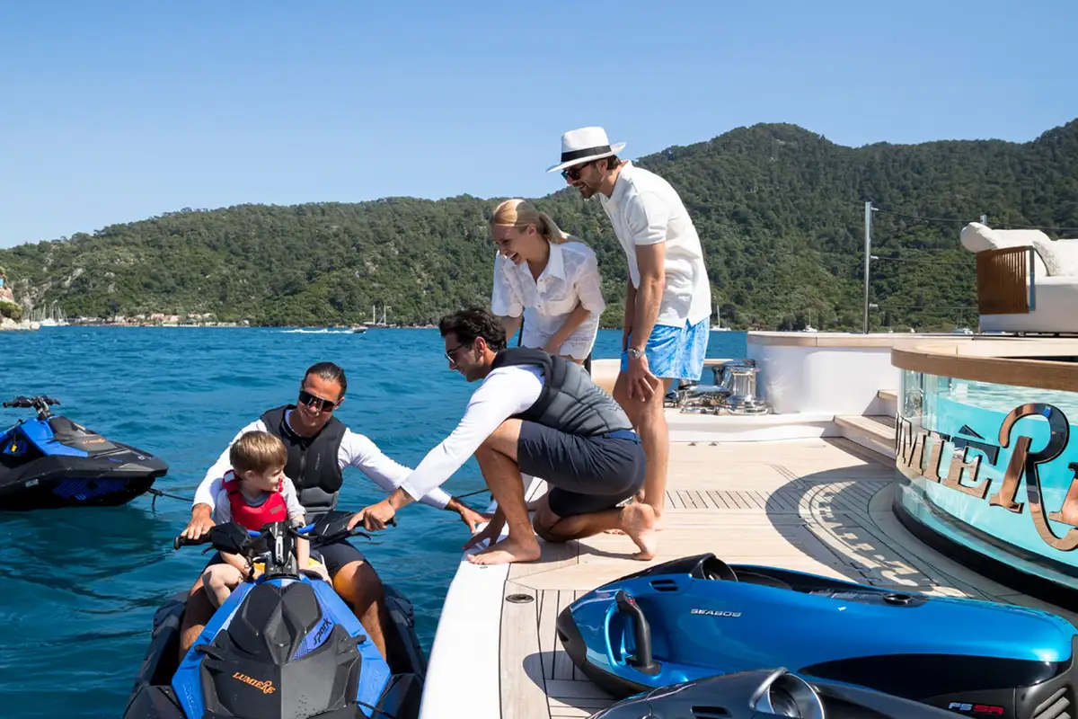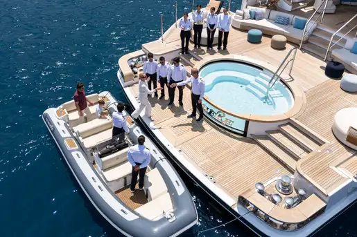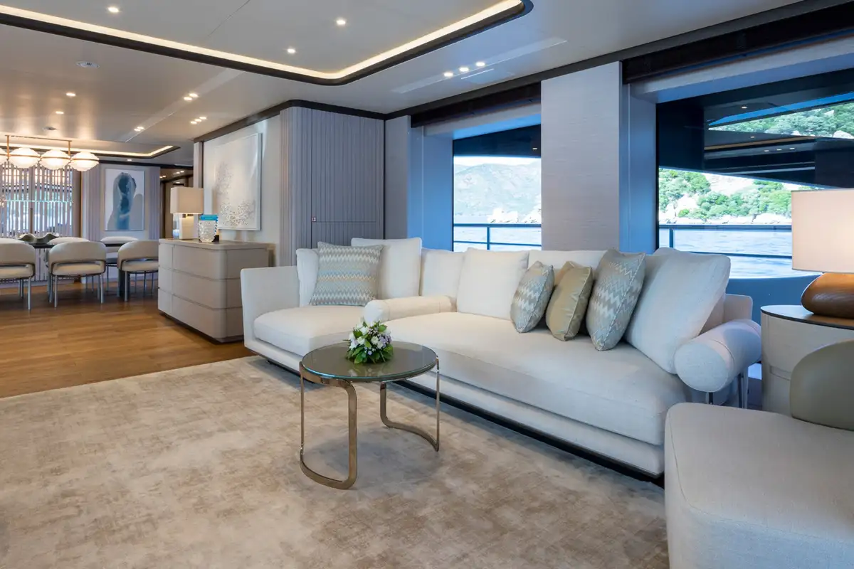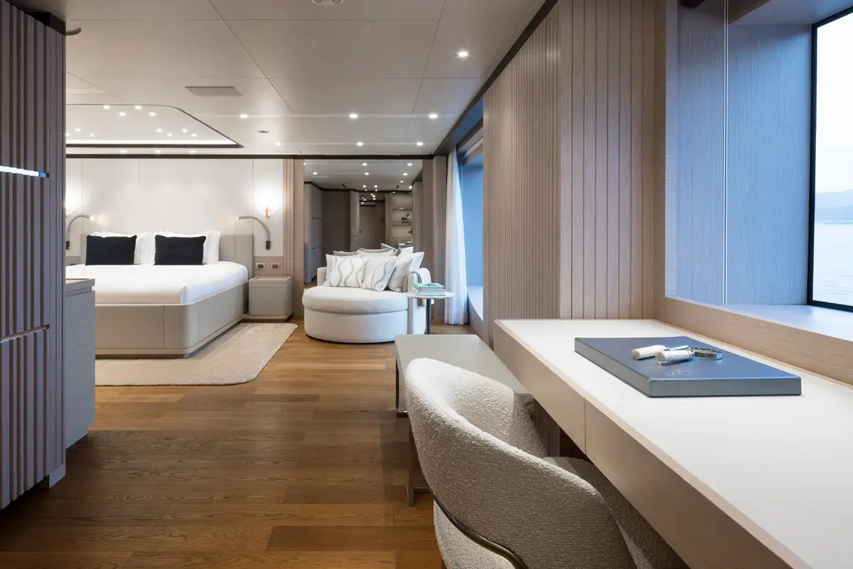 The main deck aft is without doubt the highlight on board LUMIERE, with a vast space designed to bring you as close to the water as possible. With fold-out side balconies on the aft platform, as well as a central circular jacuzzi flanked by sun loungers and seating areas, it's the perfect place to relax and enjoy the day, and an incredibly luxurious feature that is a rarity among her size range.