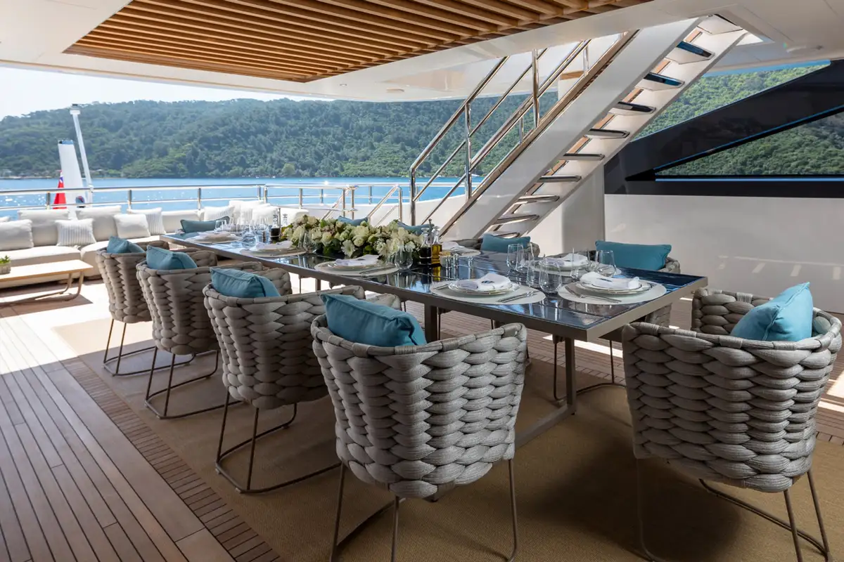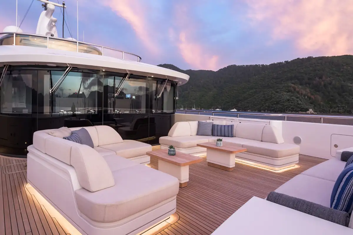 Guests will enjoy a collection of exterior lounge and entertainment areas, including a vast sun deck with over 100 square meters of space. It features a jacuzzi, bar, and oversized sun pads: making it the pristine location on board LUMIERE to enjoy the sunshine. A foredeck lounge with plush seating and optional shade lies toward the bow, with the large upper deck aft featuring a shaded al fresco dining set up for eight as well as comfortable seating overlooking the stern.