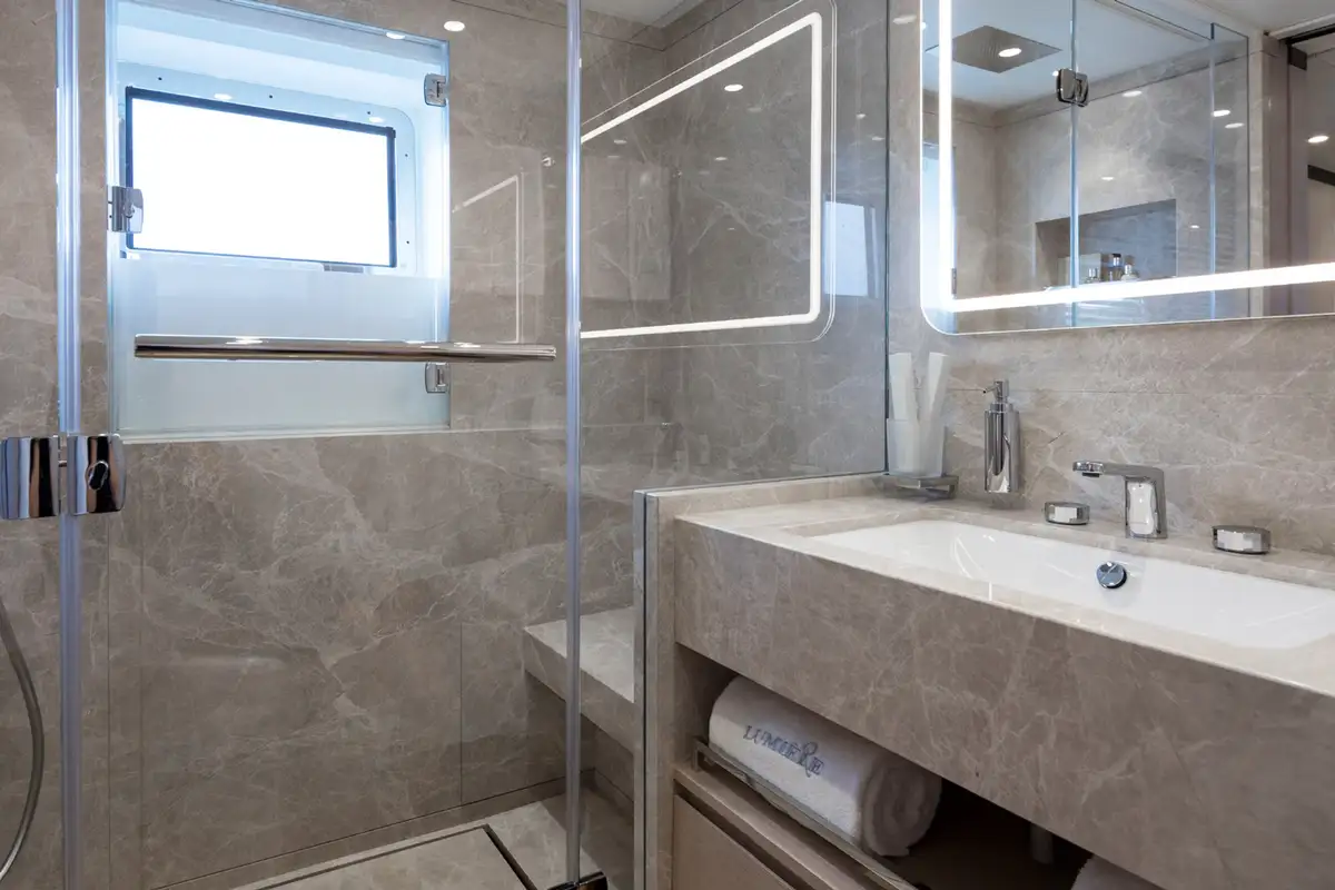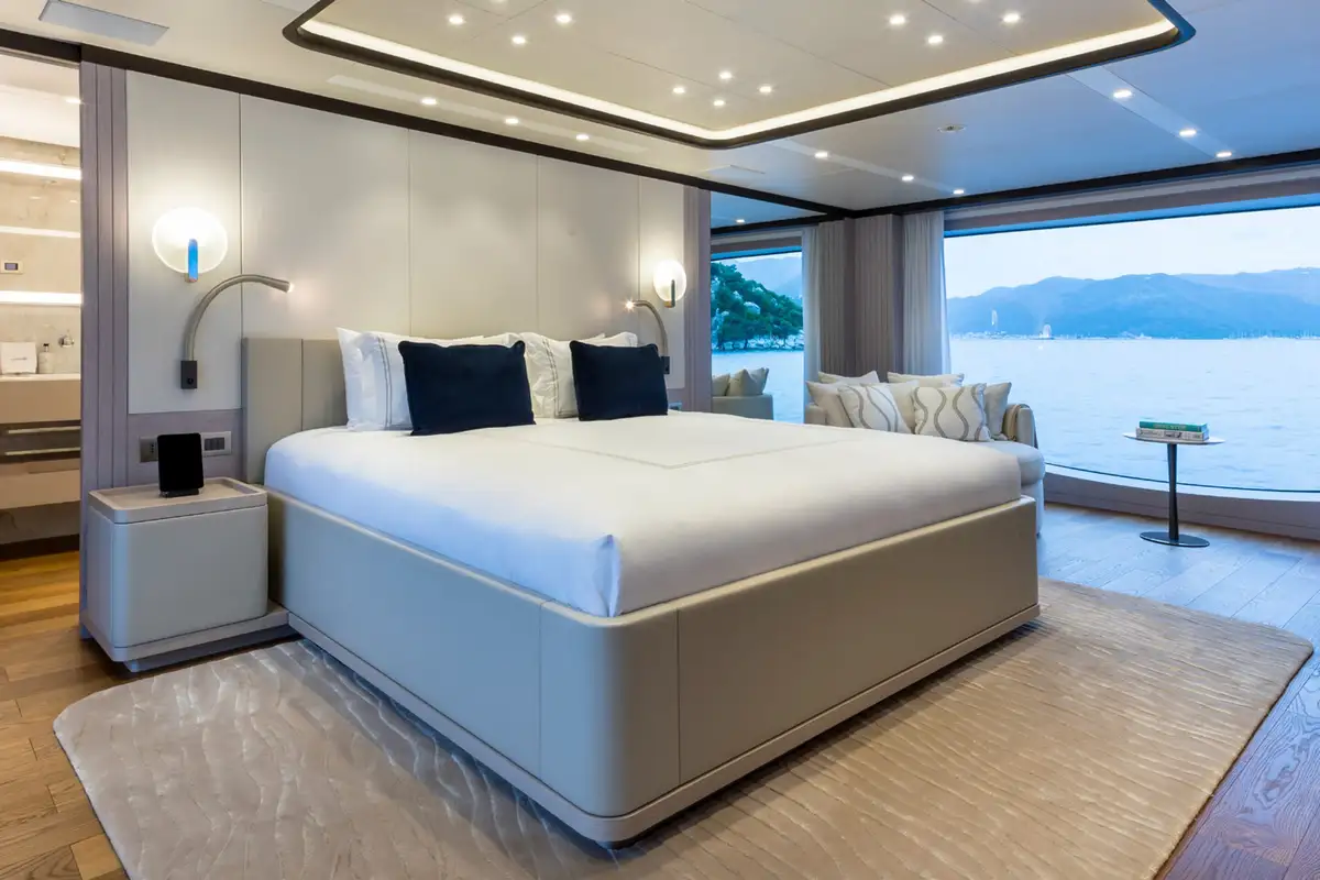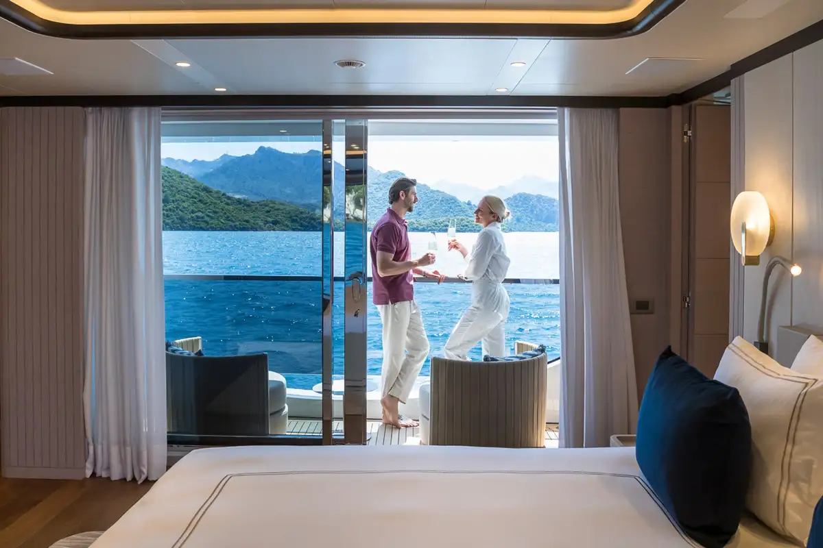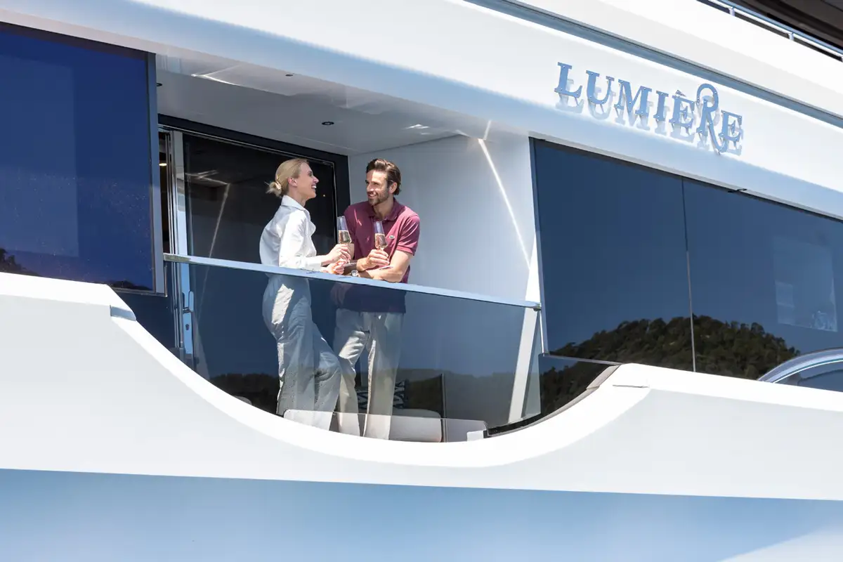 An abundance of natural light floods every deck, enhanced by panoramic windows and an open-plan layout that erases the boundaries between inside and out. LUMIERE accommodates up to 12 guests in six cabins, including a full-beam master cabin on the main deck with its own private balcony, as well as a sixth cabin that is located on the upper deck. The lower deck hosts three spacious doubles and one convertible cabin so guests can have the choice of a flexible cabin arrangement.