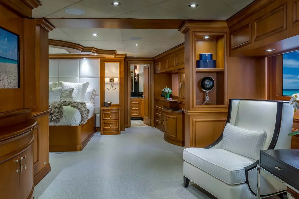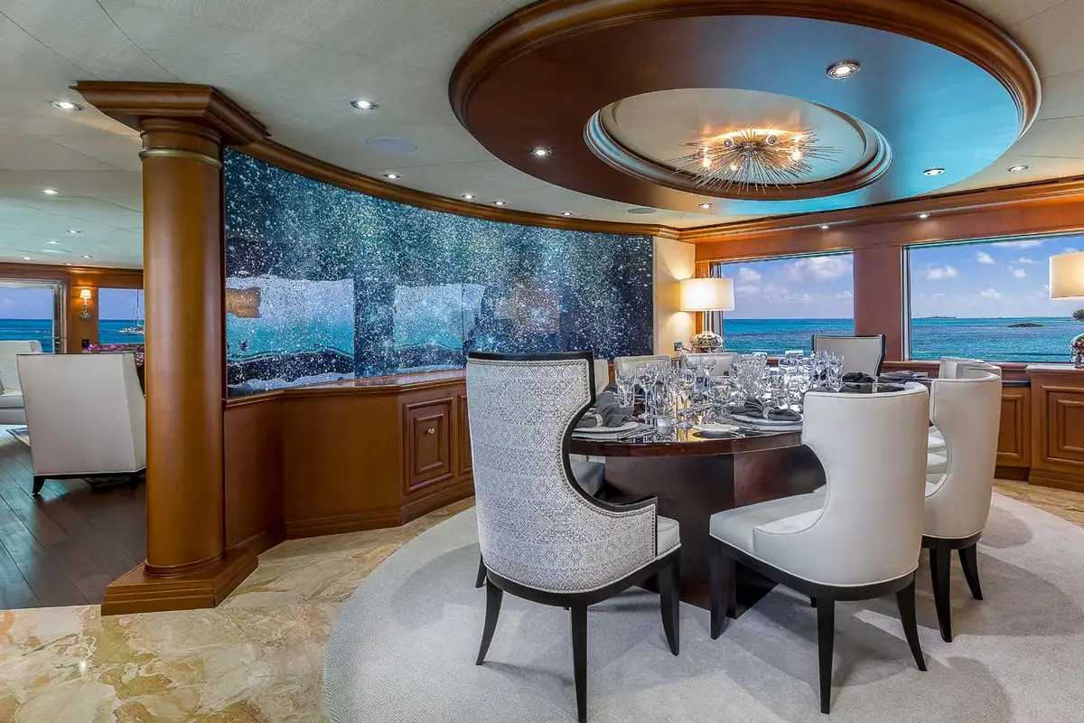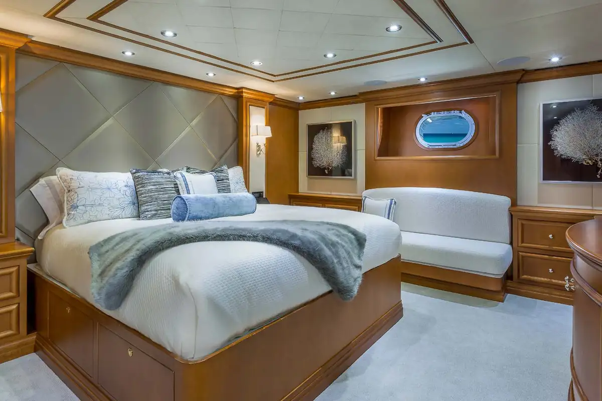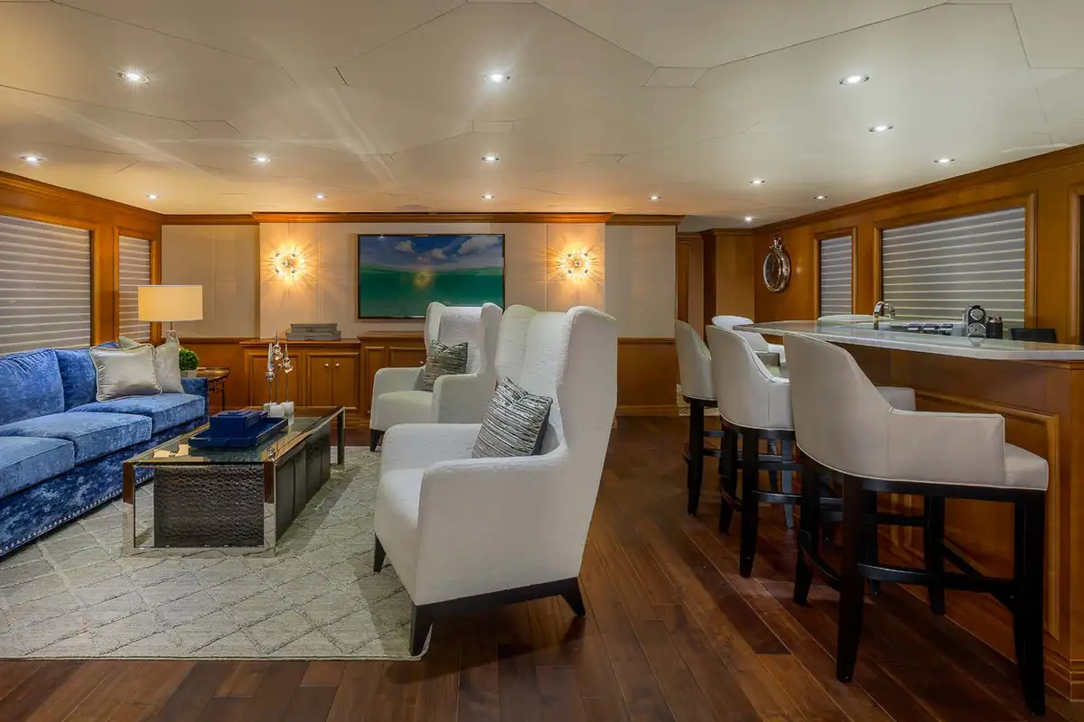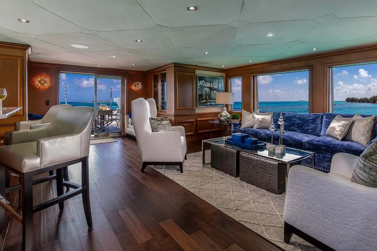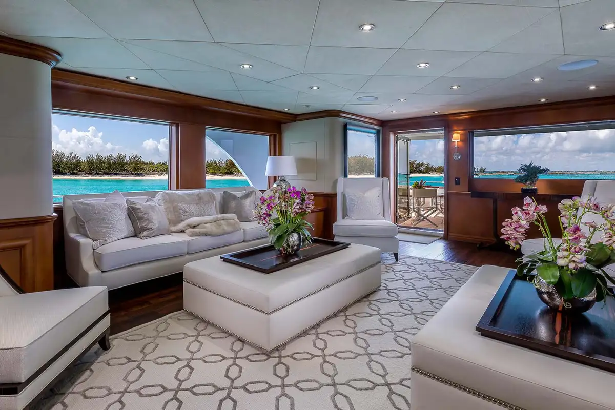 Walk through to the main saloon, one of her lavish lounges that are tastefully styled with maple, light furnishings and black walnut floors, and relax on the plush sofas. M3’s captain and their ever-attentive crew will delight you with your itinerary and everything possible on this highly maintained yacht.