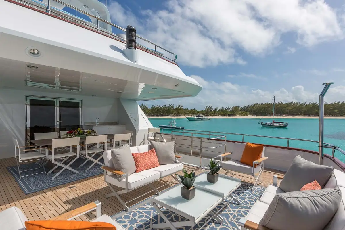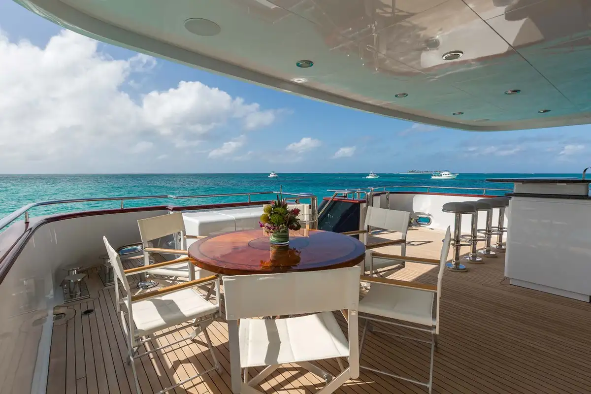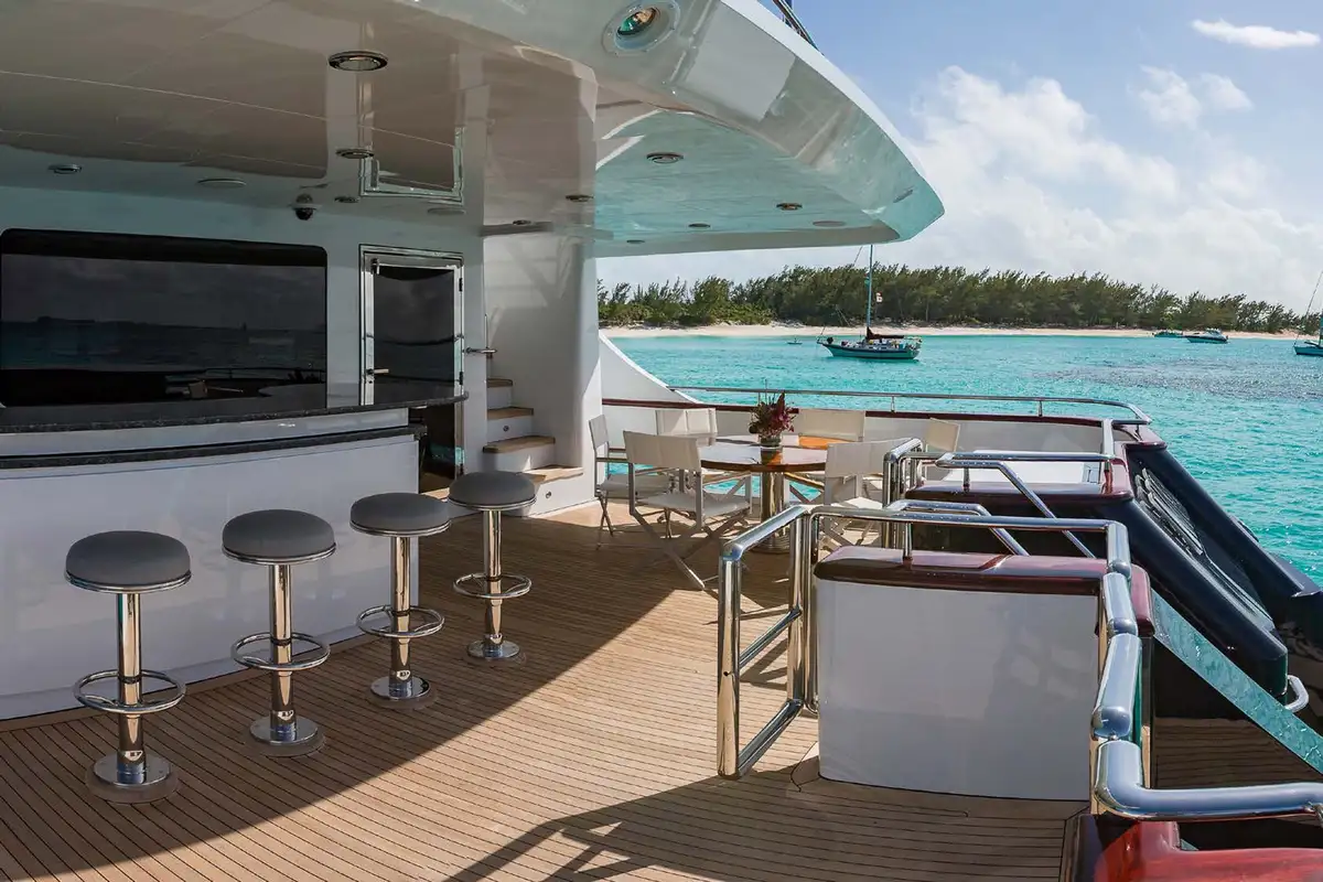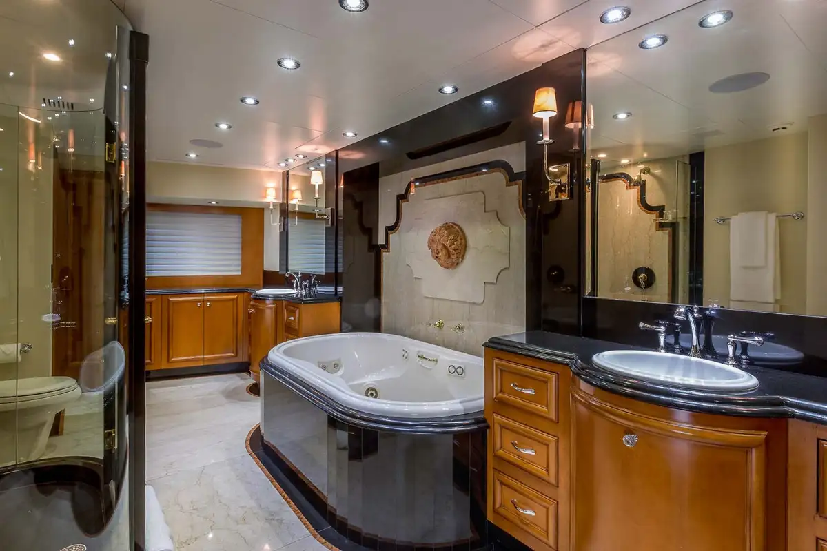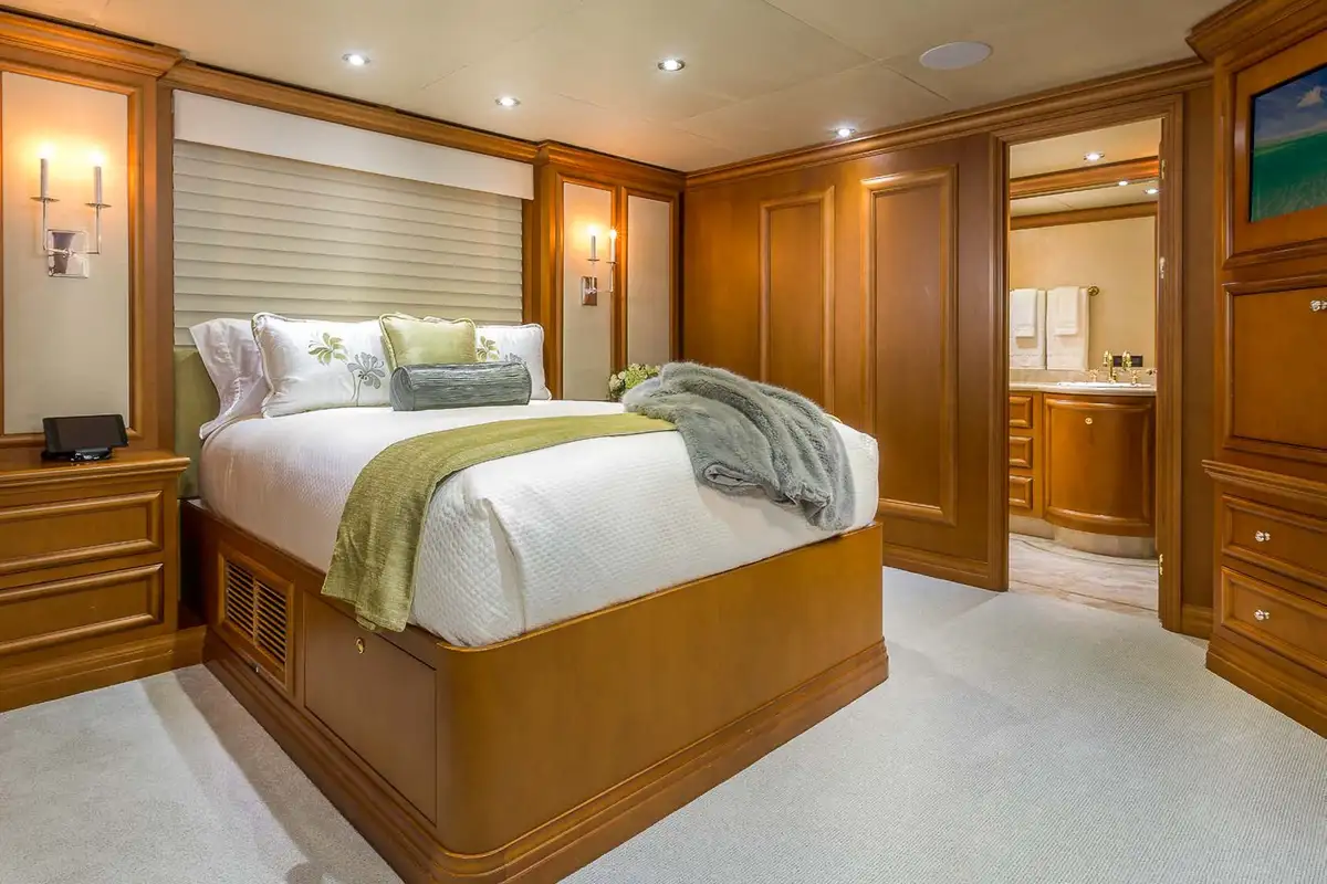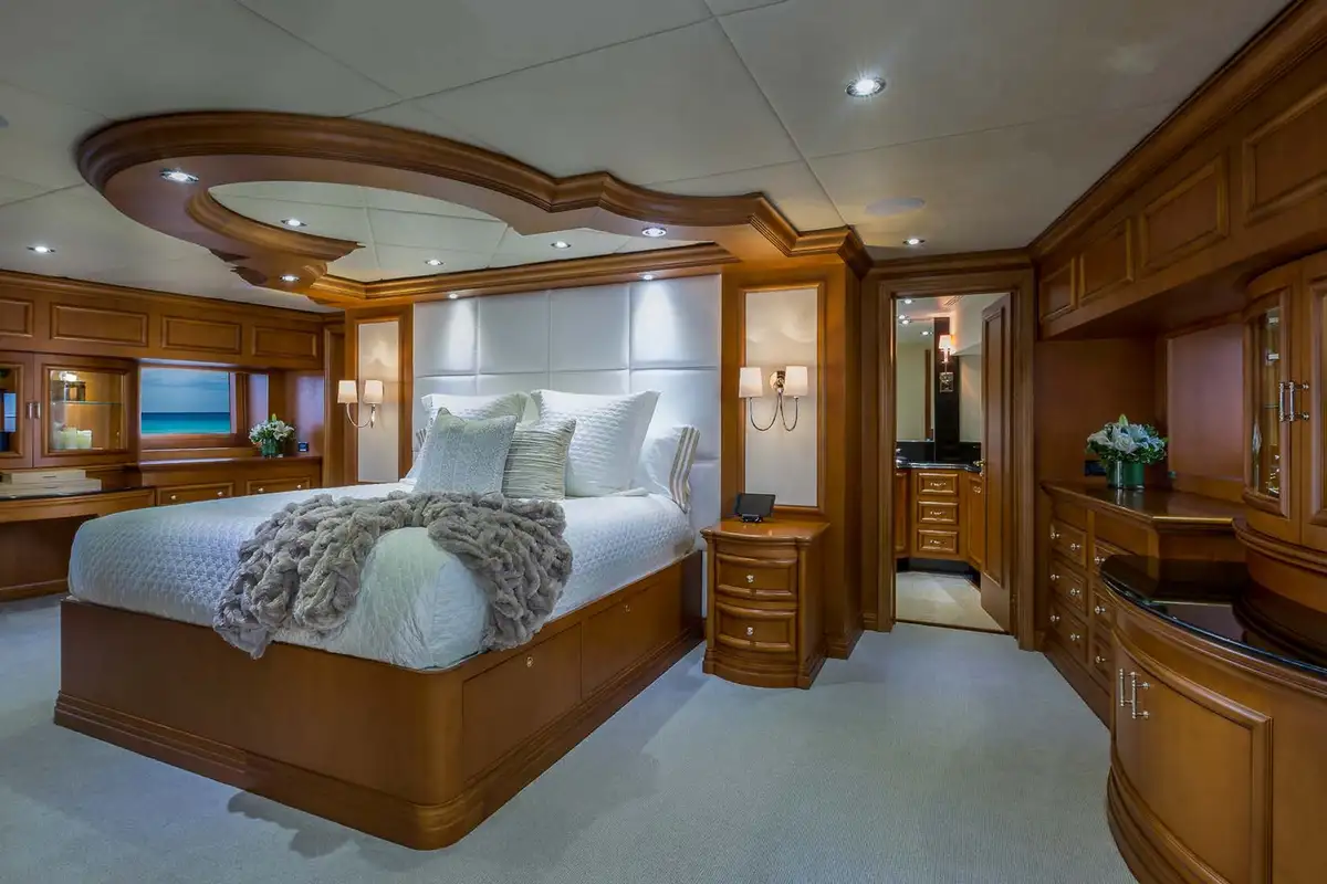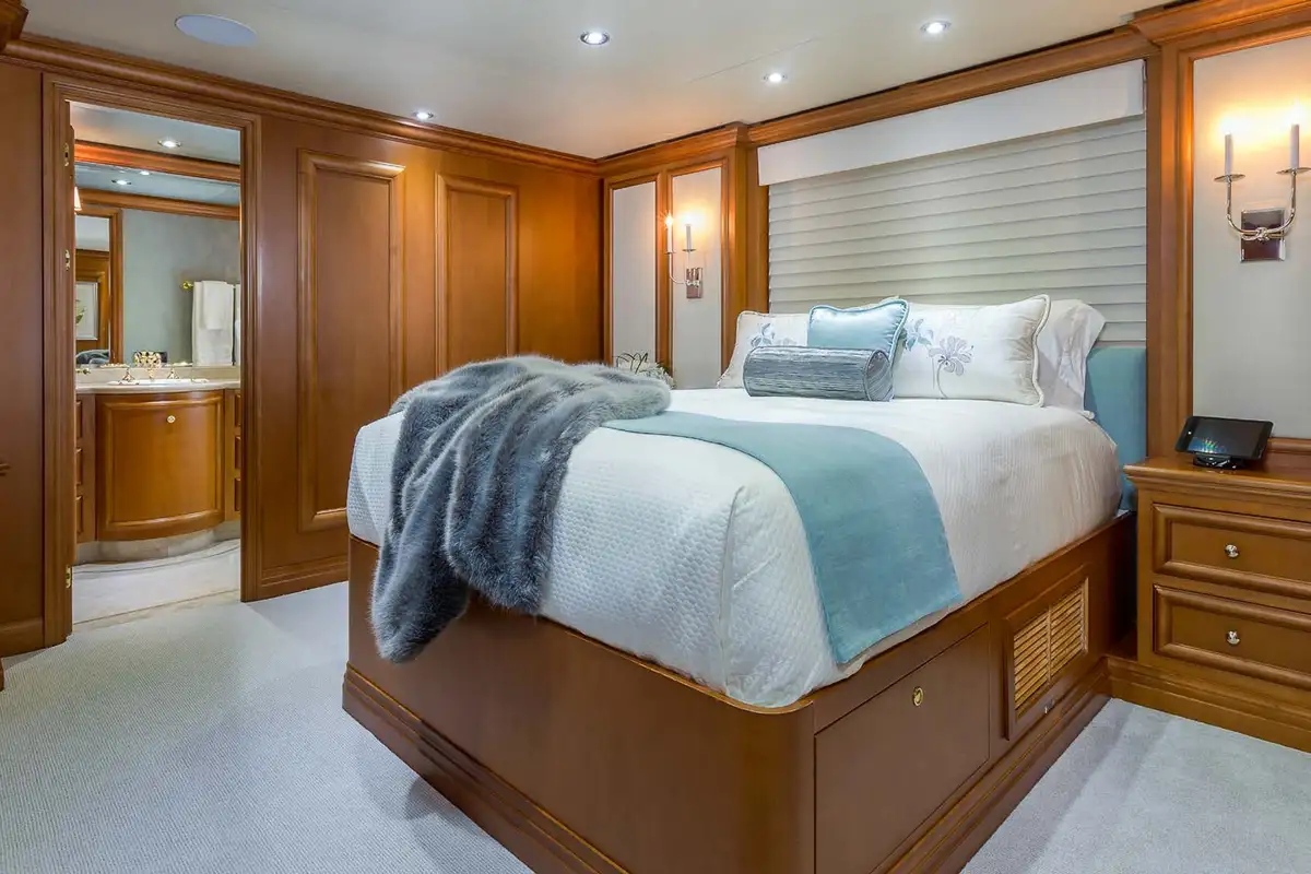Walk through to the main saloon, one of her lavish lounges that are tastefully styled with maple, light furnishings and black walnut floors, and relax on the plush sofas. M3’s captain and their ever-attentive crew will delight you with your itinerary and everything possible on this highly maintained yacht.