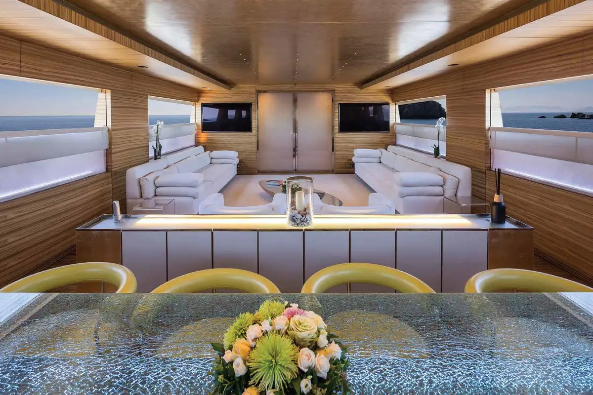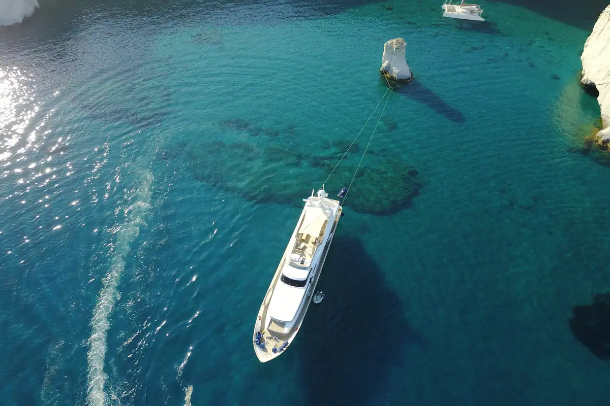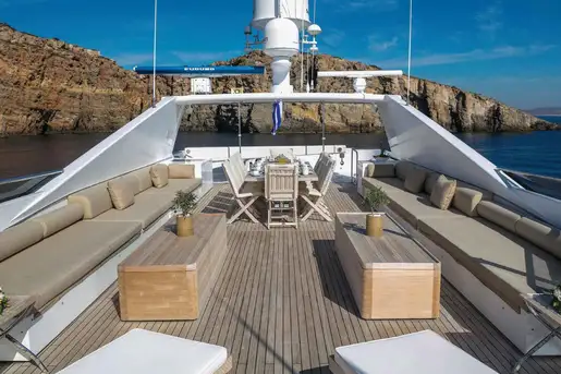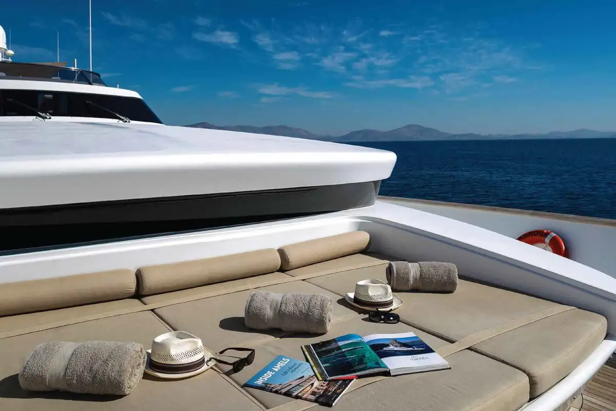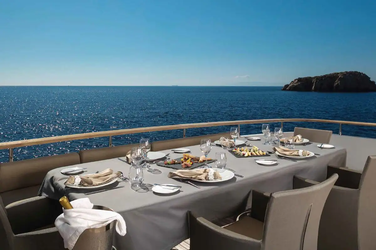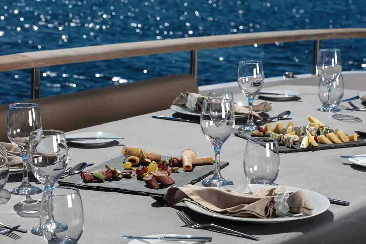 For lunch on the main deck aft, the chef has grilled some freshly caught fish and prepared a delicious selection of Greek pastries, salads, tzatziki and more. En route to the next anchorage you can join the captain on the flybridge, walk forward on the main deck to soak up the sun with the wind in your hair on the foredeck sun pads, or relax in air conditioned splendour as you watch a movie in the main saloon.