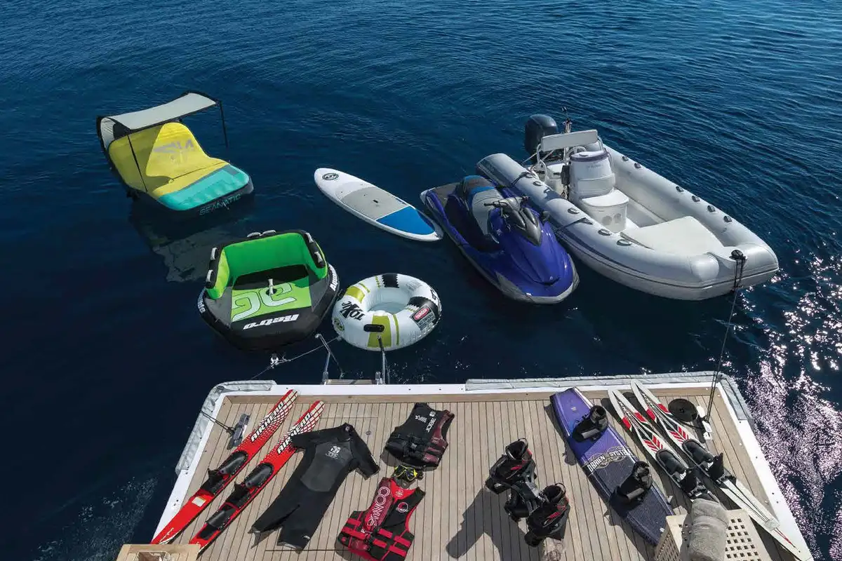 The crew has the swim platform folded down so there's plenty of space for her abundant watertoys. Will you choose the waverunner, flyboard or the tow toys for high-speed thrills, perhaps you'd prefer to explore by kayak or paddleboard. Children of all ages love to play on the inflatable trampoline and the yacht's own drone is buzzing around to capture all the action.