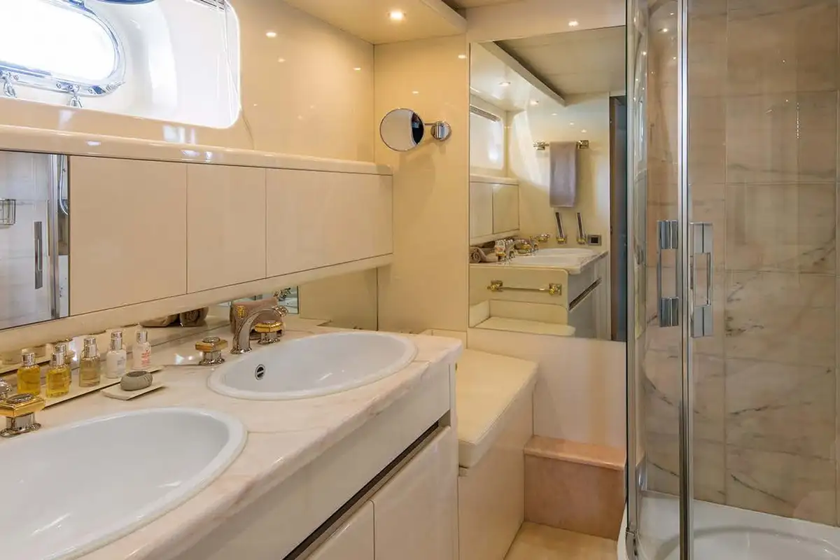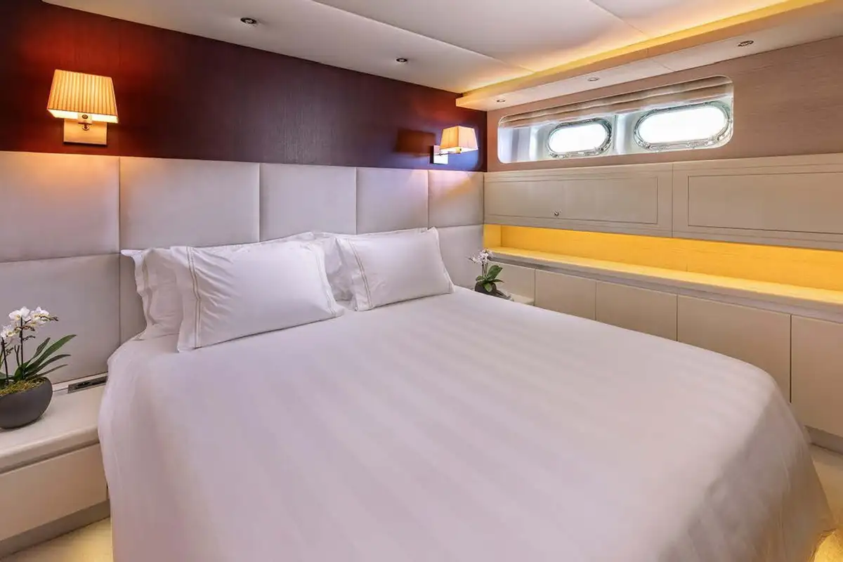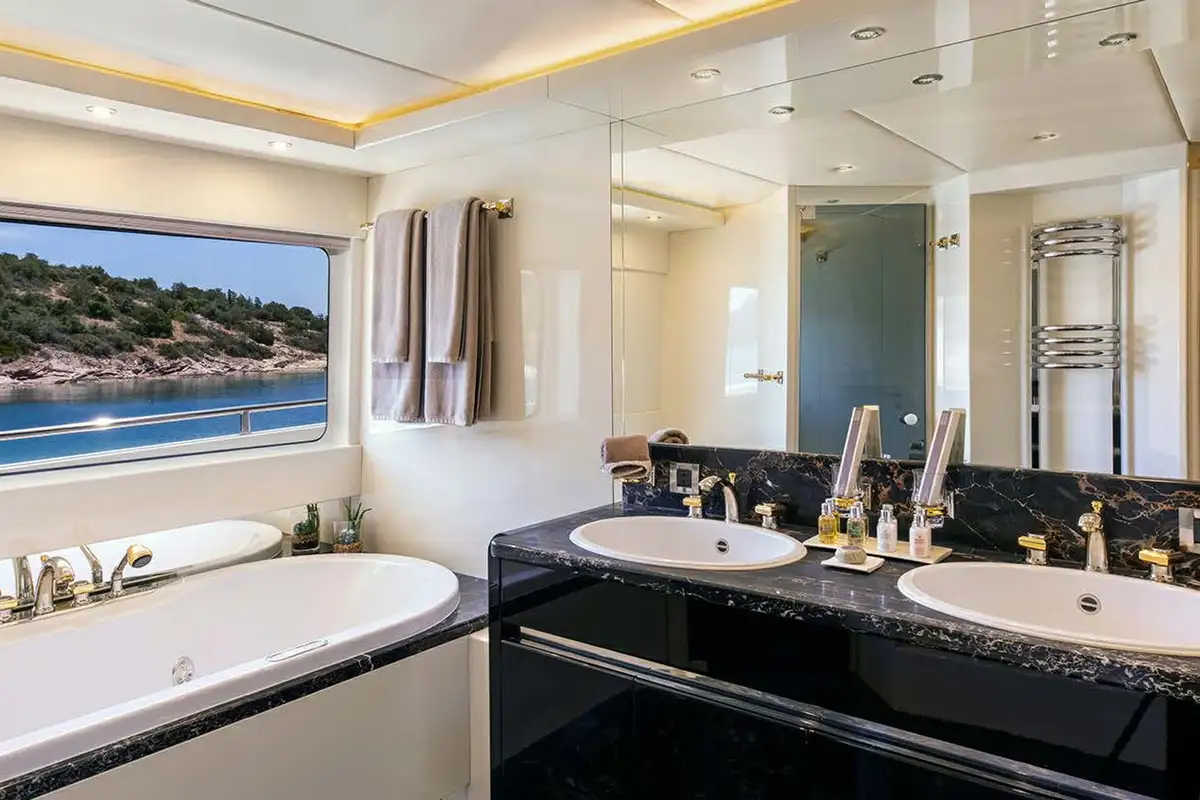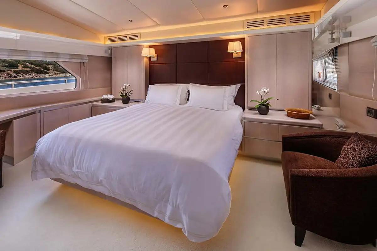 There's a master suite on the main deck and on the lower deck a full beam VIP double cabin, one further double cabin and two twin cabins, making her perfect for family charters.