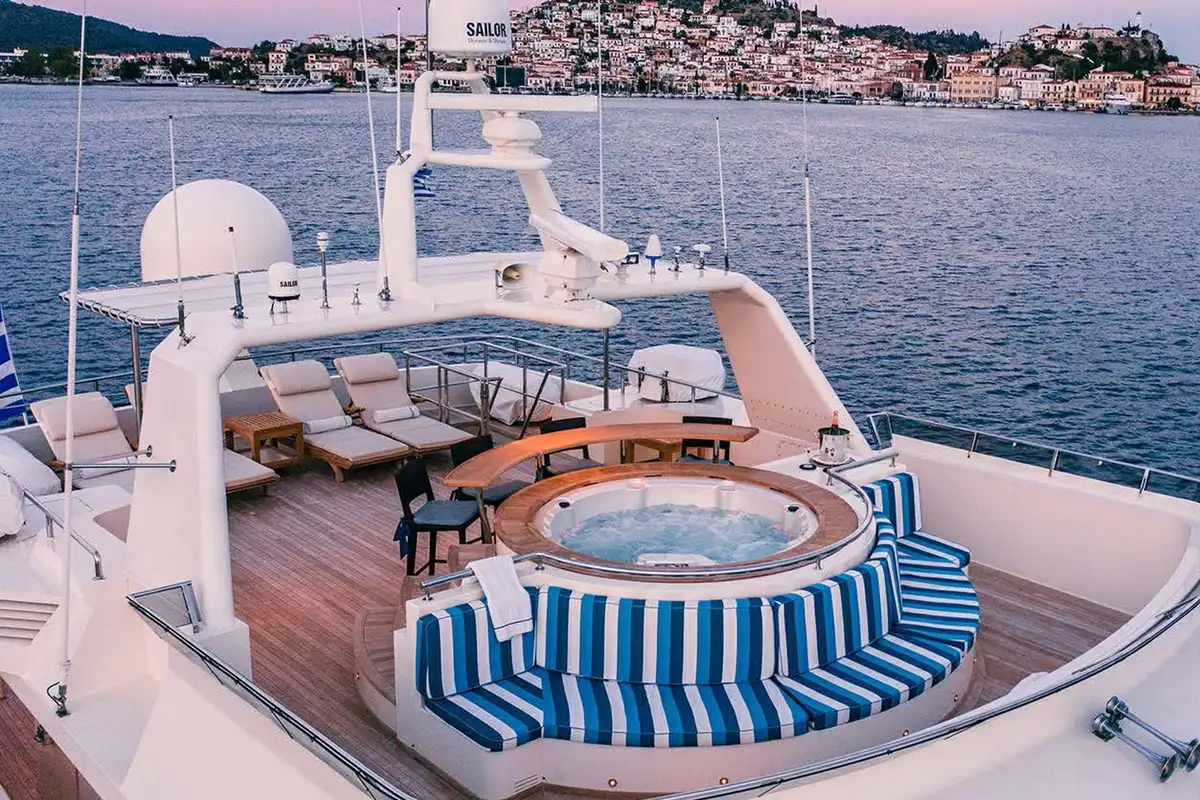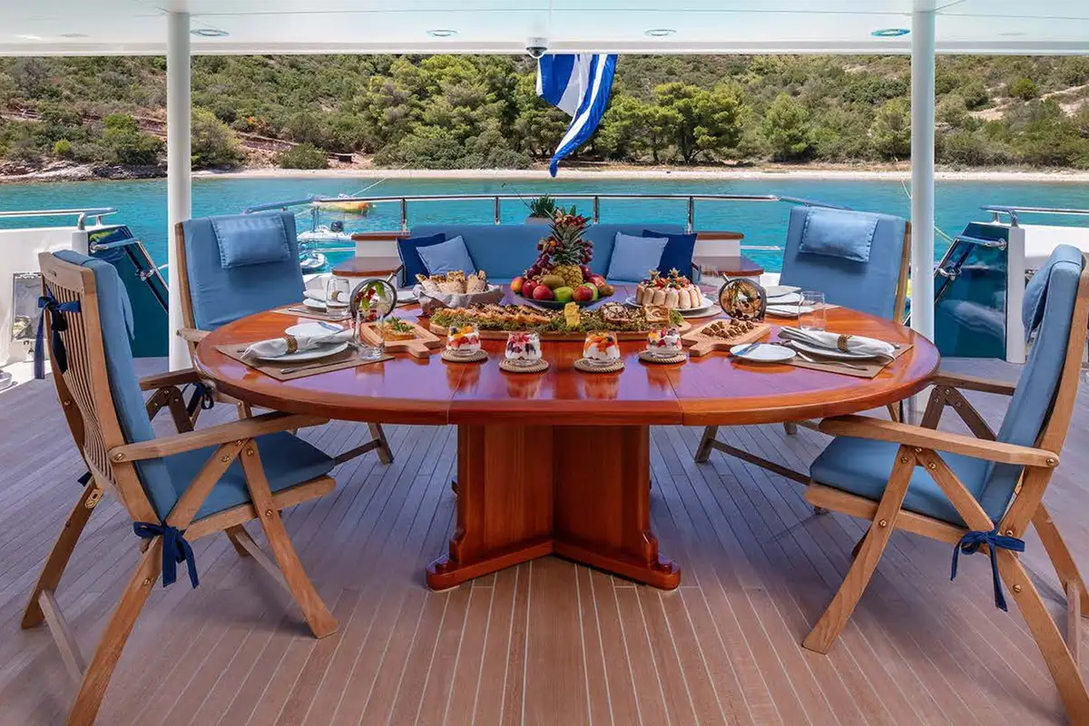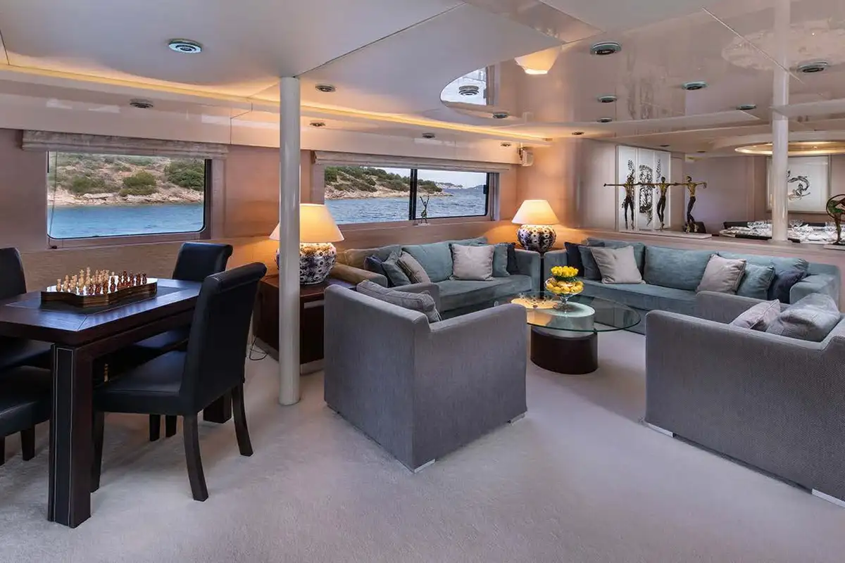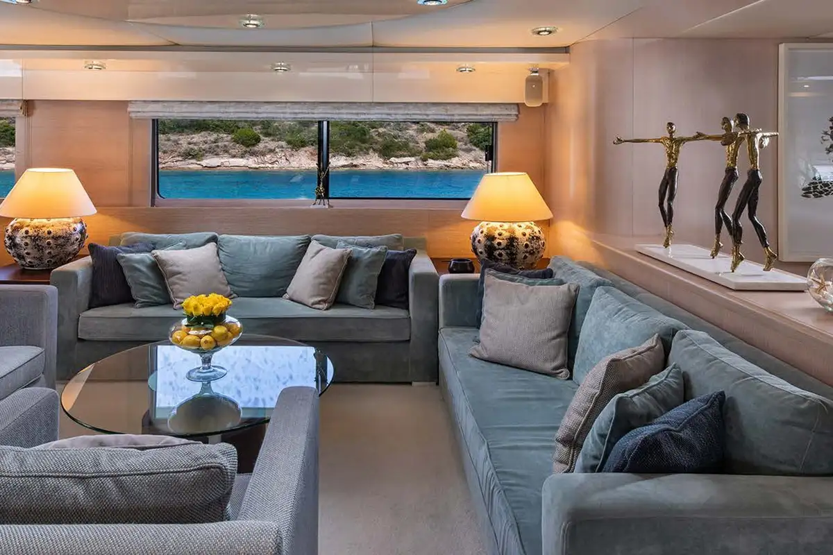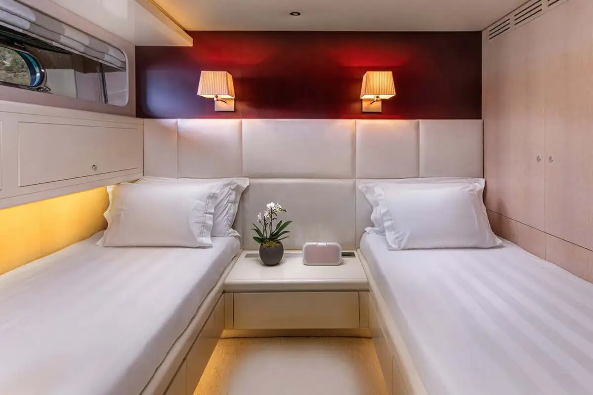 There's a master suite on the main deck and on the lower deck a full beam VIP double cabin, one further double cabin and two twin cabins, making her perfect for family charters.