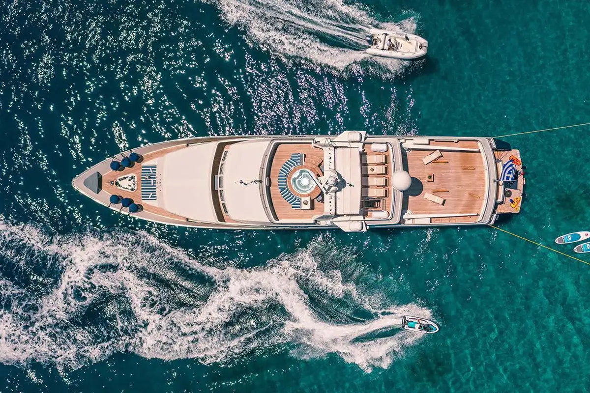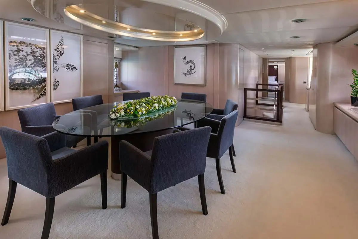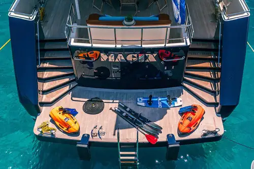 The bridge deck aft is home to the yacht's tenders and larger toys underway but when they're in the water this versatile space could be used to anything from al fresco dining to yoga to dancing or just sunbathing. The main deck aft is all about al fresco dining and lounging on the sofa, and steps lead down to the swim platform where all the toys are waiting to deliver thrills.