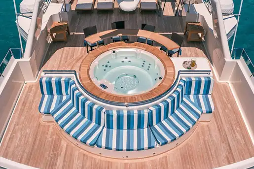 As ever the sun deck will be a home from home for guests. Its jacuzzi has a sit up bar for use by those either sunning or soaking. In front of the jacuzzi is an arc of seating where you can celebrate the sunset and there are sun loungers aft with a removable awning for sun or shade as desired.
