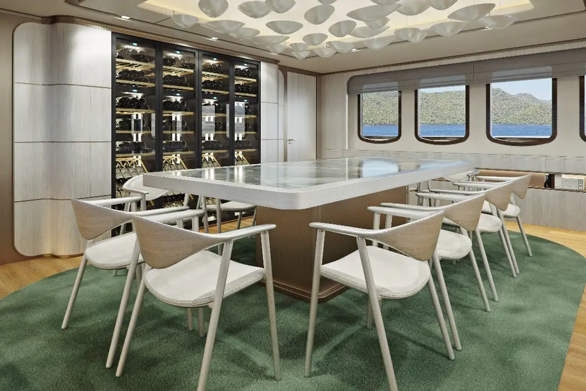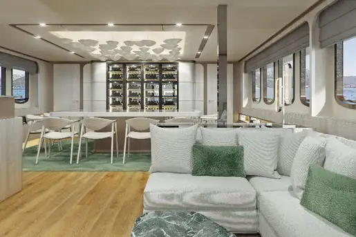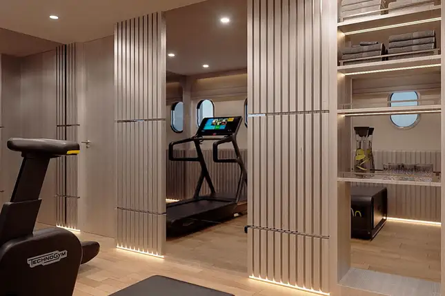 MAIA excels in guest accommodation too. The main deck master suite is a delightful space to unwind. Accessed via a private office, the forward-facing king-sized berth offers a view through panoramic windows, and to the rear is a light and fresh en-suite bathroom. On the lower deck, there are two double suites and three twin/double convertible suites offering your party plenty of sleeping options. Also located on the lower deck is a gym equipped with a treadmill, exercise bike, bench, and weights.