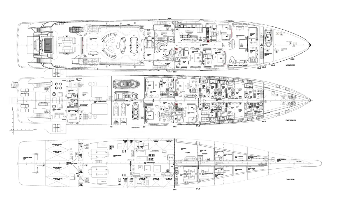 Given the yacht's emphasis on styling and visual impact, you can be assured that the guest spaces have been meticulously planned to offer you the very best onboard experiences. From the poolside on the main deck to the sumptuous sun deck with a bar, al fresco lounge area, and jacuzzi, and not to forget the full-beam beach house on the lower deck that opens out onto the vast swim platform. On both sides, fold-down sea terraces extend this area, allowing for sea-level views and a warm breeze to pass through this magnificent space. It's furnished with sofa seating, a wet bar, and ample deck space for sun loungers and relaxation. Hidden from view are the hammam, sauna, and massage suite.
