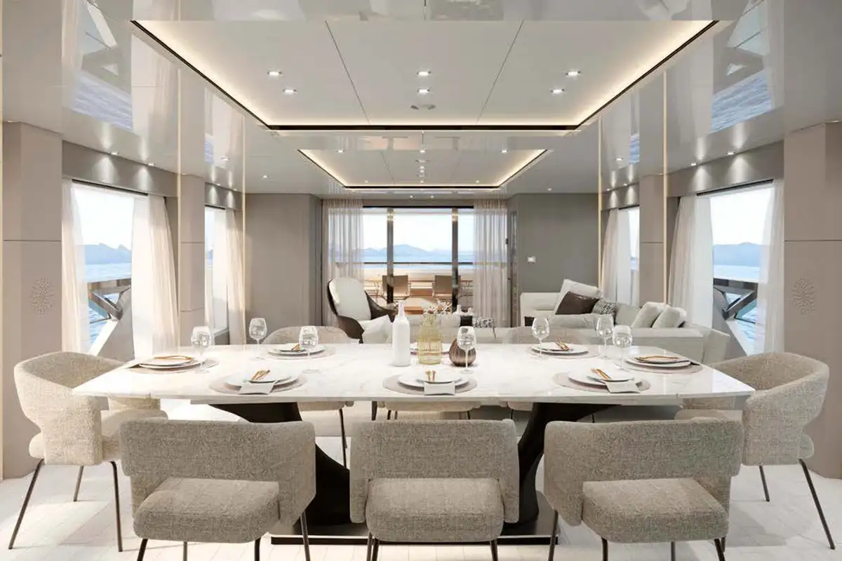 Her interior is a delightful place to relax; light, chic and comfortable, a place to admire your location through the sizeable floor-to-ceiling windows that line the main lounge. Ahead of the lounge is the formal dining area, perfect for birthday banquets or an evening of fine dining with friends.
