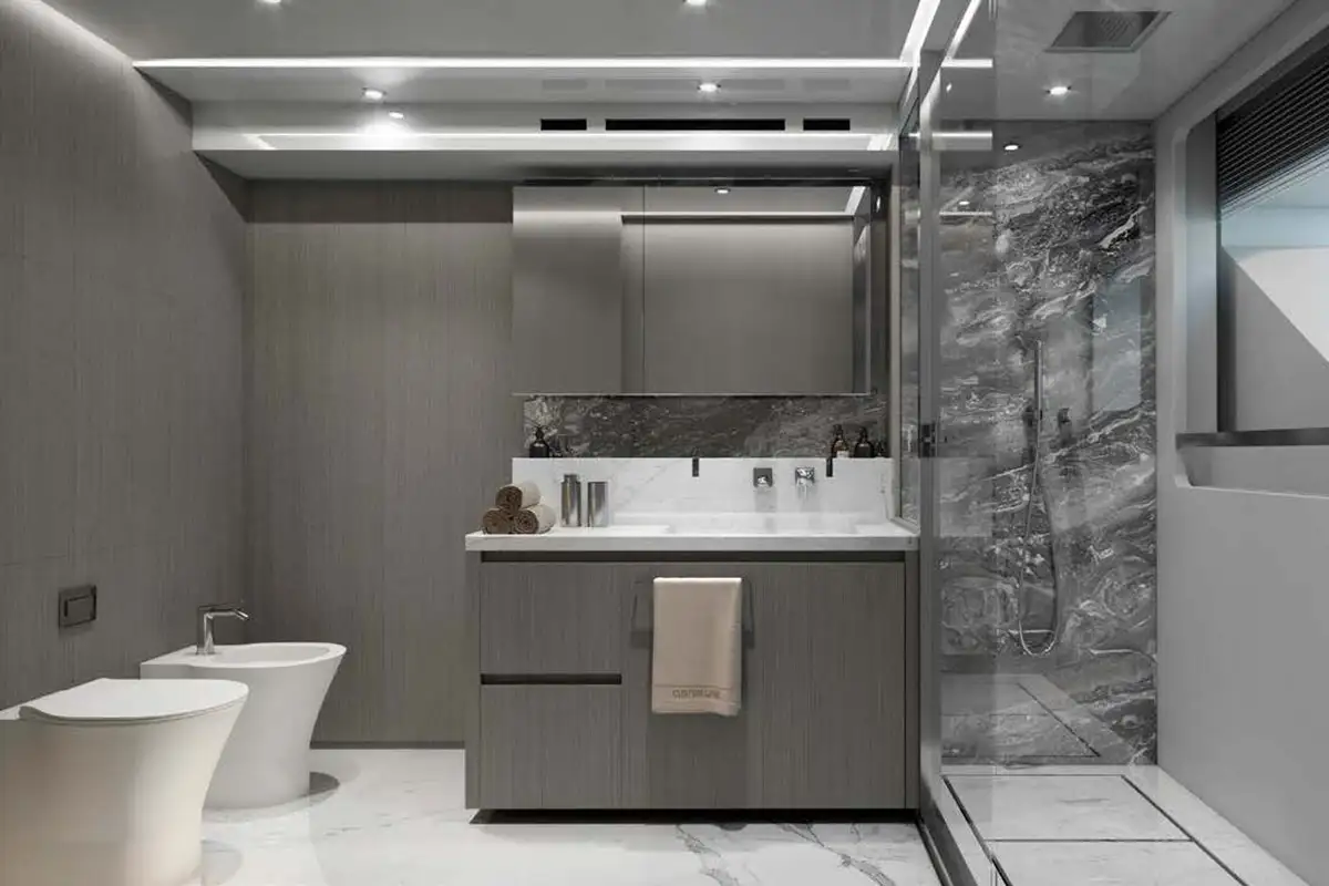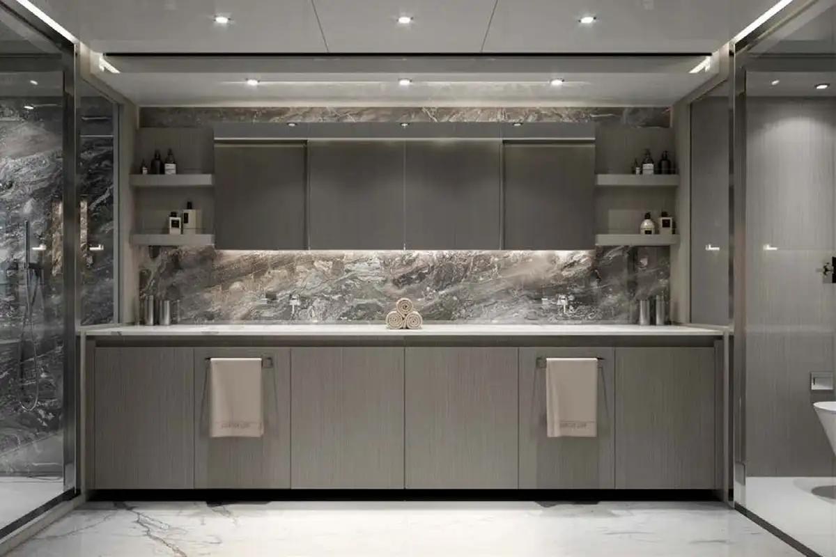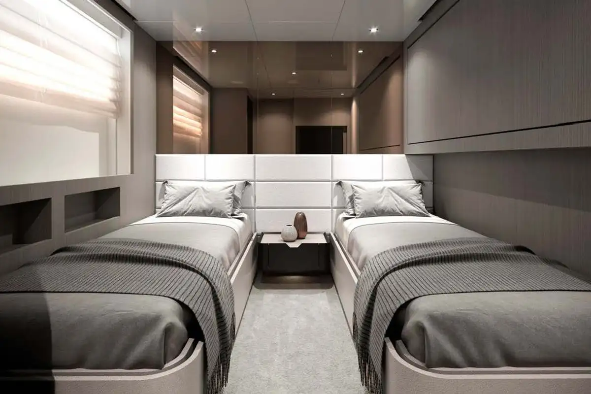 The guest suites on MARICAN FOREVER are charming and private spaces for you and your guests. On the lower deck are two double VIP suites and two twin-berth cabins; each guest cabin is en suite and benefits from large hull windows to provide light and views. Your primary suite is on the main deck ahead of the guest lobby. The full-beam suite has floor-to-ceiling windows, giving you a sensational view from your forward-facing king-sized berth. Ahead of this is the full-beam en suite bathroom. Where better to refresh and revive yourself after a day in the sun and the sea?