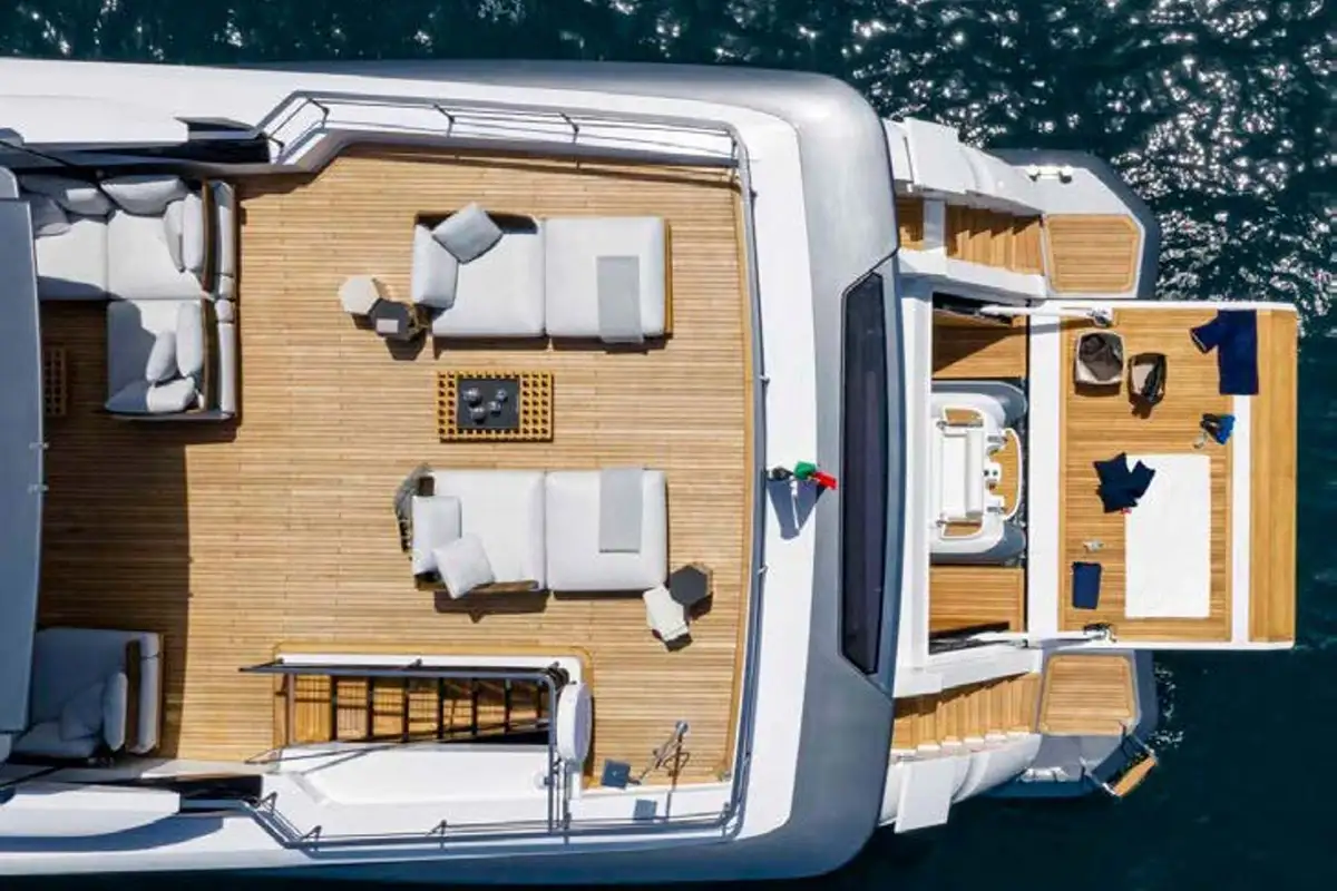 The main deck, a few steps down from the sundeck, has a great shaded cockpit dining space. Here, you can enjoy delicate delights from MARICAN FOREVER’s professional chef while enjoying the warm breeze and stunning views. Steps lead to the fold-down transom, giving you a waterside space to unwind and a large swim platform when needed.