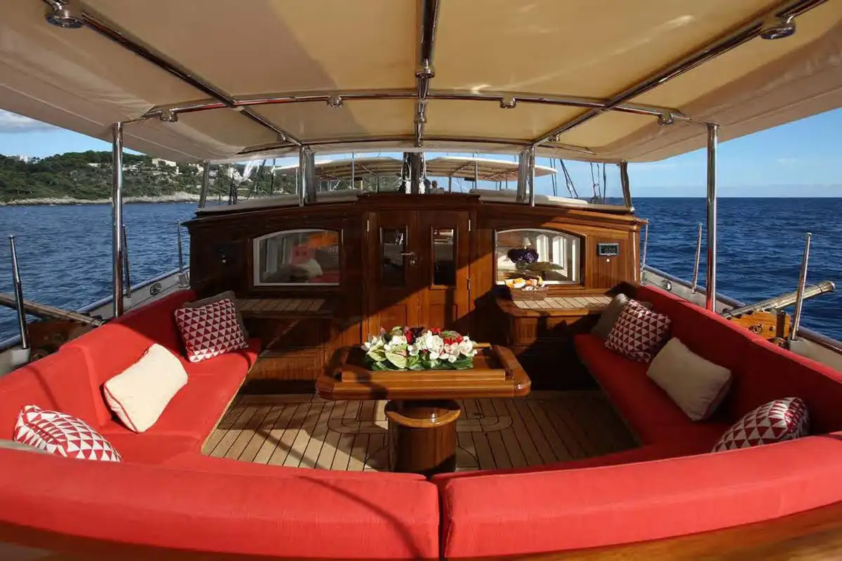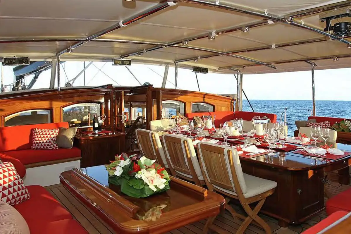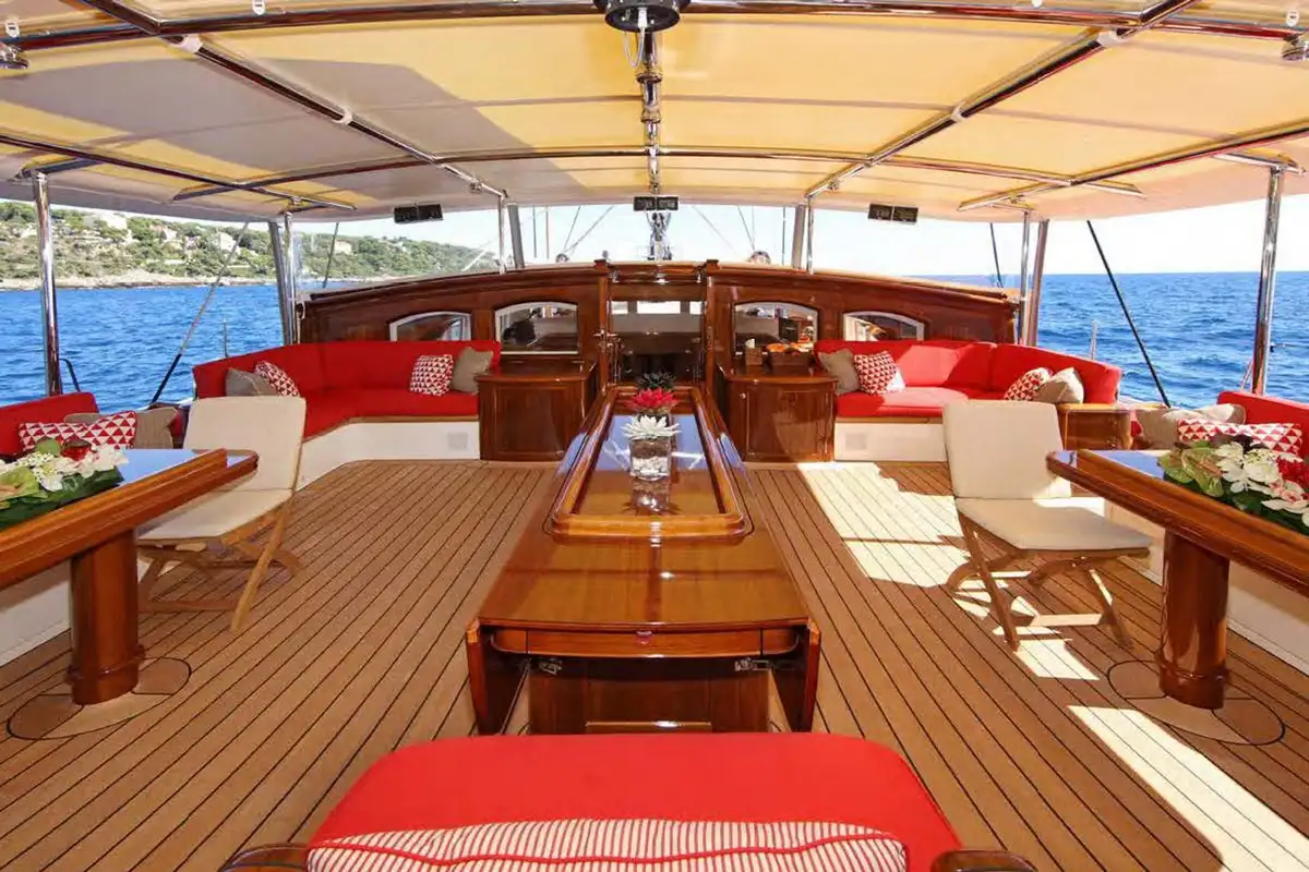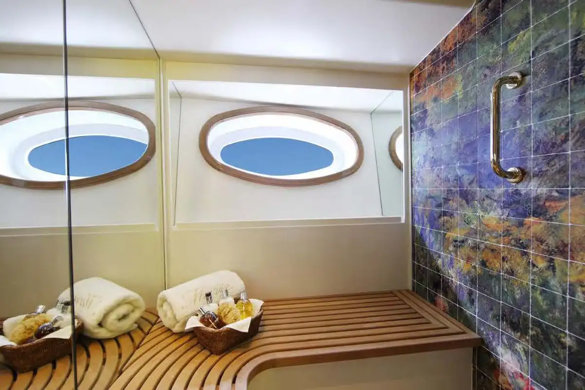 The large, sheltered cockpit is a favourite spot for al fresco dining and relaxing at anchor, and the wide decks beyond provide ample opportunities to bask in the sun. The master cabin, with its en suite steam room and deck house study, has its own private cockpit, creating a romantic setting aft for sundowners or an after dinner aperitif. The guest double cabin is equally light and airy and there are two twin cabins (one convertible) each with pullman berths that are popular with children.