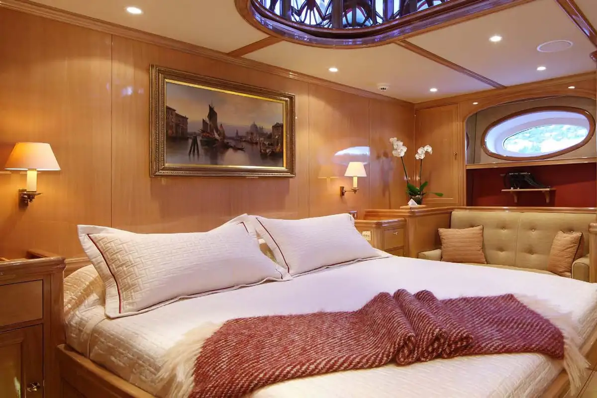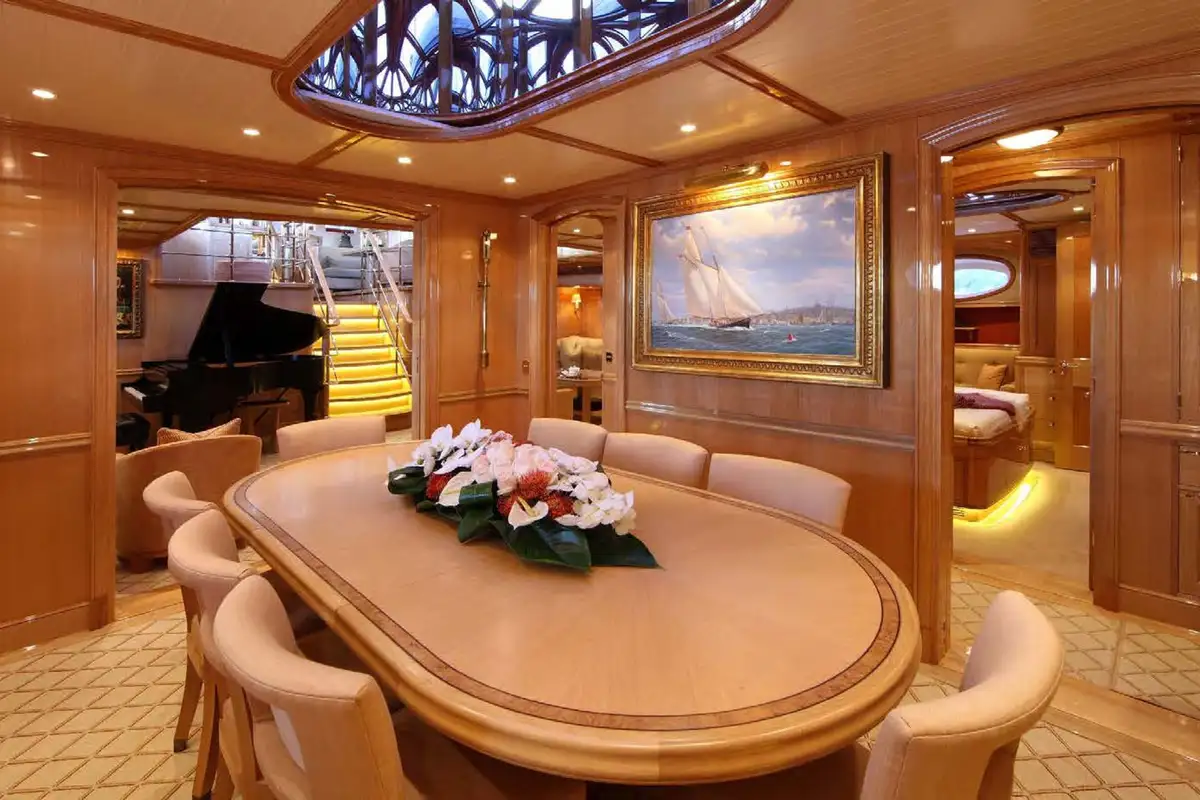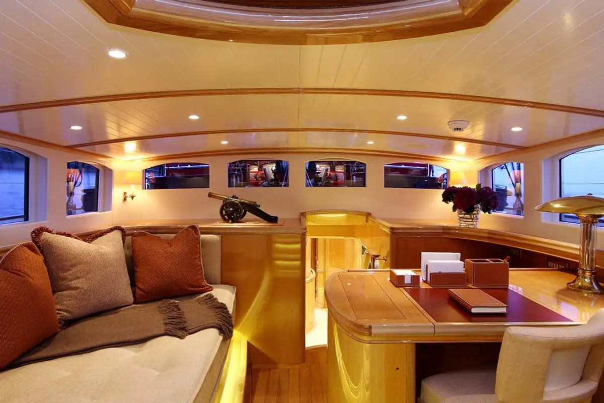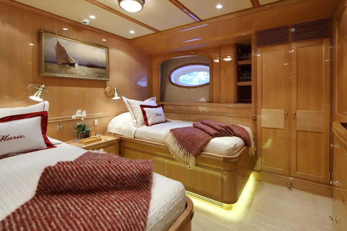 Bursting with personality, MARIE's light, open-plan interior is comfortable and welcoming, with traditional features including miniature cannons, muskets and a suit of armour recalling the Golden Age of exploration. A split-level lounge is illuminated by large skylights that filter plenty of natural light into the relaxed deck house with its bar and cosy seating area. A more formal setting below features a Steinway baby grand piano and an oval dining table.