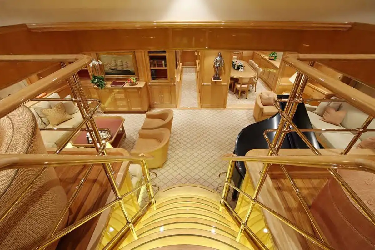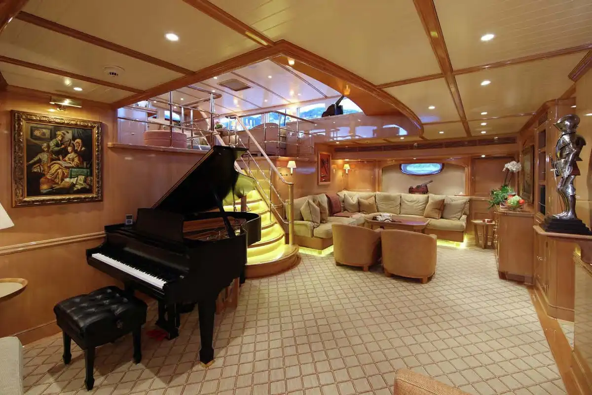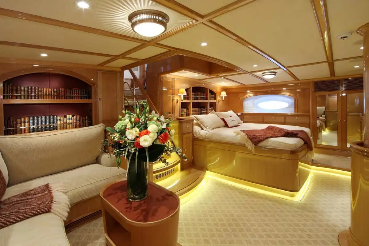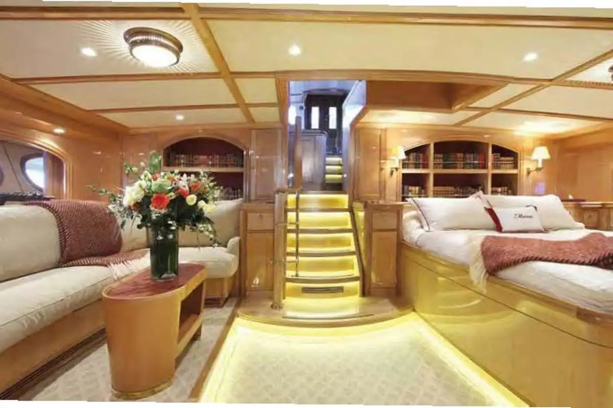 Bursting with personality, MARIE's light, open-plan interior is comfortable and welcoming, with traditional features including miniature cannons, muskets and a suit of armour recalling the Golden Age of exploration. A split-level lounge is illuminated by large skylights that filter plenty of natural light into the relaxed deck house with its bar and cosy seating area. A more formal setting below features a Steinway baby grand piano and an oval dining table.