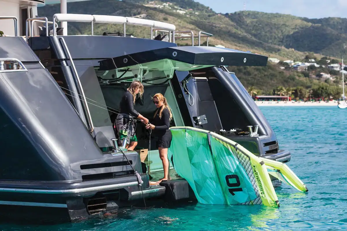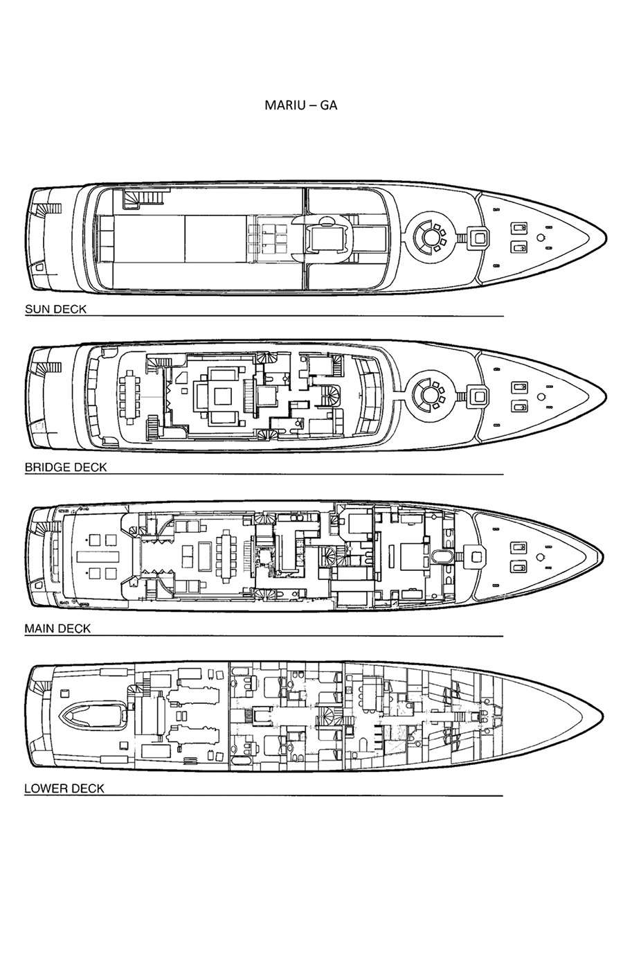 Dinner can be served al fresco on the bridge deck or main deck aft or, should the weather demand it, in the formal dining lounge. An elevator connects all four decks, so elderly guests and perhaps those who have exhausted themselves with the watersports can retire to one of MARIU’s sumptuous cabins without taking the stairs. With a full beam master and a double cabin on the main deck, and four further doubles on the lower deck, guests will be ensconced in luxury 24/7.
