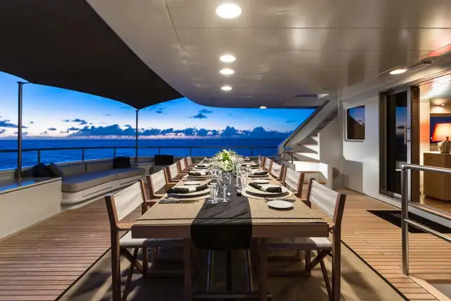 Boarding MARIU from her swim platform, walk up the sweeping steps onto her main deck aft where the crew will greet you with a warm welcome. You won’t want to delay heading up to the large sun deck, with its jacuzzi, loungers and sit-up bar. Spend some time here acclimatising to life on board, soaking up the sun before taking a tour of the yacht. Note the enormous dining tables that sit beneath canopies for cool shade – the perfect spot for al fresco lunch. Enjoy fresh cuisine with Mediterranean and Asian influences prepared by the talented Italian chef, before relaxing on the upper deck beneath the shade of an awning.