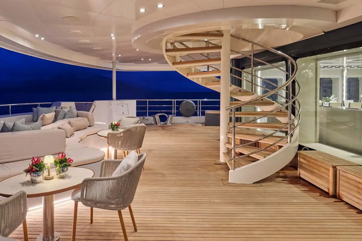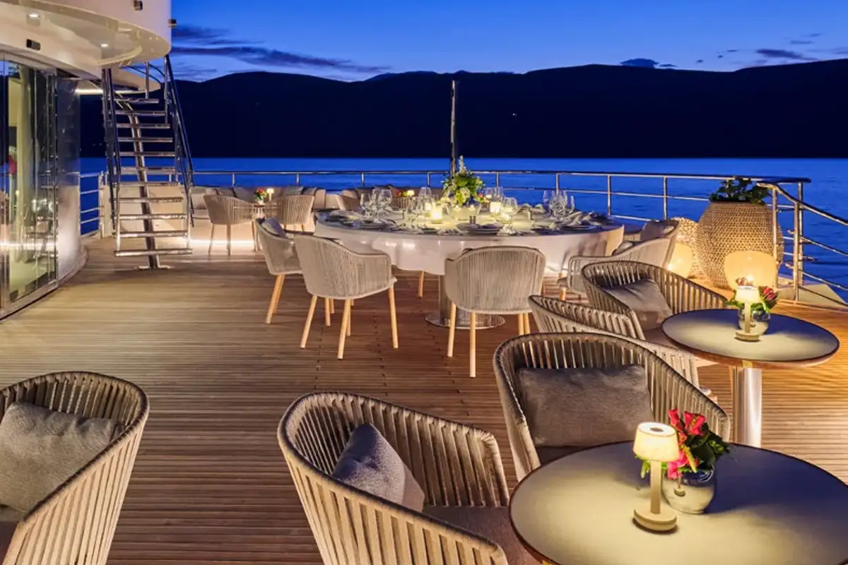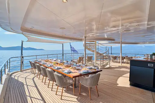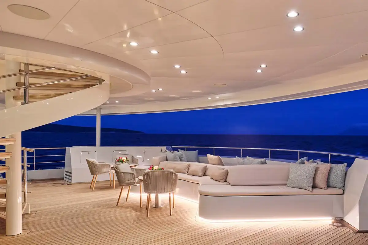 She has an extraordinary amount of exterior deck space for relaxing and enjoying life on board. On the sun deck there is a large jacuzzi surrounded by sun pads and sun loungers as well as a lounge area aft. The master deck has a large terrace aft with abundant seating around the edges and a private dining table for 10 guests. The upper deck aft has a variety of seating areas for open air dining and snacking during the day and there is another lounge area on the main deck aft.