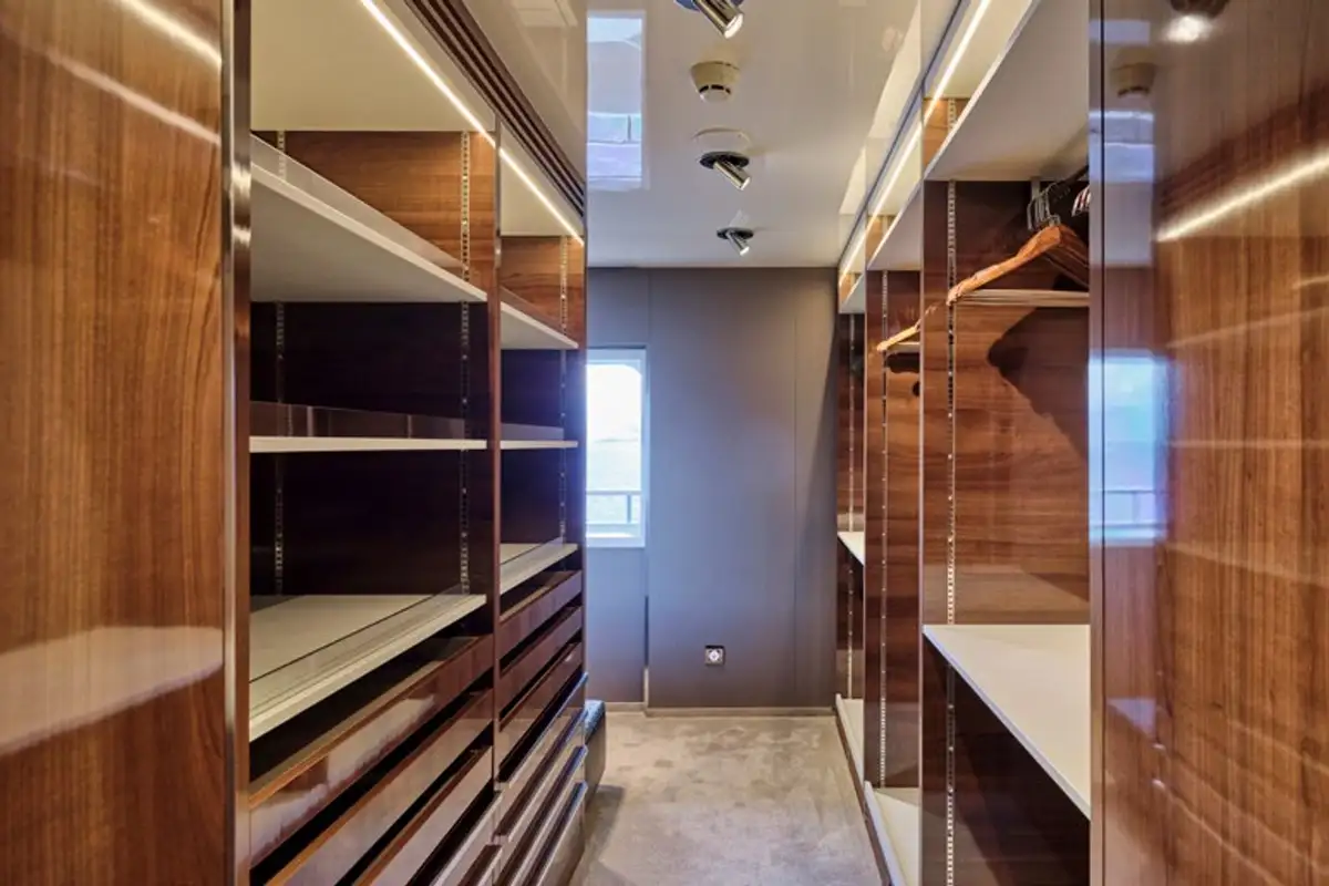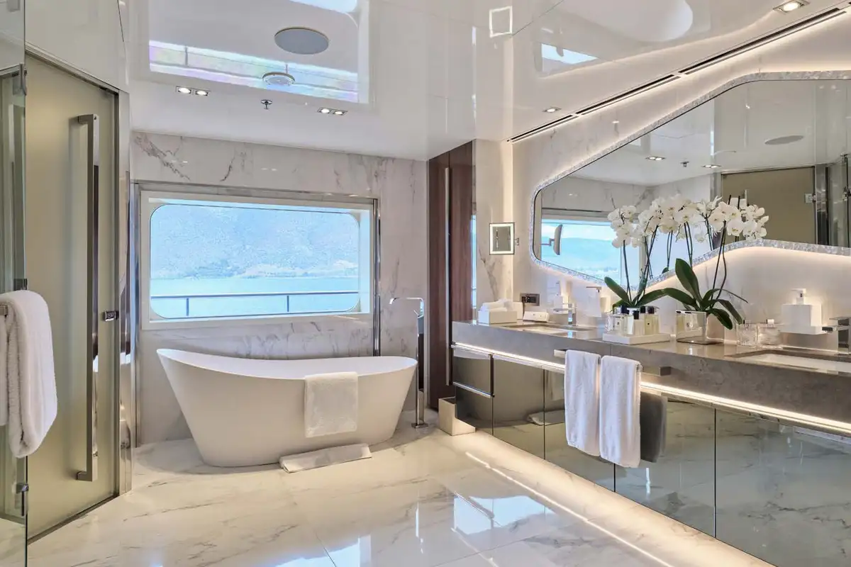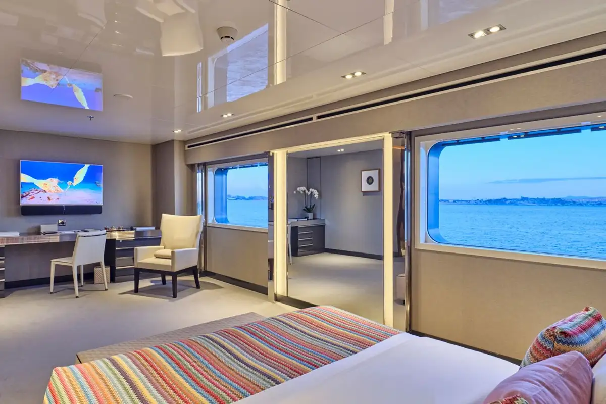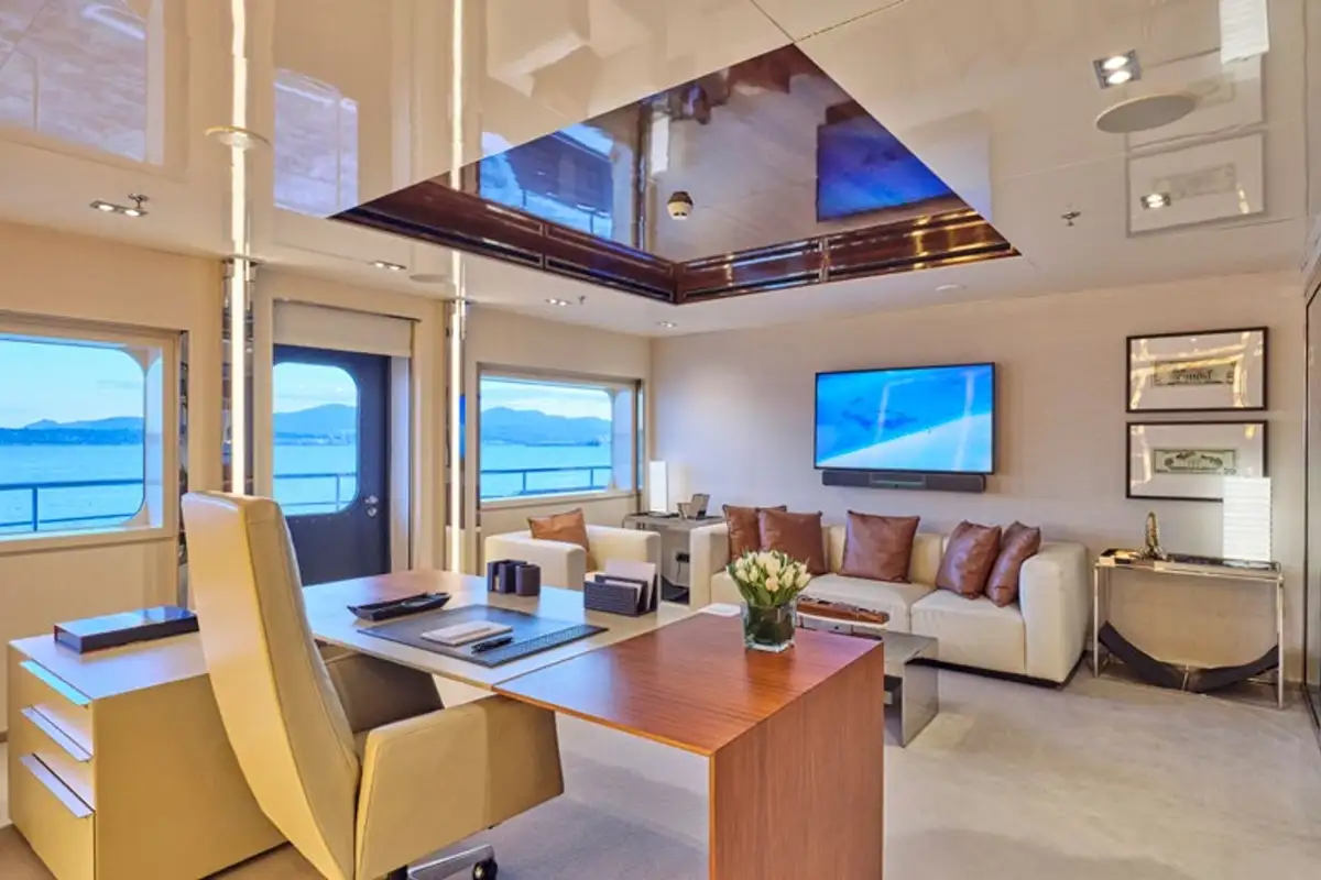 She has an extraordinary amount of exterior deck space for relaxing and enjoying life on board. On the sun deck there is a large jacuzzi surrounded by sun pads and sun loungers as well as a lounge area aft. The master deck has a large terrace aft with abundant seating around the edges and a private dining table for 10 guests. The upper deck aft has a variety of seating areas for open air dining and snacking during the day and there is another lounge area on the main deck aft.