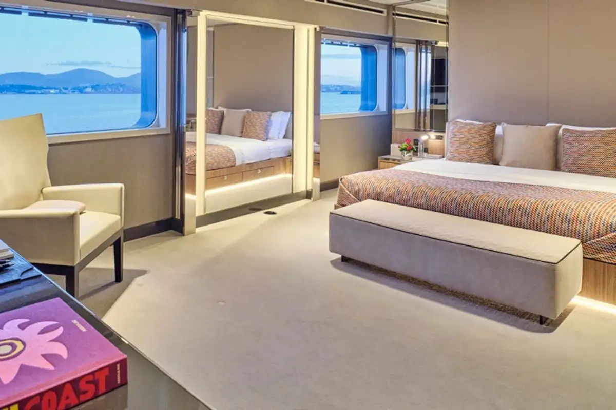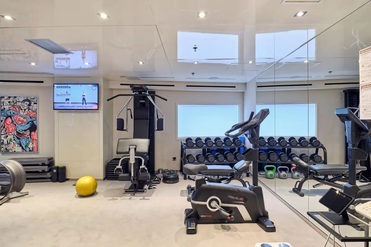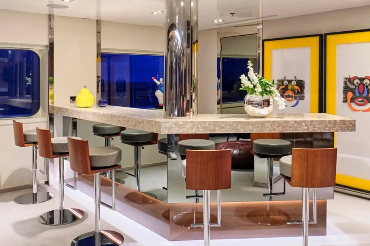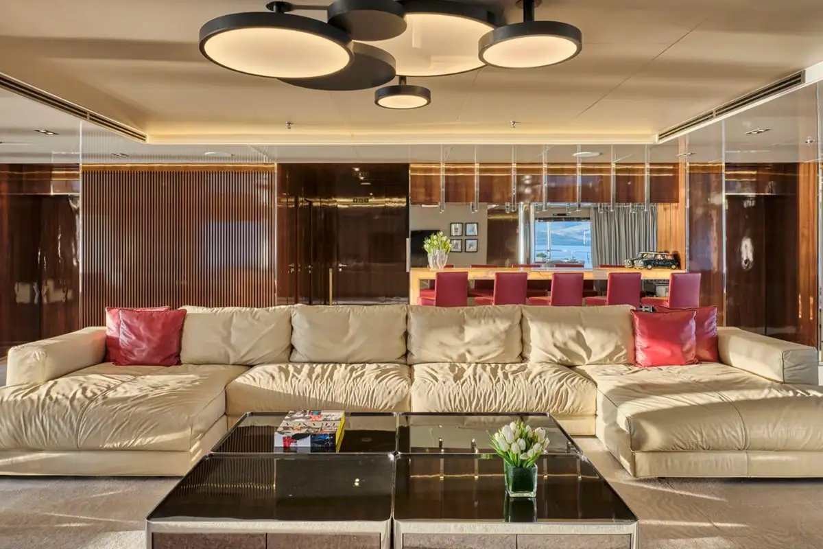 There are large windows on the main deck that give a panoramic view in the formal dining area as well as an abundance of natural light. The dining area is complemented by a large central bar. Notable features on MARQUISE are the large well equipped gym, cinema, massage room and beauty salon, beach club, sauna.