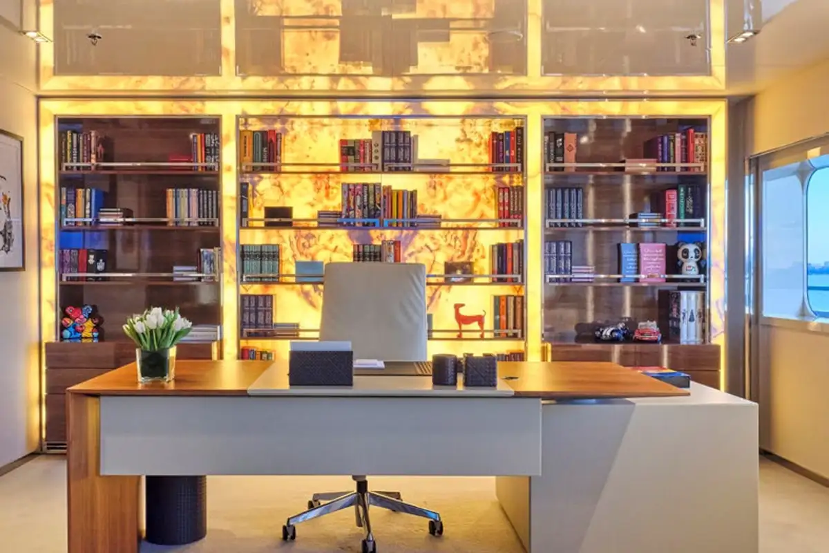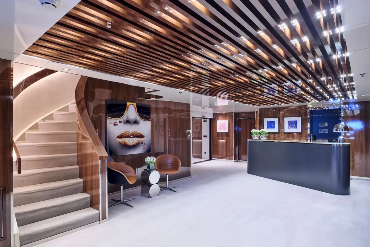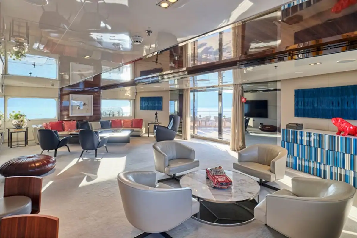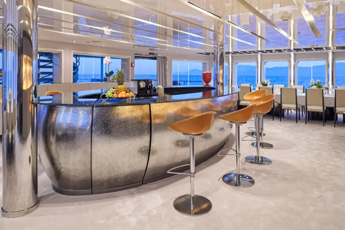 There are large windows on the main deck that give a panoramic view in the formal dining area as well as an abundance of natural light. The dining area is complemented by a large central bar. Notable features on MARQUISE are the large well equipped gym, cinema, massage room and beauty salon, beach club, sauna.
