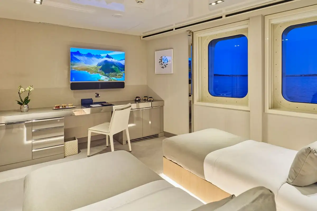 Extensive accommodation is one of the main features of this voluminous superyacht. MARQUISE offers accommodation for 28 guests plus 2 staff across 14 spacious cabins and 1 staff cabin with a single + upper berth.