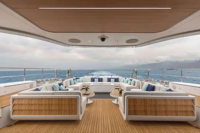 Dining is a highlight on any charter, and with three dedicated dining areas, it is on board MAVERICK, too. The formal dining area in the main lounge is perfect for birthdays and banquets. With views and air-conditioned comfort, nothing will interrupt your special occasion. The upper aft deck is a favourite for breakfast; gather in the sky lounge and proceed to a wonderful breakfast spread or buffet. For lunch, the sun deck beckons. The al fresco dining area is between the jacuzzi and the al fresco lounge area to the rear. Some guests might not leave the sundeck; after all, with exercise equipment and an outdoor cinema, this deck offers so much.