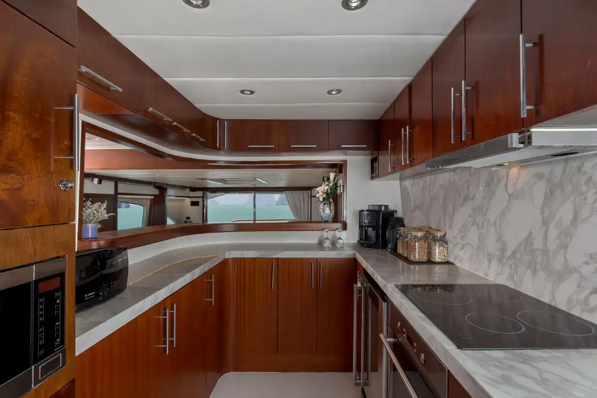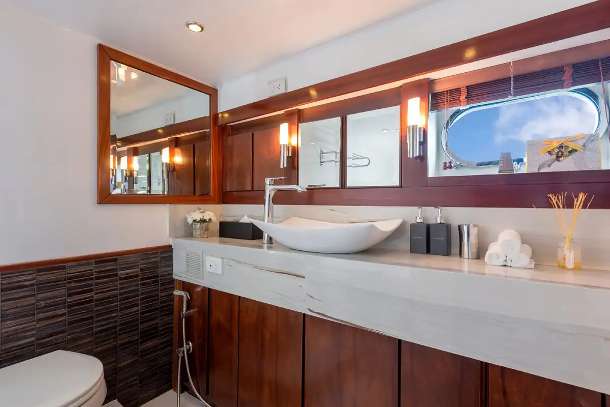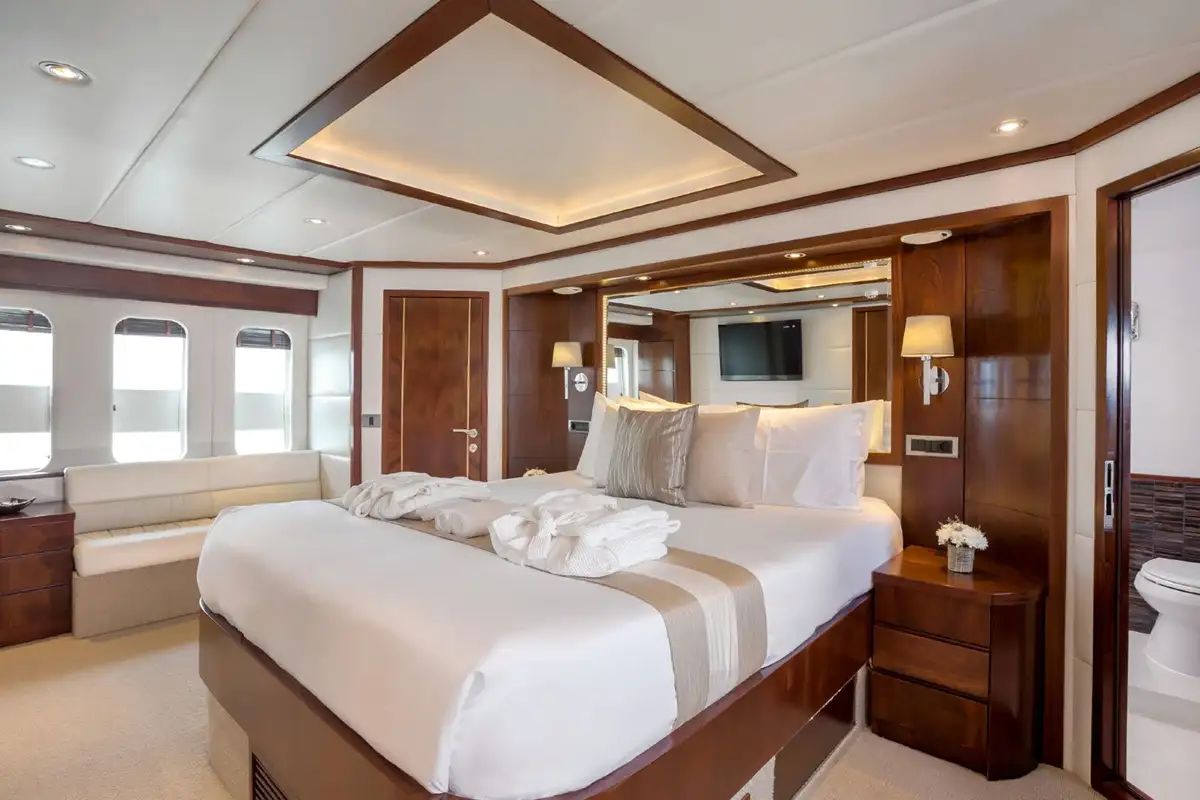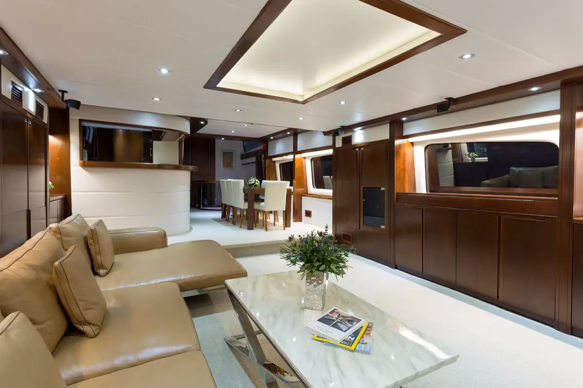 Time spent on board is luxurious and comfortable with a very spacious saloon, two full beam master staterooms and two twin staterooms perfect for mixed groups and families. Her interior design is light and bright with natural décor throughout showing her in immaculate condition. The hub of the yacht can be found on the sun deck with an al fresco dining area, jacuzzi and a bar with a high tech sound system, great for entertaining or simply relaxing with ambient music and a nice chilled drink.