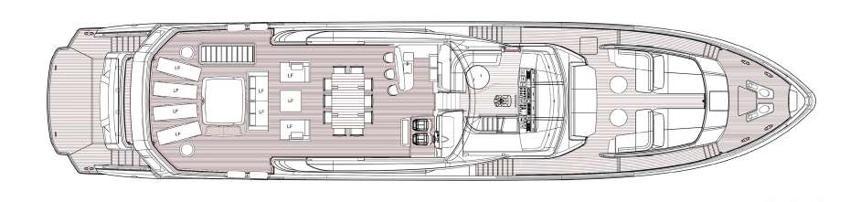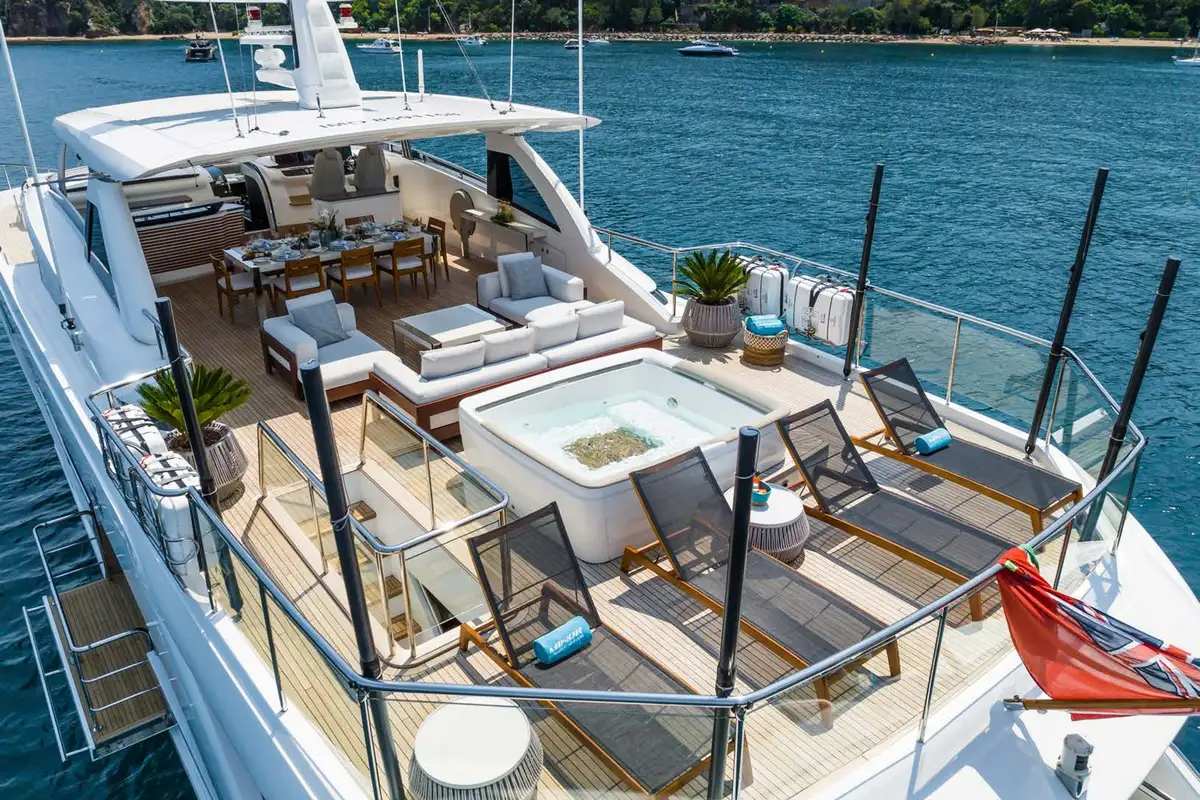 With a notably spacious sundeck, the big foredeck lounge and an easy flow between the main deck aft and the saloon, she’s also ideal for hosting a large gathering of up to 45 people when moored alongside a harbour quay. And for smaller gatherings at sea, the sundeck is an excellent place to socialise and celebrate with dining, lounge and sunbathing zones as well as the big, square jacuzzi pool.