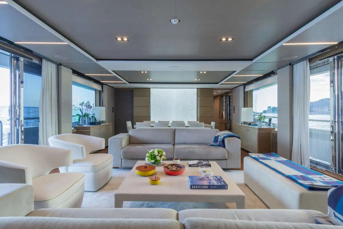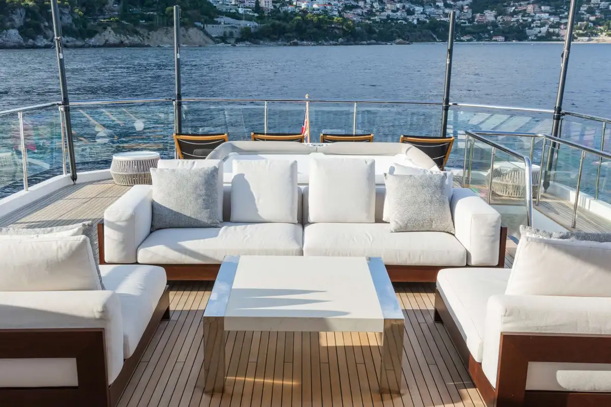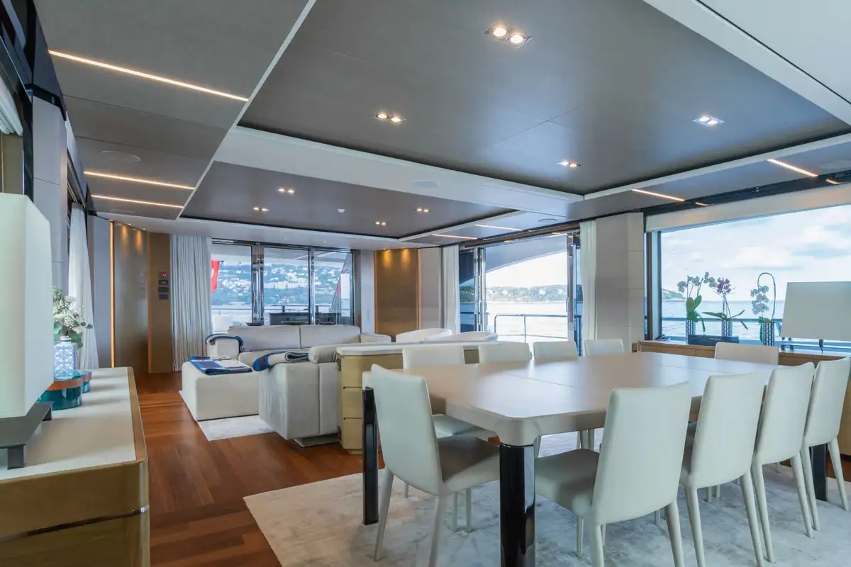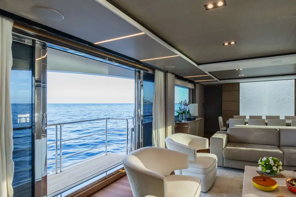 A fold-out balcony terrace is a great asset for a yacht’s main saloon – and MINOR FAMILY AFFAIR has two. This means that wherever she’s anchored or moored, with an outdoor terrace on each side and another one aft, you will always have privacy and a good view of the sunset. And with the huge floor-to-ceiling glass doors of the saloon wide open on three sides, the yacht’s main living room becomes a glorious inside-outside space with the breeze flowing through.