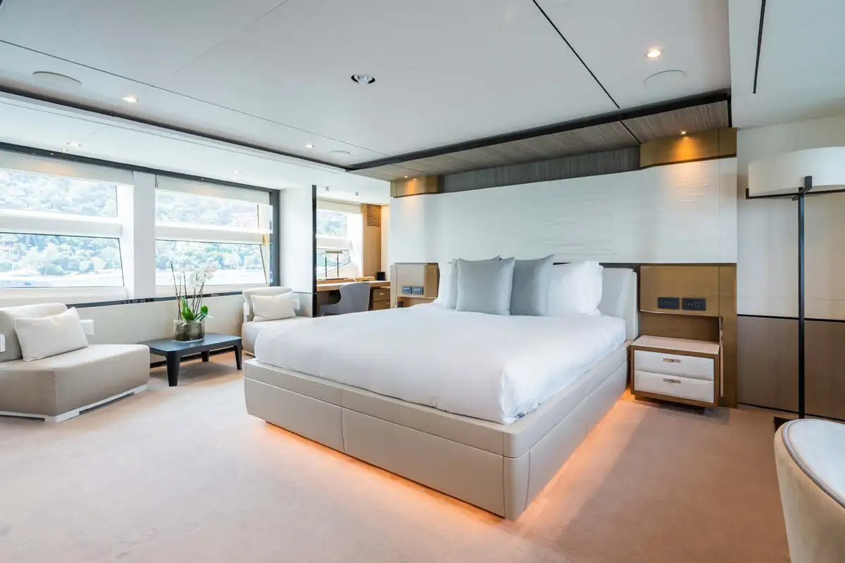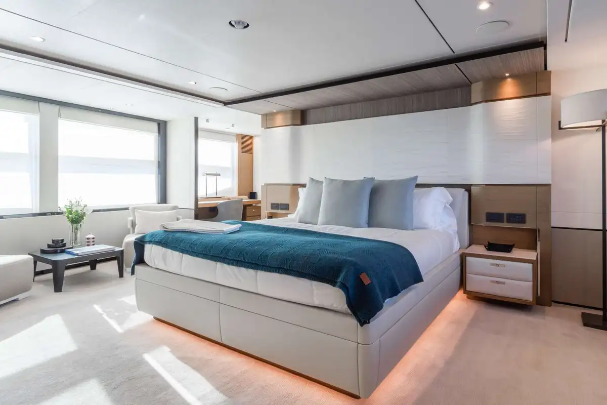 Her bright, smart-casual contemporary styling and superb standard of finish will set the scene perfectly for a romantic getaway. The opulent master suite includes a separate study, two armchairs and a marble bath as well as a shower in its en suite bathroom.