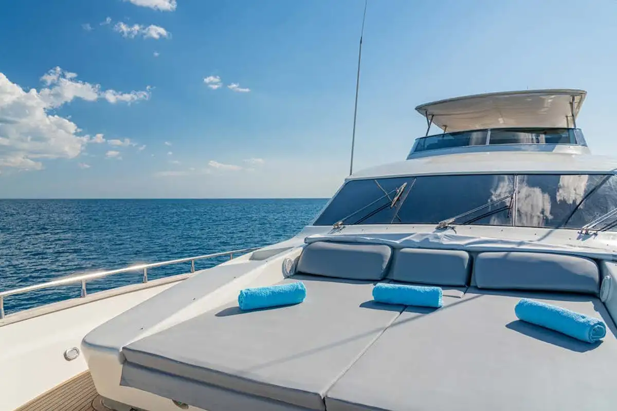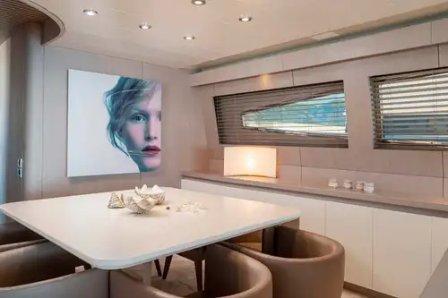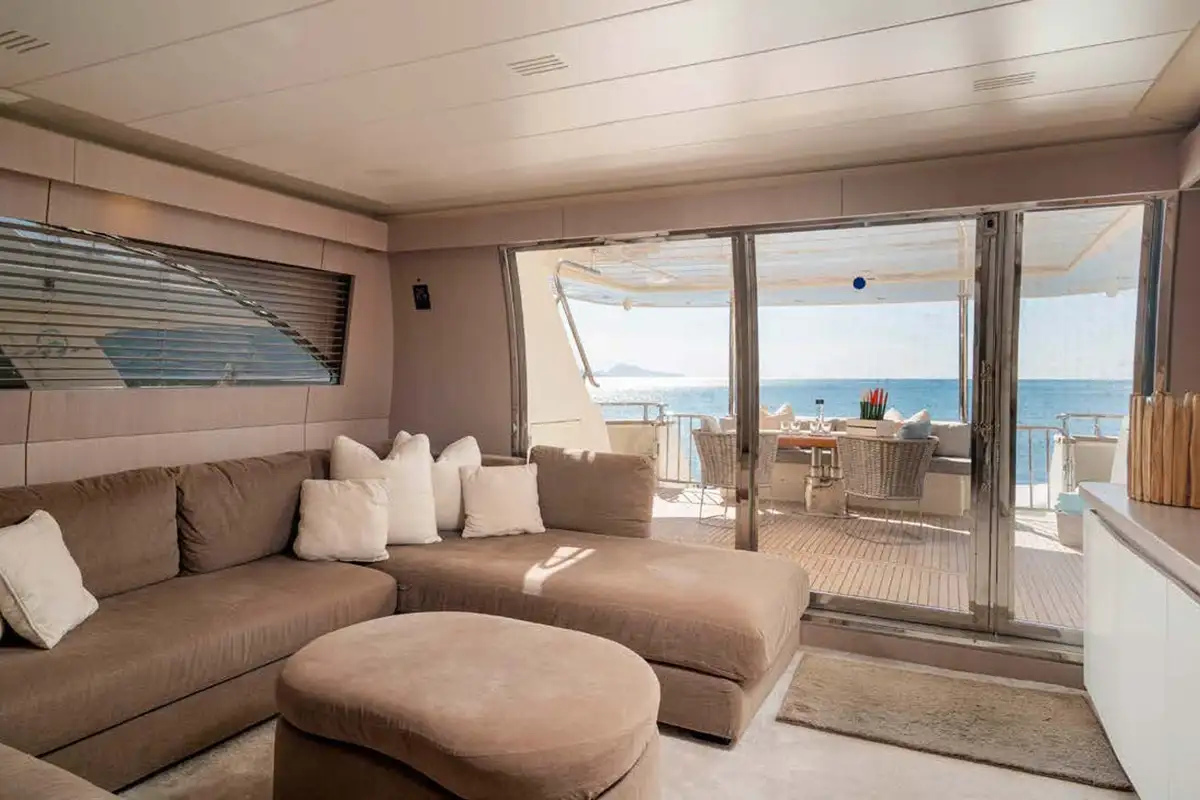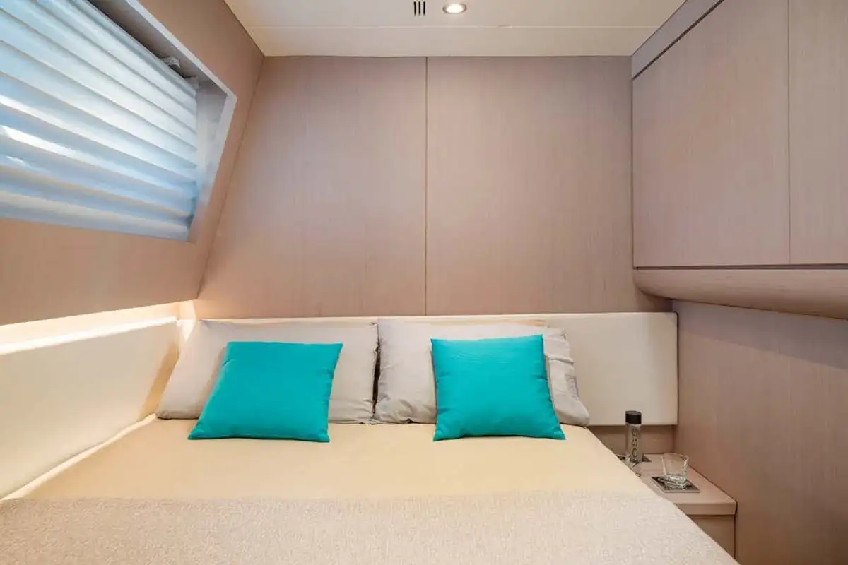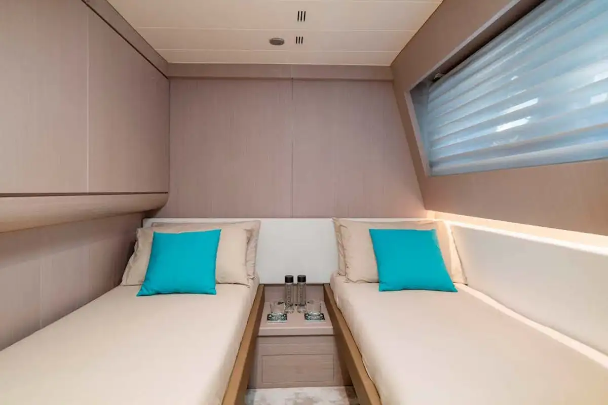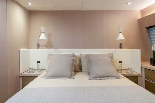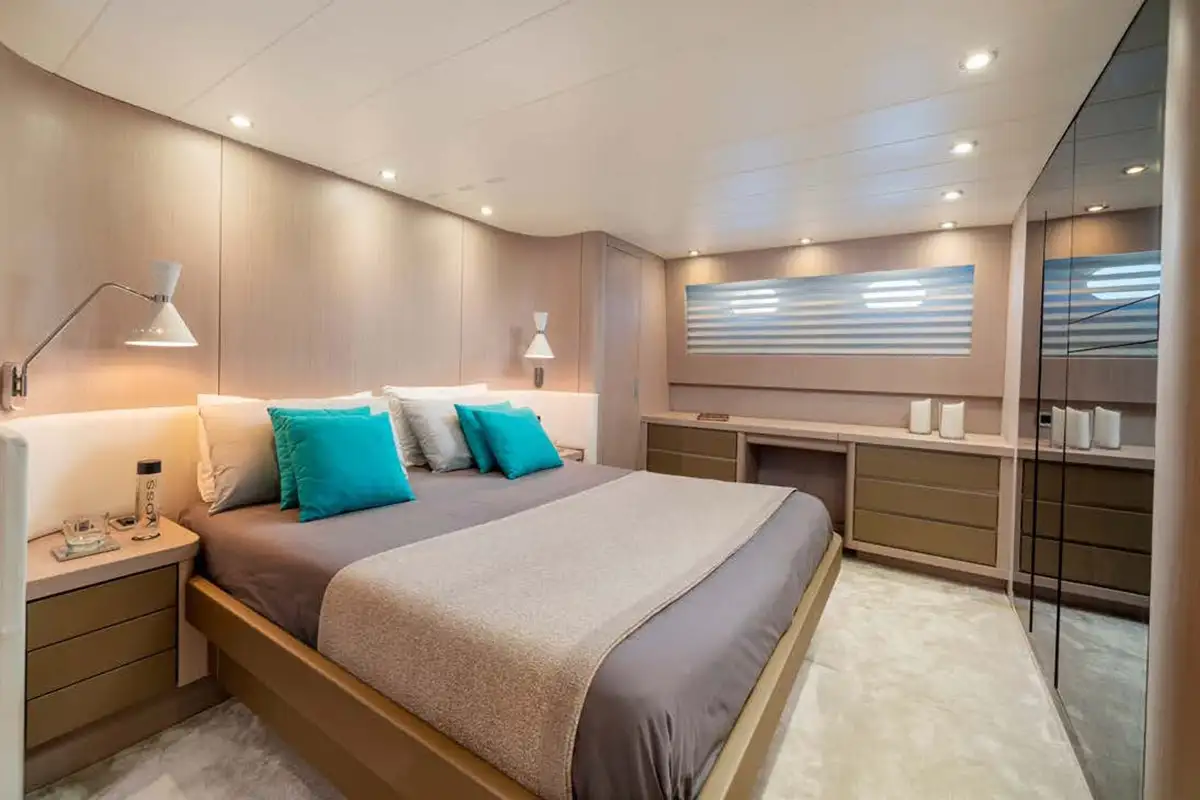 The Canados 86 MINOU has four comfortable cabins to accommodate up to 10 persons. The yacht has a Master cabin with king size bed and a walk-in wardrobe; a VIP cabin with queen size bed and two guest cabins with separate beds and a pullman bed.