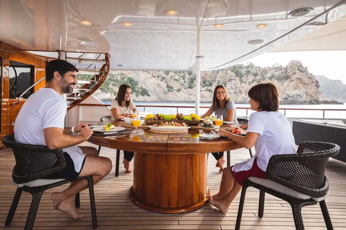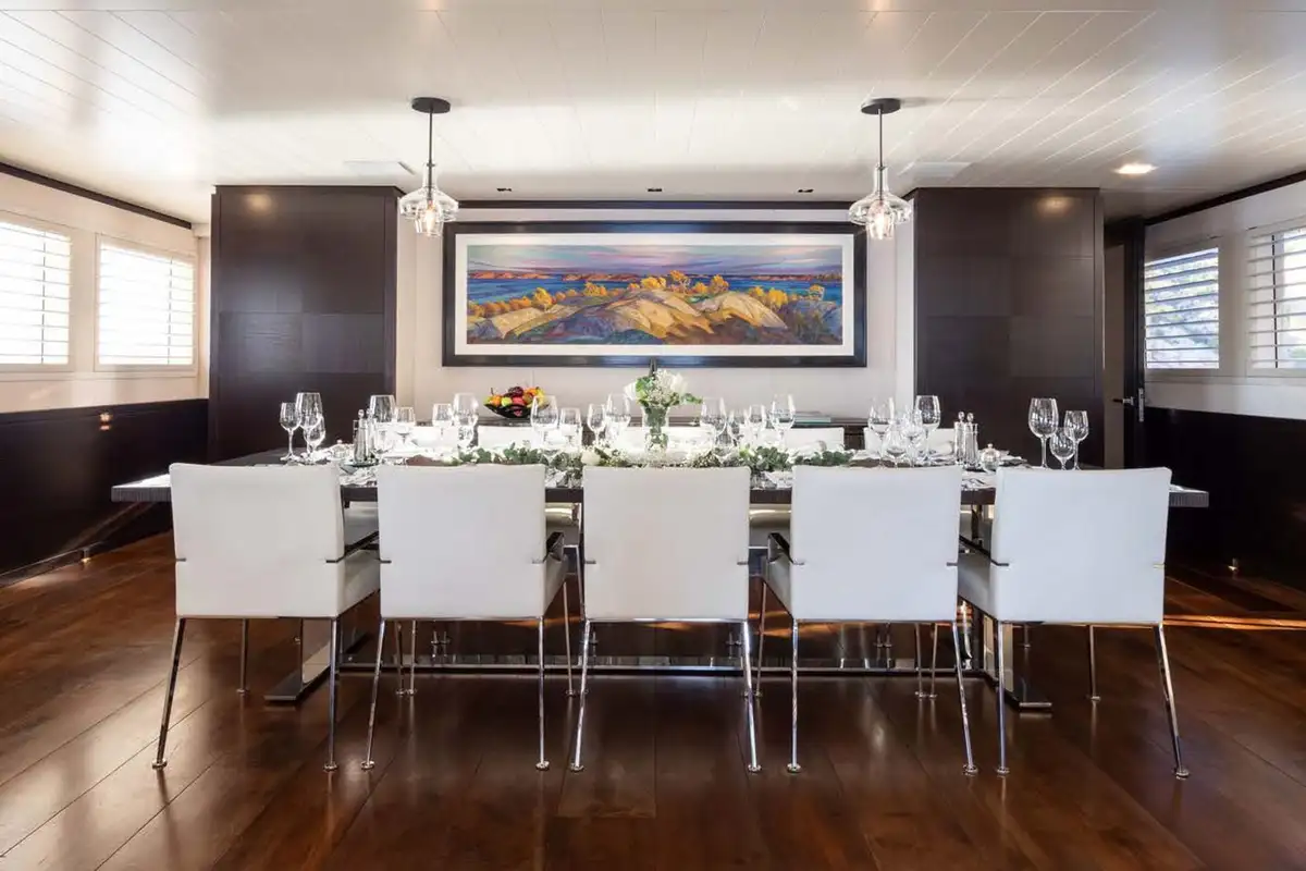 Join your guests for pre-dinner cocktails at the upper deck bar while the chef prepares a delicious dinner for you to enjoy in the formal dining area on the main deck or al fresco on the same deck. After dinner retire to the sky lounge for a movie or simply sit back, relax and share stories from your perfect day aboard MIRAGE.