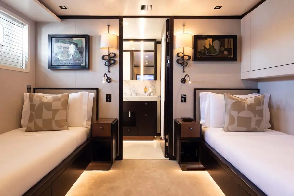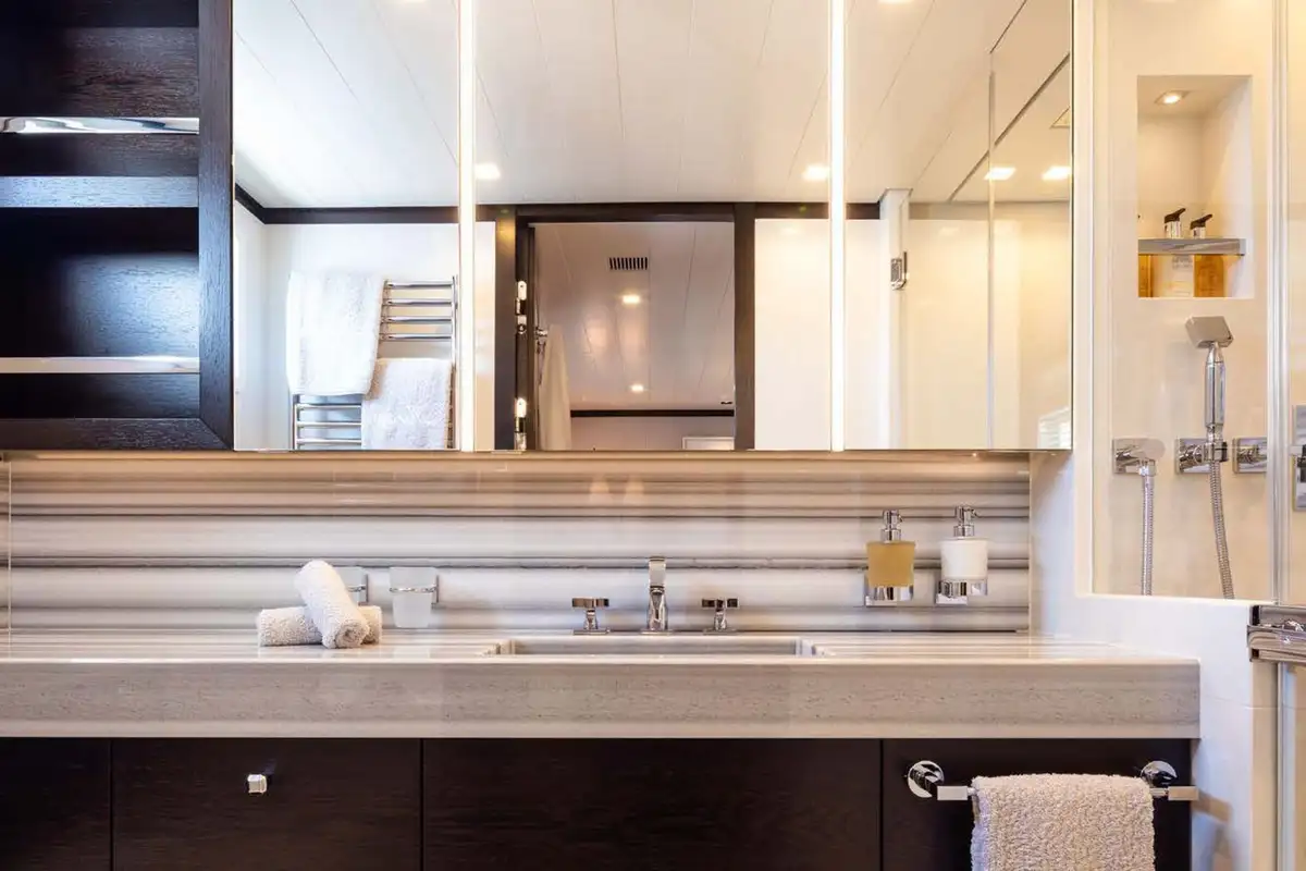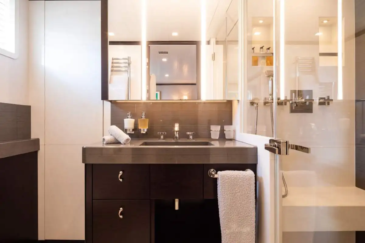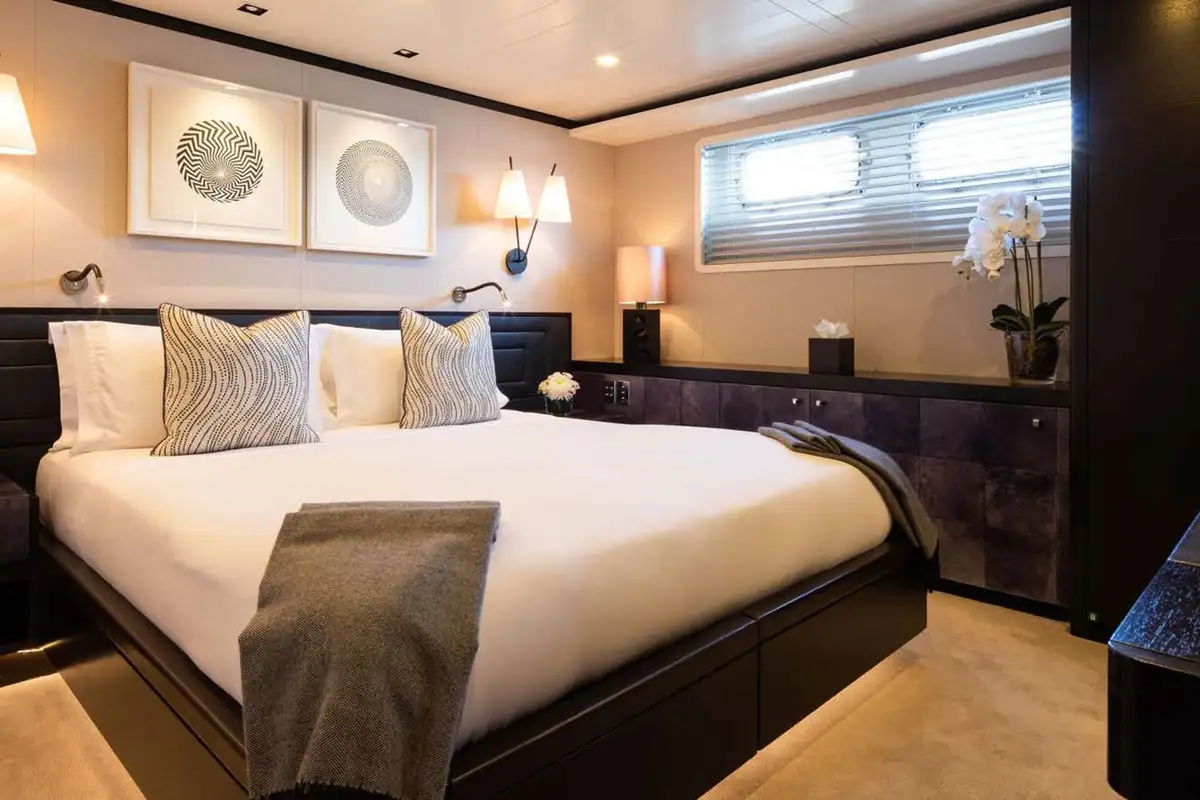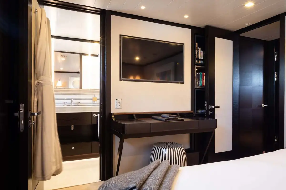 Back on board, freshen up in the yacht’s superb accommodation. Like the rest of the interior areas, the design is clean and contemporary, featuring elegant monochrome colours and Scandinavian furniture offset by an eclectic art collection. The master suite and VIP are both located on the main deck while a further four twin cabins and two double cabins are located on the lower deck, allowing for plenty of choice for a large group of friends or family.