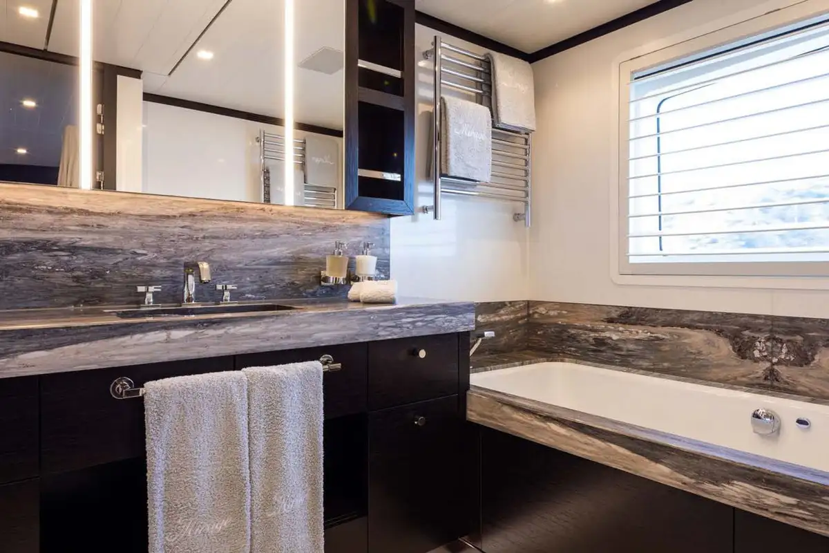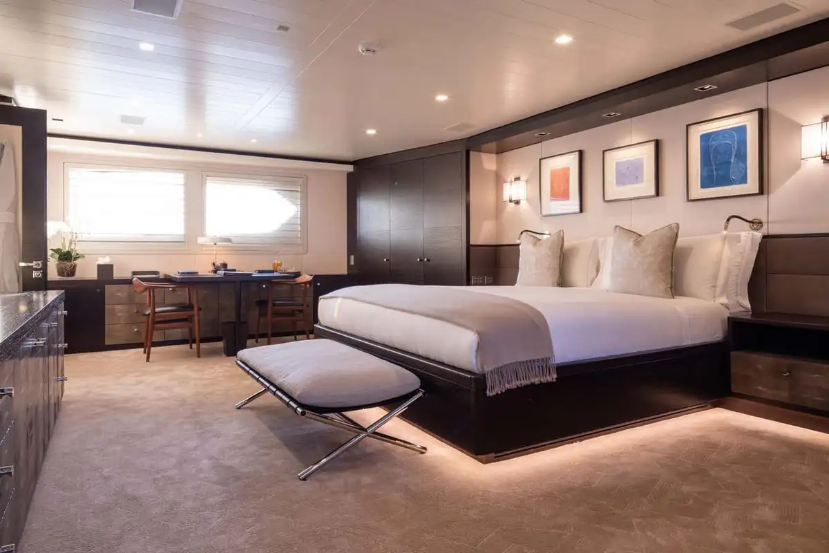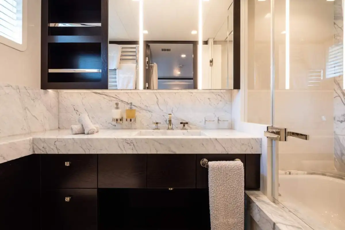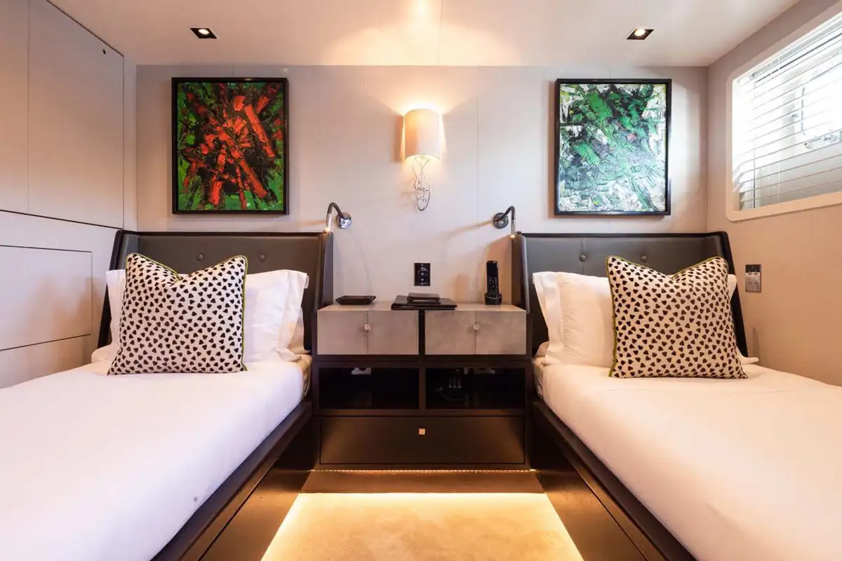 Back on board, freshen up in the yacht’s superb accommodation. Like the rest of the interior areas, the design is clean and contemporary, featuring elegant monochrome colours and Scandinavian furniture offset by an eclectic art collection. The master suite and VIP are both located on the main deck while a further four twin cabins and two double cabins are located on the lower deck, allowing for plenty of choice for a large group of friends or family.