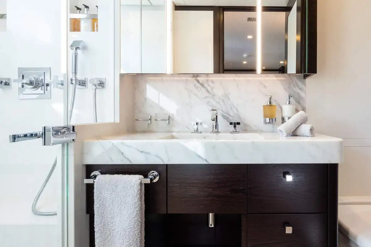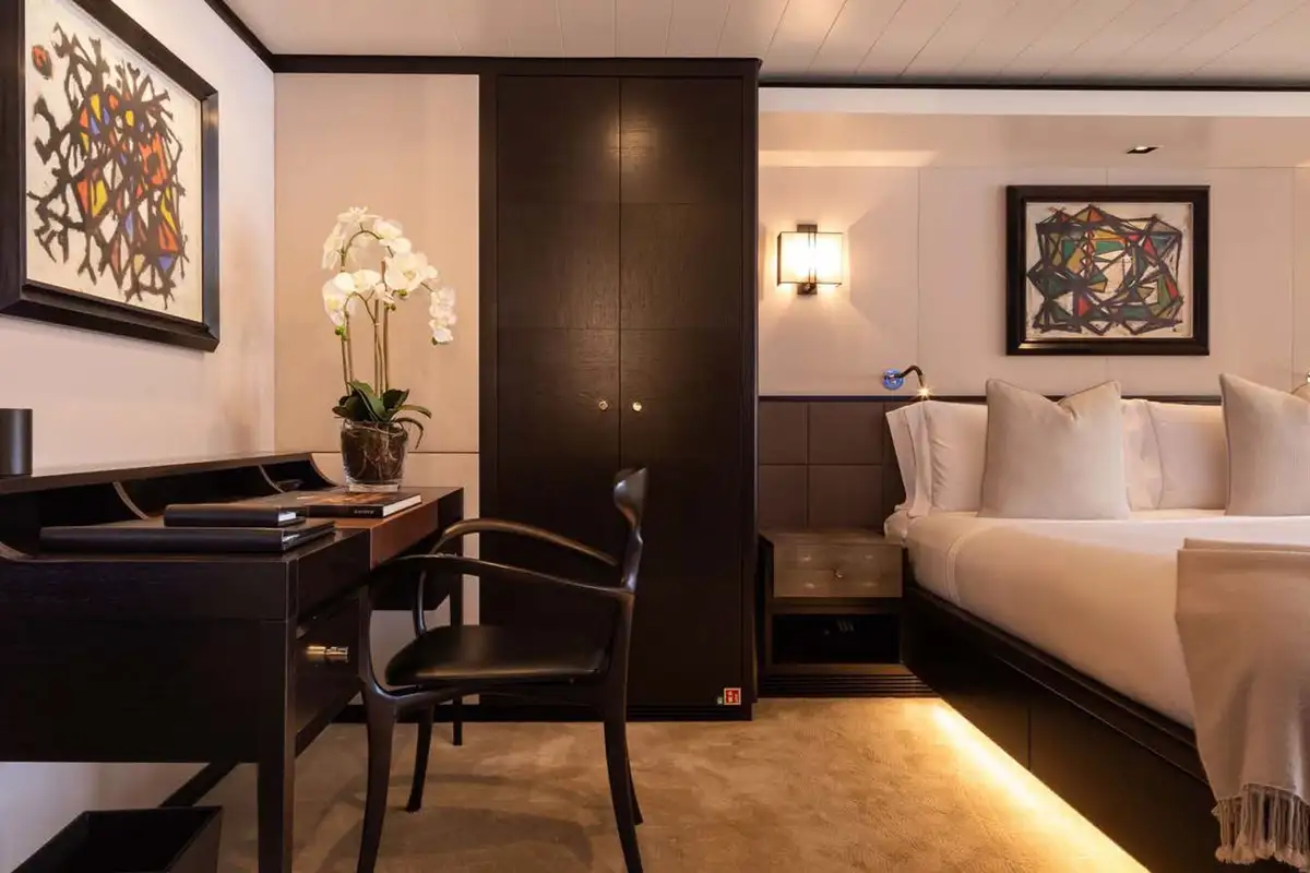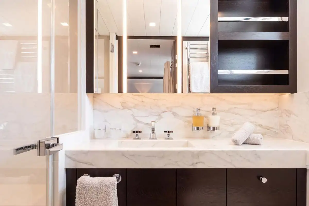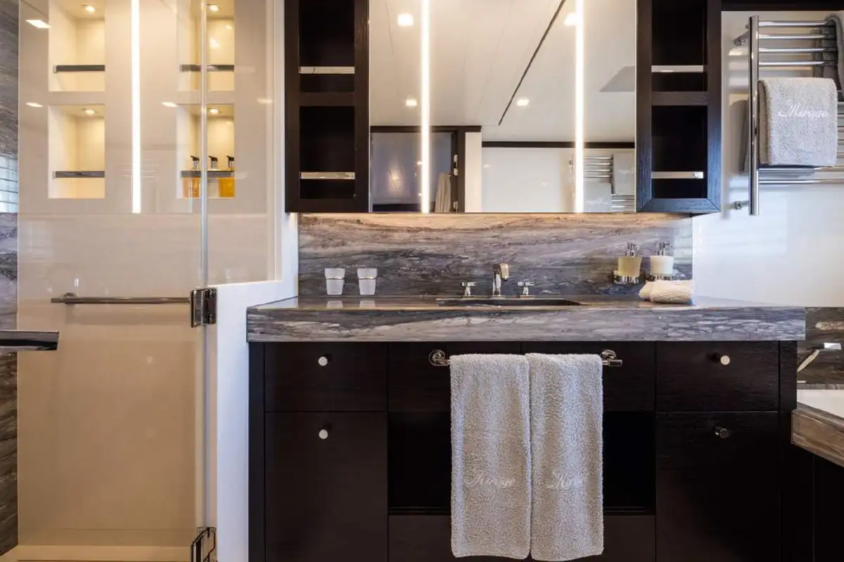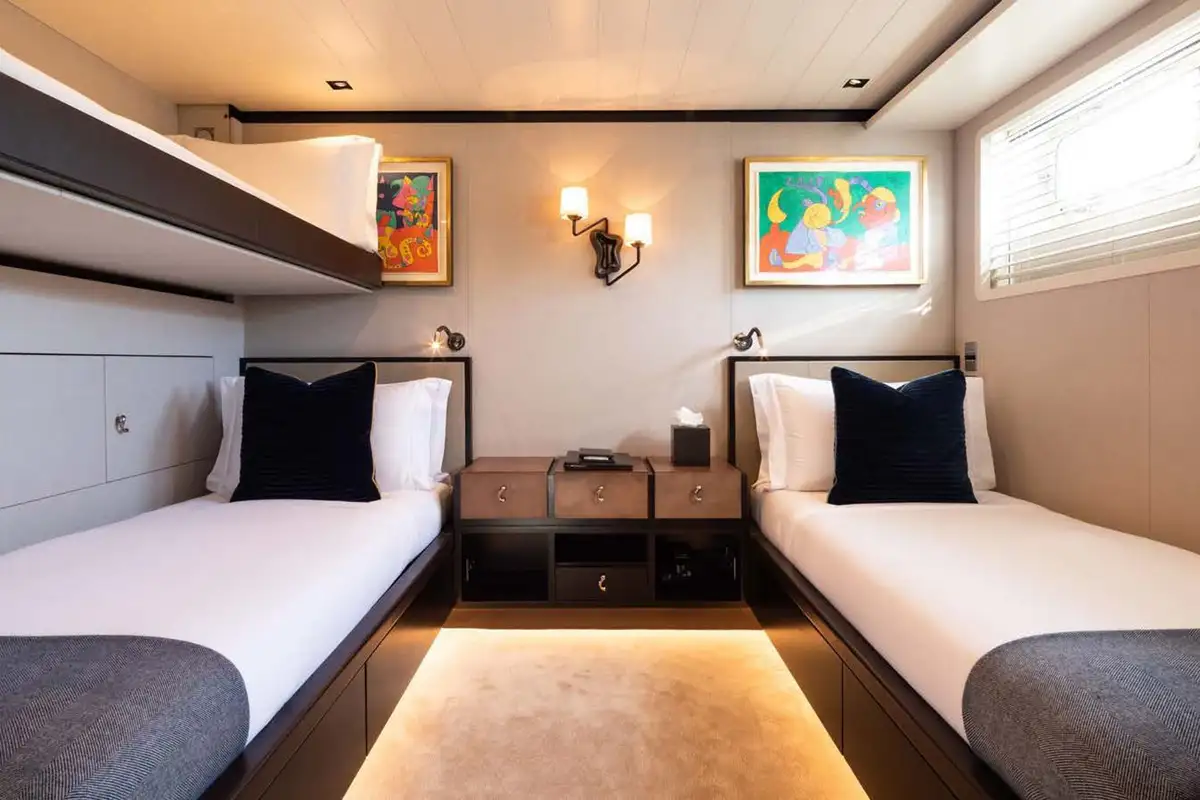 Back on board, freshen up in the yacht’s superb accommodation. Like the rest of the interior areas, the design is clean and contemporary, featuring elegant monochrome colours and Scandinavian furniture offset by an eclectic art collection. The master suite and VIP are both located on the main deck while a further four twin cabins and two double cabins are located on the lower deck, allowing for plenty of choice for a large group of friends or family.