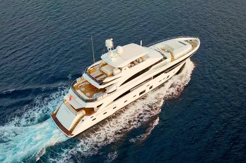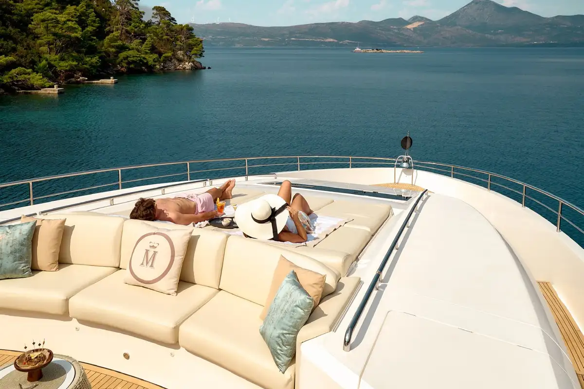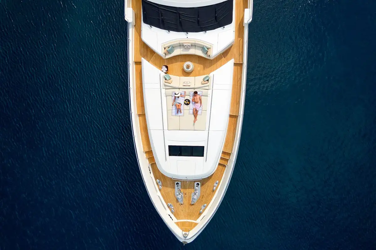 MIRAGE IV is a striking 40m motor yacht built by Princess in 2017, offering a seamless blend of British craftsmanship, performance, and luxury. With beautifully proportioned decks designed for effortless indoor/outdoor living, she’s the ideal setting for an unforgettable Mediterranean charter. Her semi-displacement hull ensures smooth cruising even at speed, with a comfortable cruising pace of 21 knots and a top speed of 23.