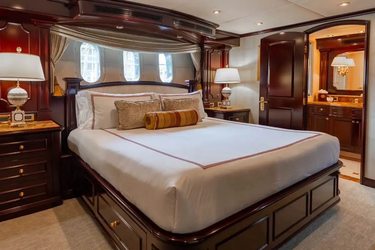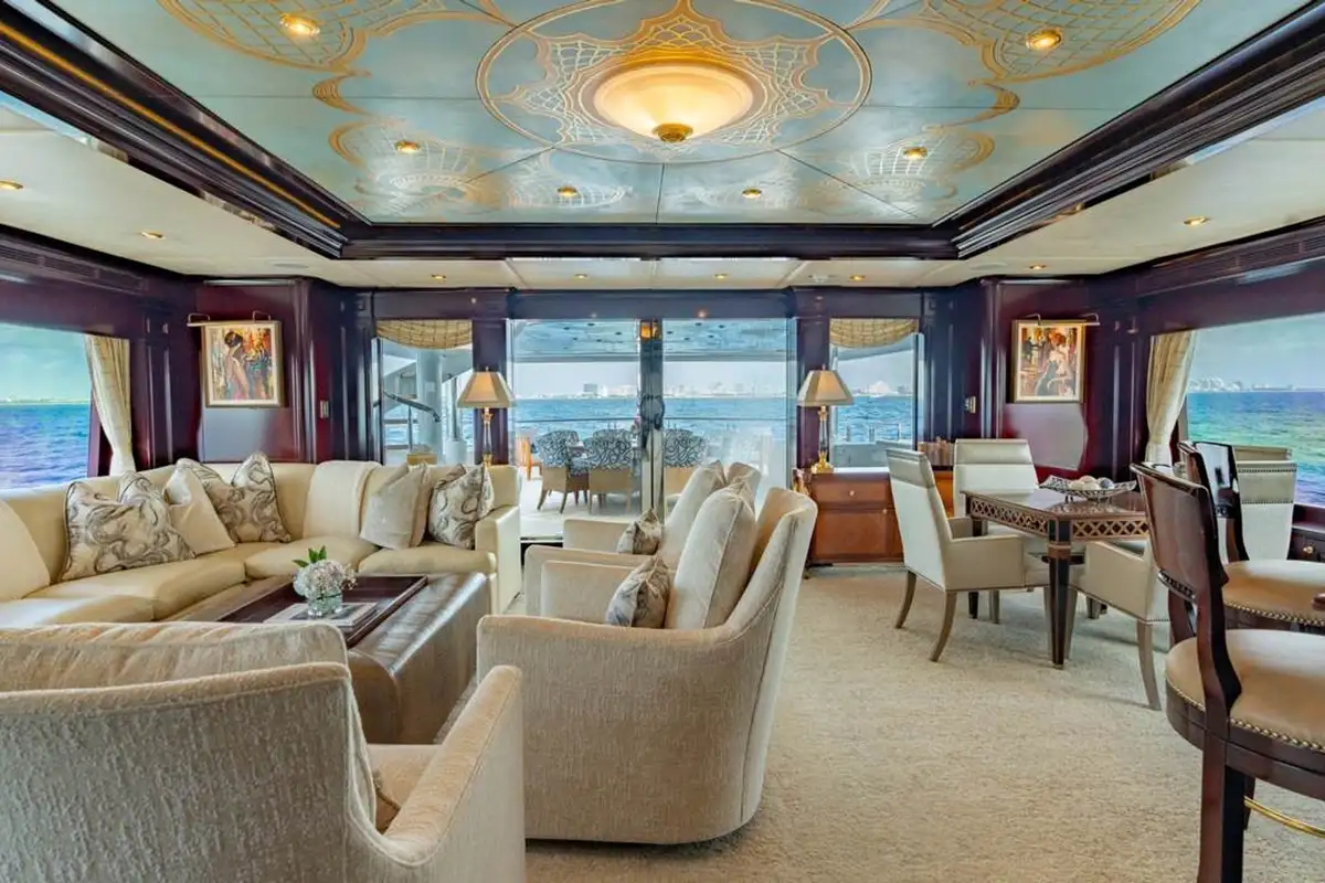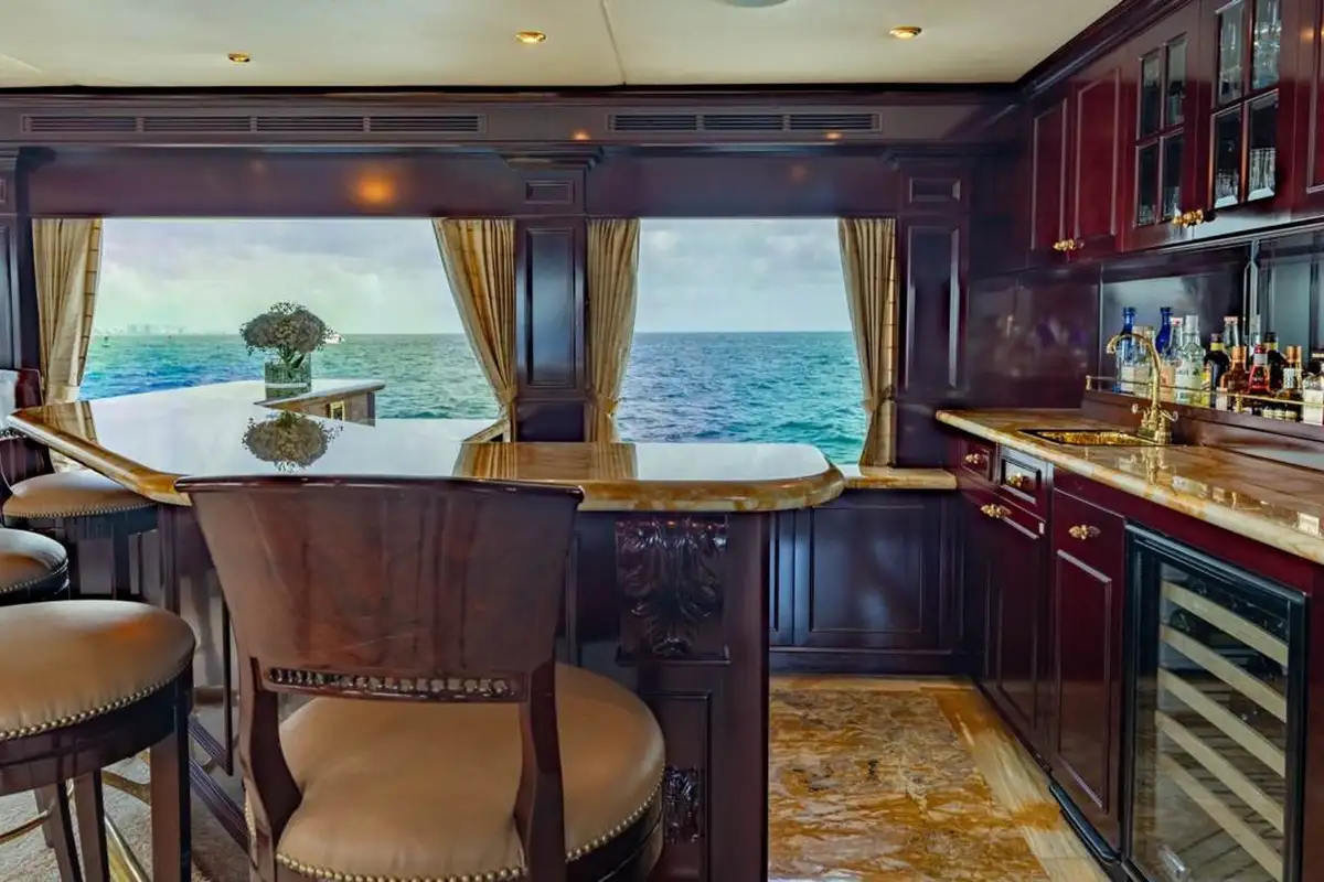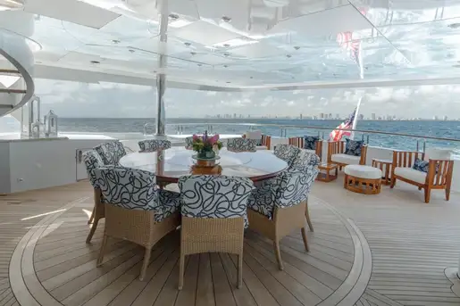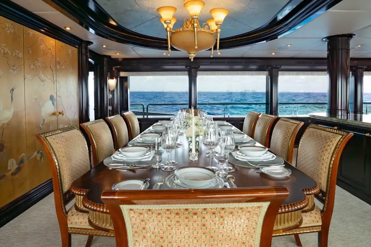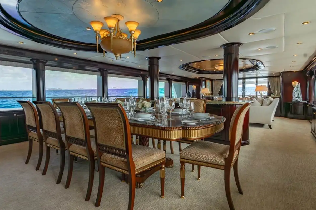 Huge picture windows in the elevated sky lounge and the large, open-plan main lounge flood these spaces with natural light, giving great views out from everywhere inside. Forward of its bar and spacious lounge, the main saloon’s formal dining area seats ten guests in grand style around an intricately crafted table.