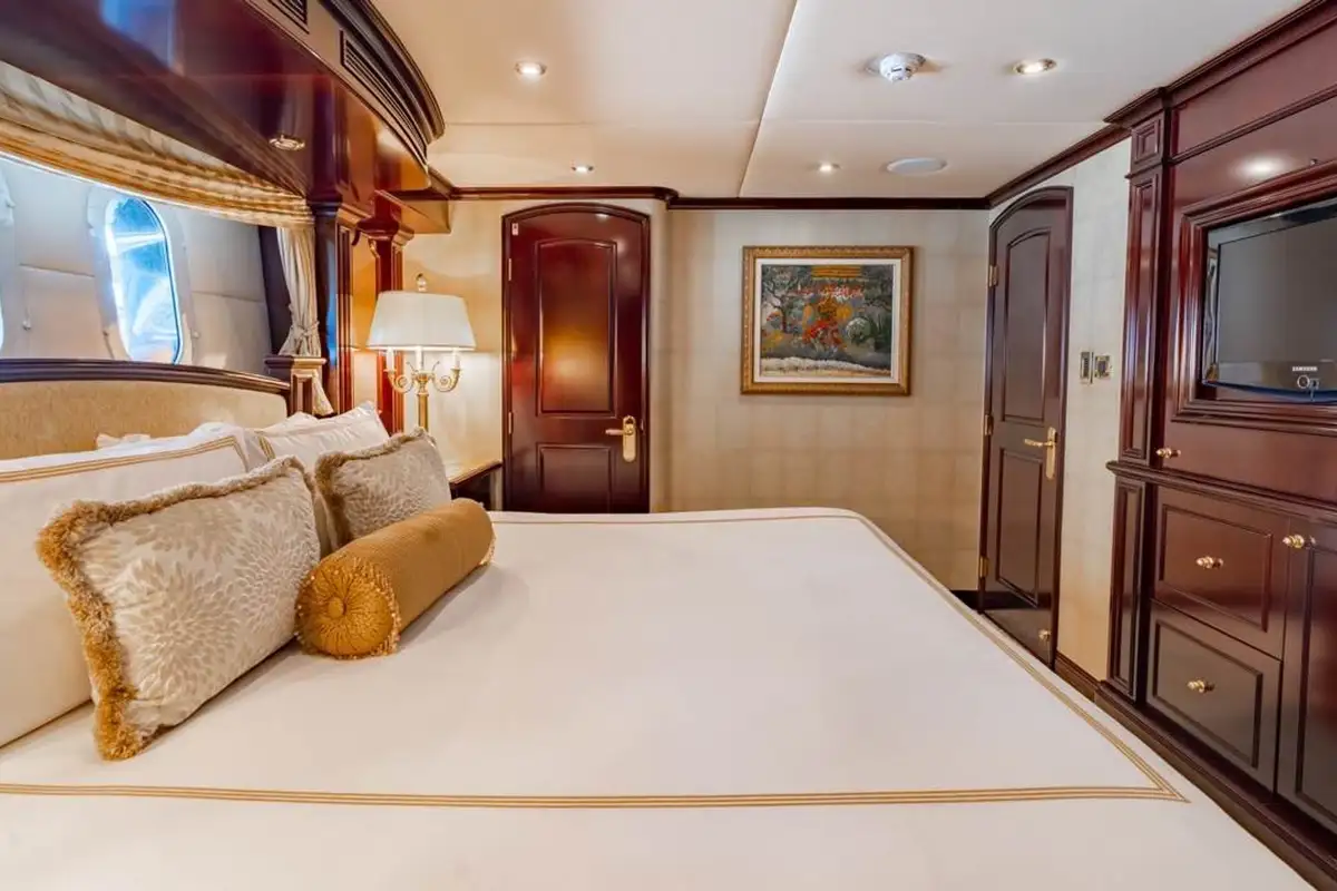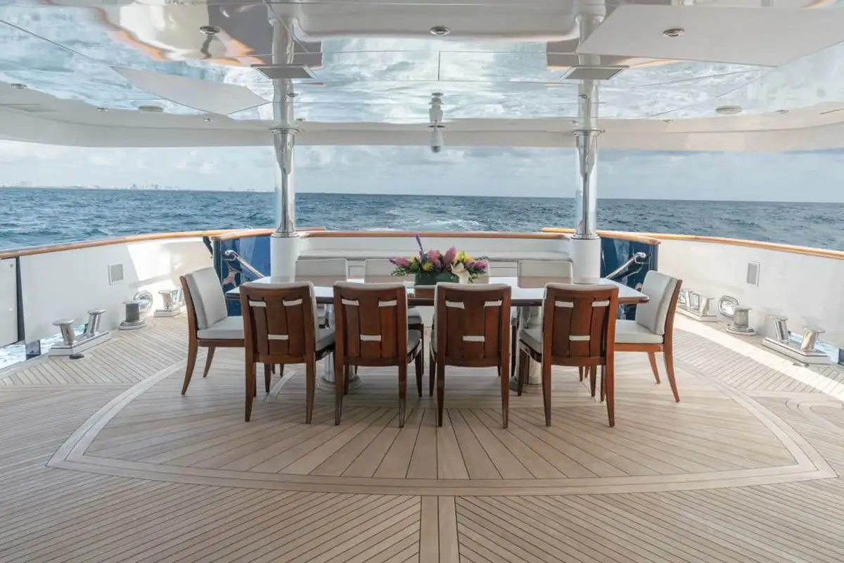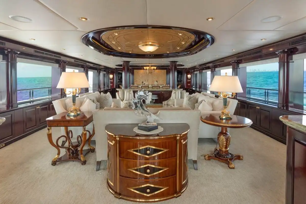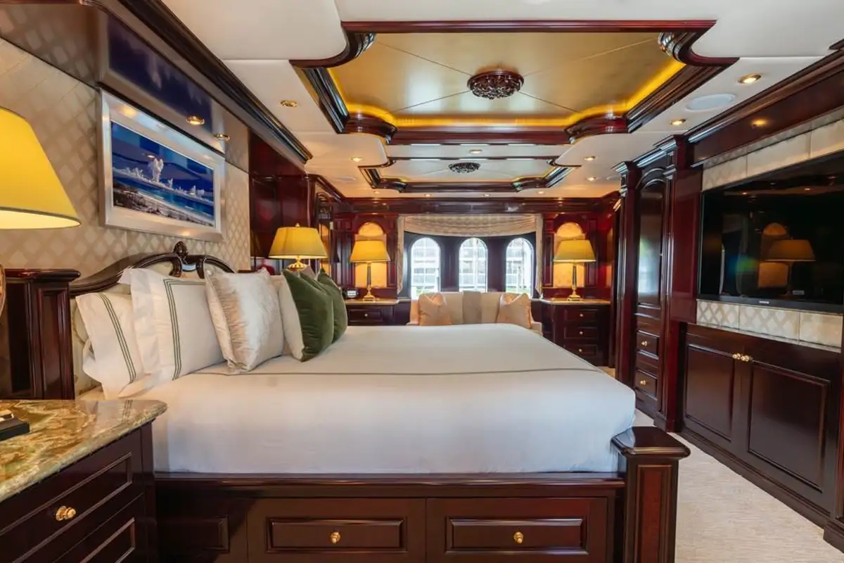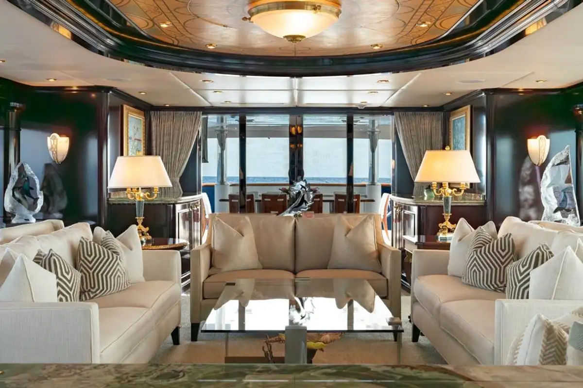 Huge picture windows in the elevated sky lounge and the large, open-plan main lounge flood these spaces with natural light, giving great views out from everywhere inside. Forward of its bar and spacious lounge, the main saloon’s formal dining area seats ten guests in grand style around an intricately crafted table.