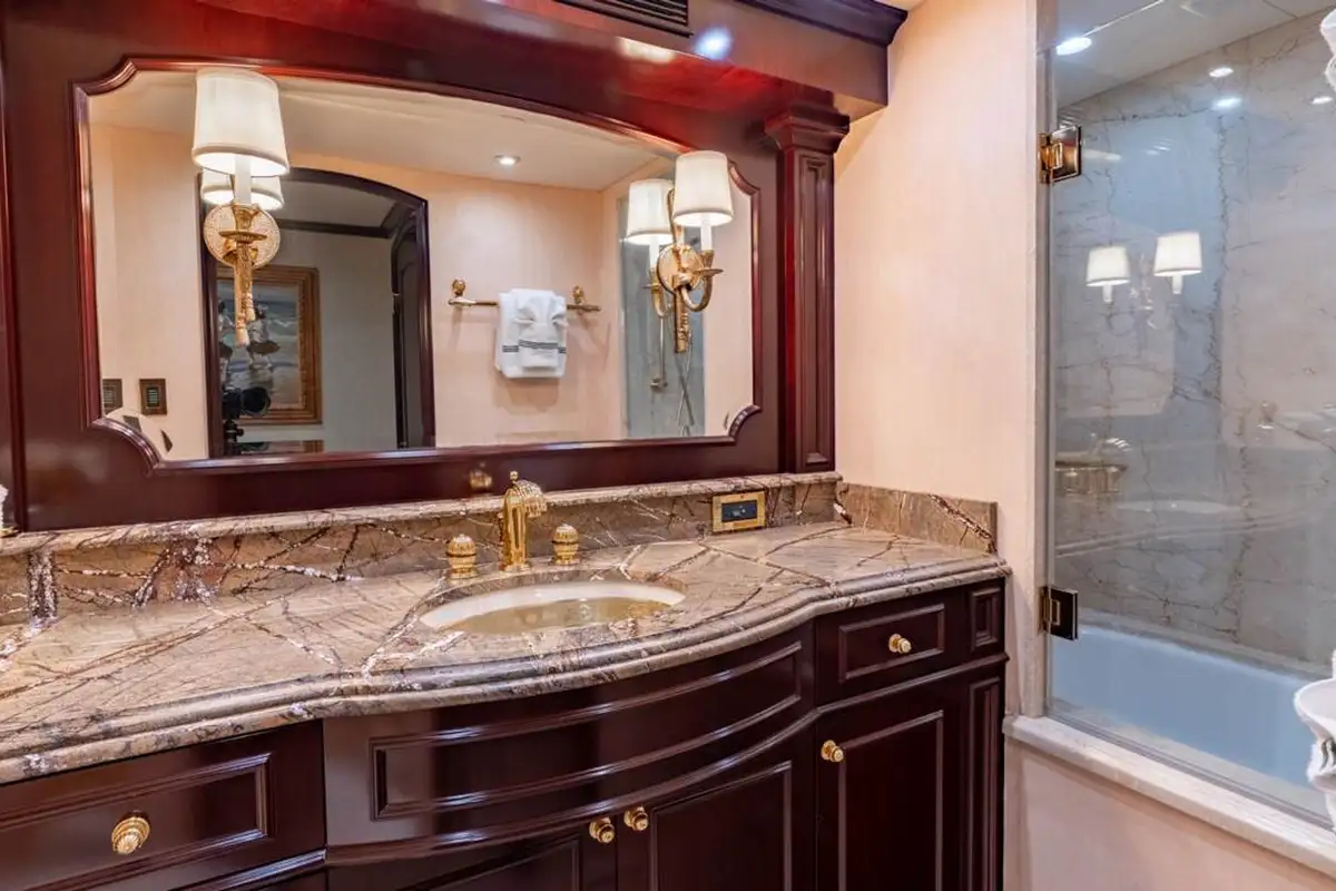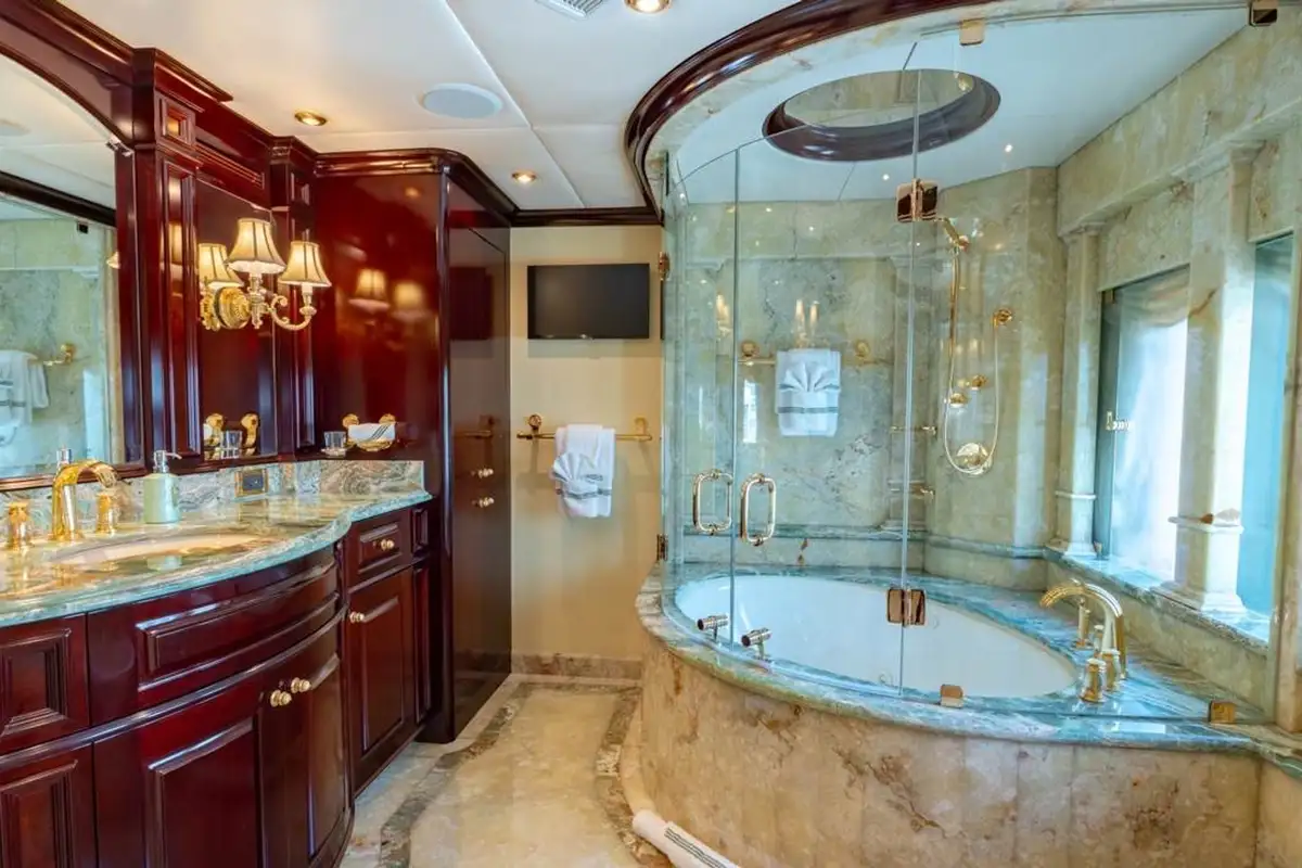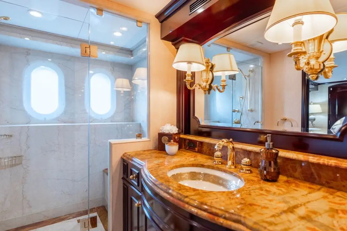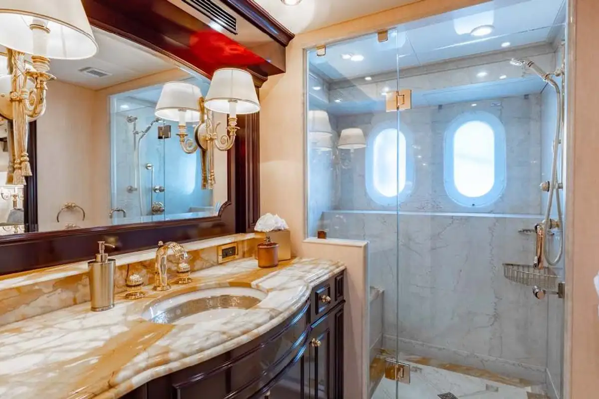 The full-beam master suite up front on the main deck is generously sized – even more so than the rest of the yacht – with a separate owner’s office, two big walk-in closets, silk sofas and armchairs, a 55-inch Samsung TV with Denon surround sound, a wet bar, ice maker and two impressive marble bathrooms, one with a shower, the other with a bathtub. The four other guest cabins are all located amidships on the lower deck: one VIP double, two large doubles and a twin cabin, all decorated in a similar style to the master suite and well-appointed with entertainment centres, TV screens and private en suite bathrooms.